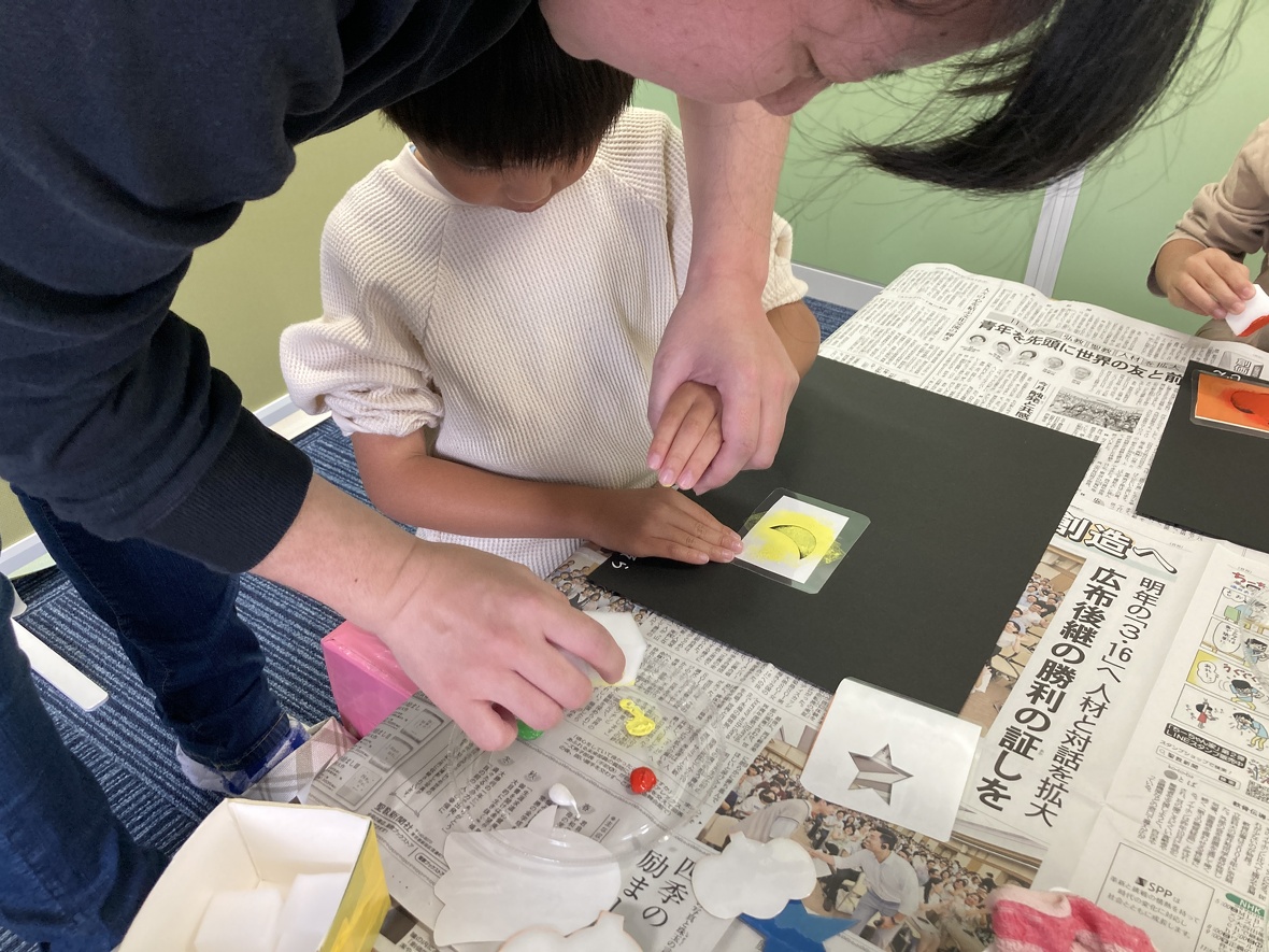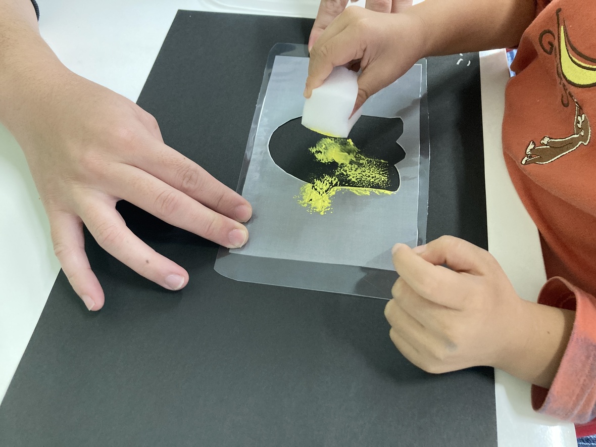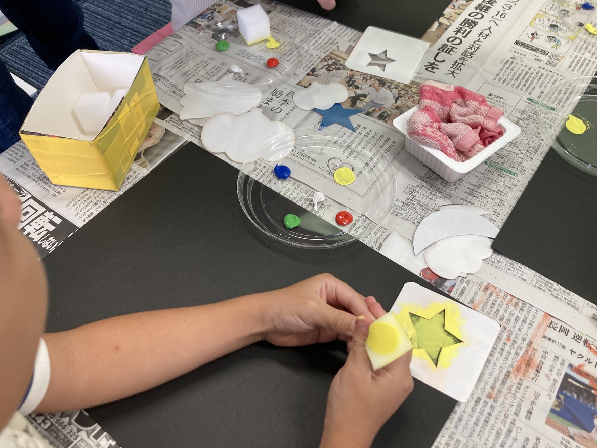2023年10月20日(金) スタッフブログ ”ステンシル”で、ハロウィンの飾りを作りました!! ”かぼちゃ”や”コウモリ”、”おばけ”など、かわいいハロウィンのキャラクターを型紙を使って台紙にプリントしました。同じ型紙でも、色を工夫して、みんなステキな特色のあるできあがりとなりましたよ!!!