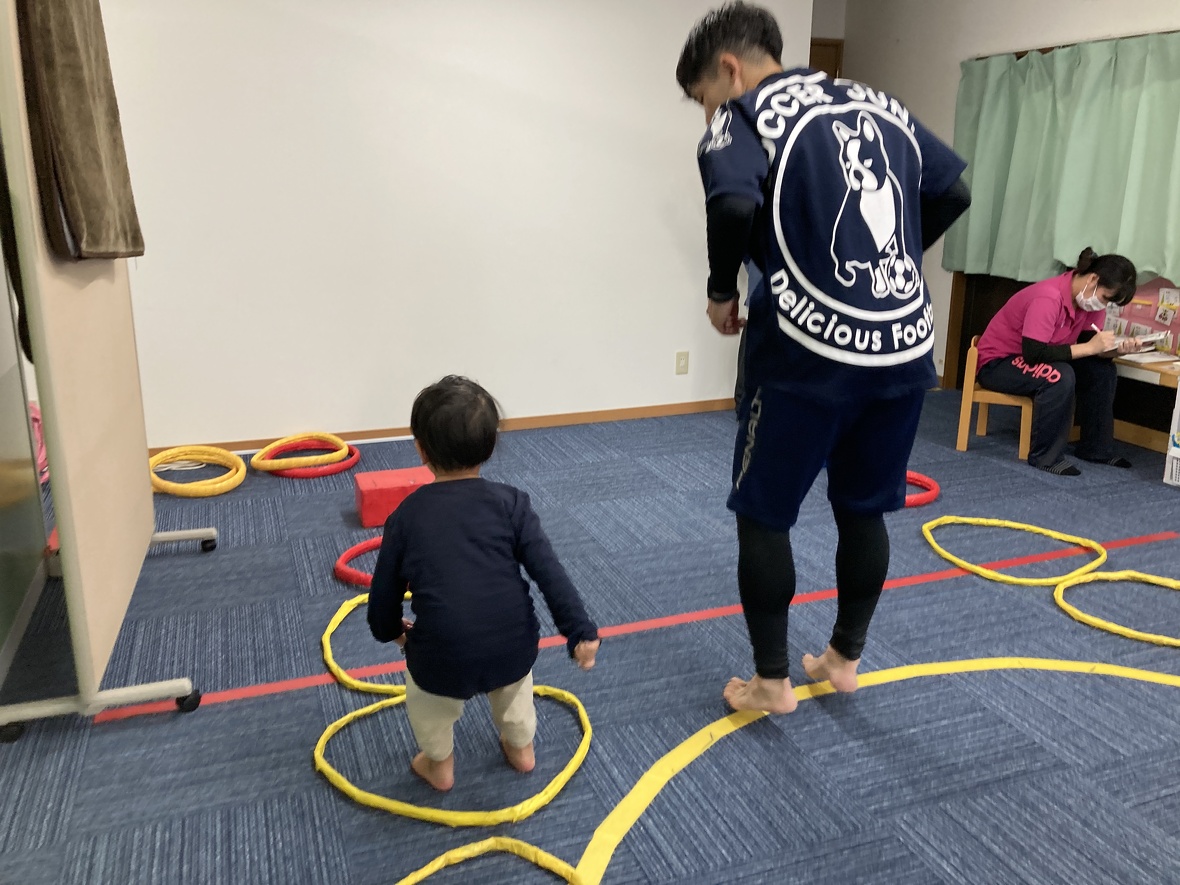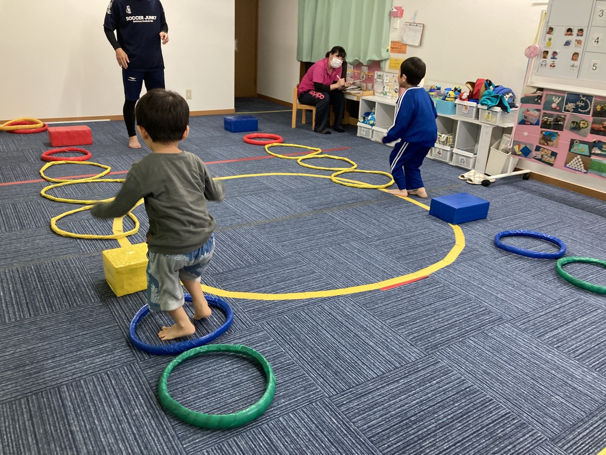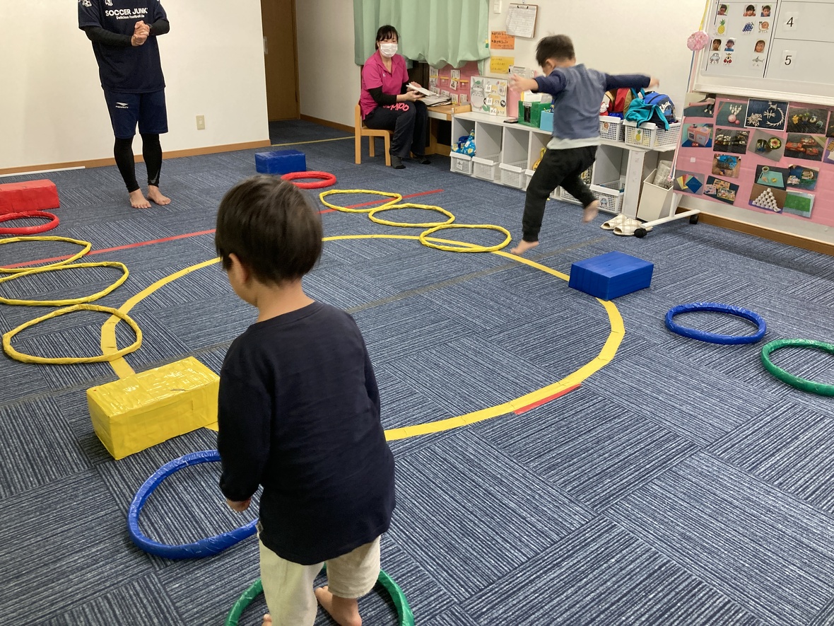 2023年10月27日(金) スタッフブログ タカ先生と”輪っか”でジャンプ!!! タカ先生とフープを使ってジャンプ遊びを行いました。片足、両足、少し離れたところへのジャンプなど、いろいろなバリエーションにチャレンジしました!!