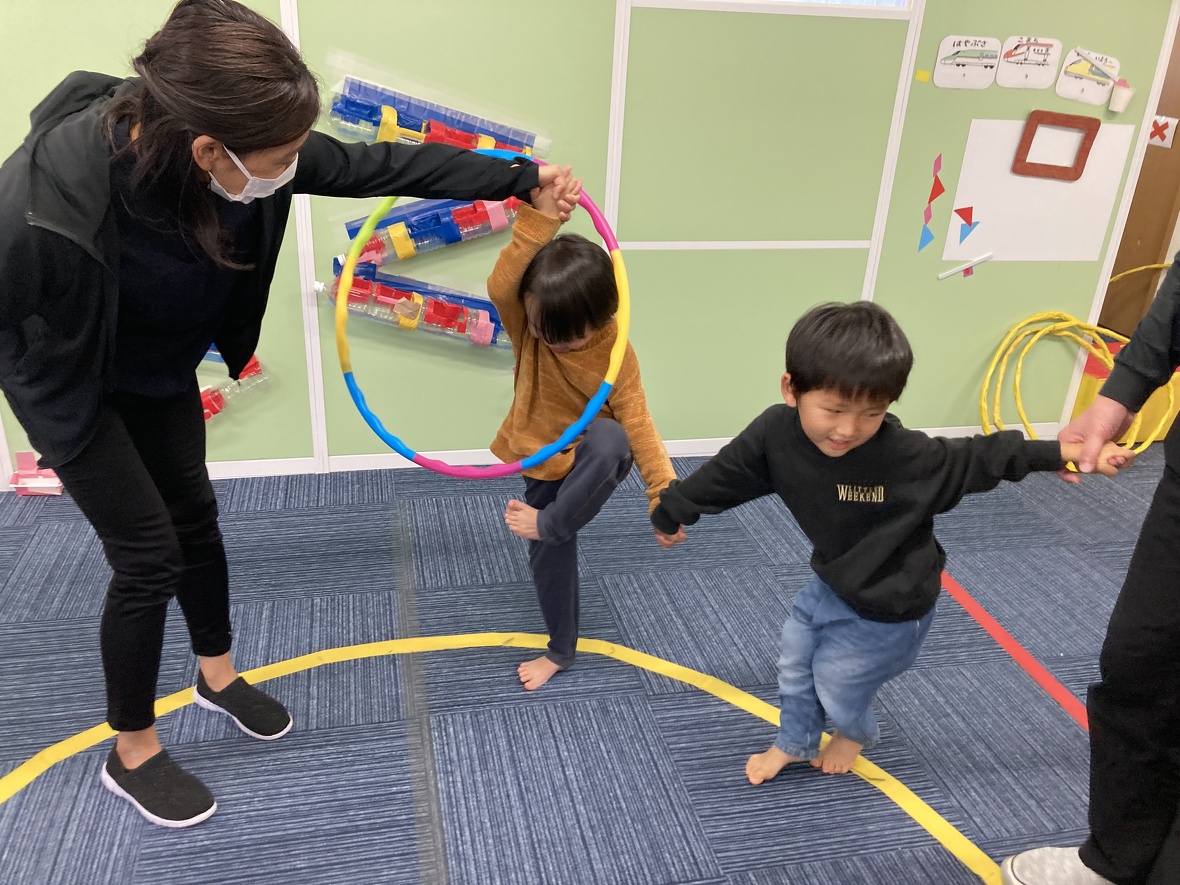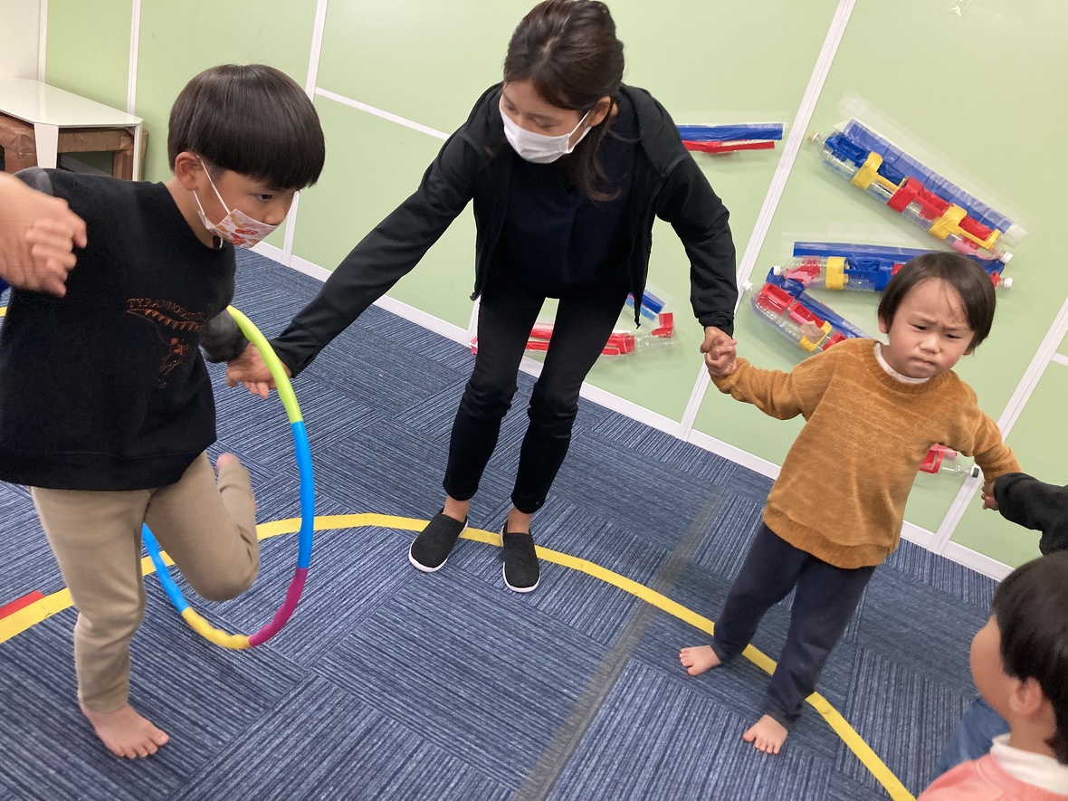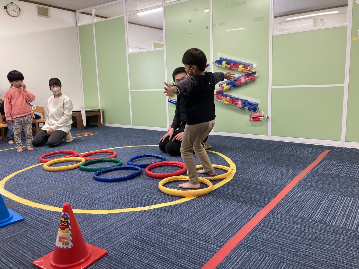 2023年11月24日(金) スタッフブログ 今日はバランス遊びにチャレンジしました!! 片足で安定して立つためには、体幹の強さに加えて、バランス能力が必要となります。今日は遊びながらバランス向上につながる運動にチャレンジしました!!みんな楽しく取り組んでいましたよ!! まずは準備体操!! 手をつないで・・・ 手を放さずに、フープを移動させます 片足で立って、フープをくぐるのは大変です。 両足と片足のジャンプを組み合わせて、最後に「ポーズ!!」 きれいに着地 片足立ちで、こんな動きもできました