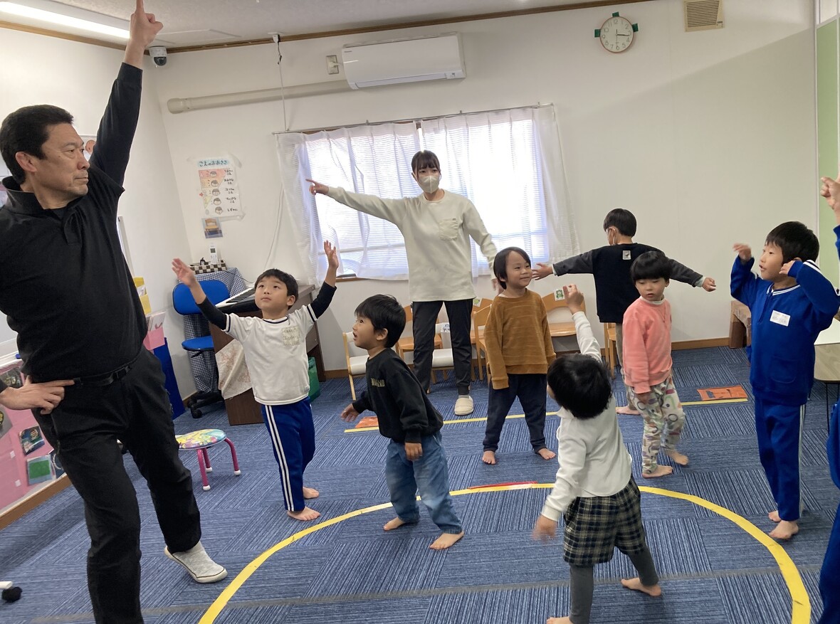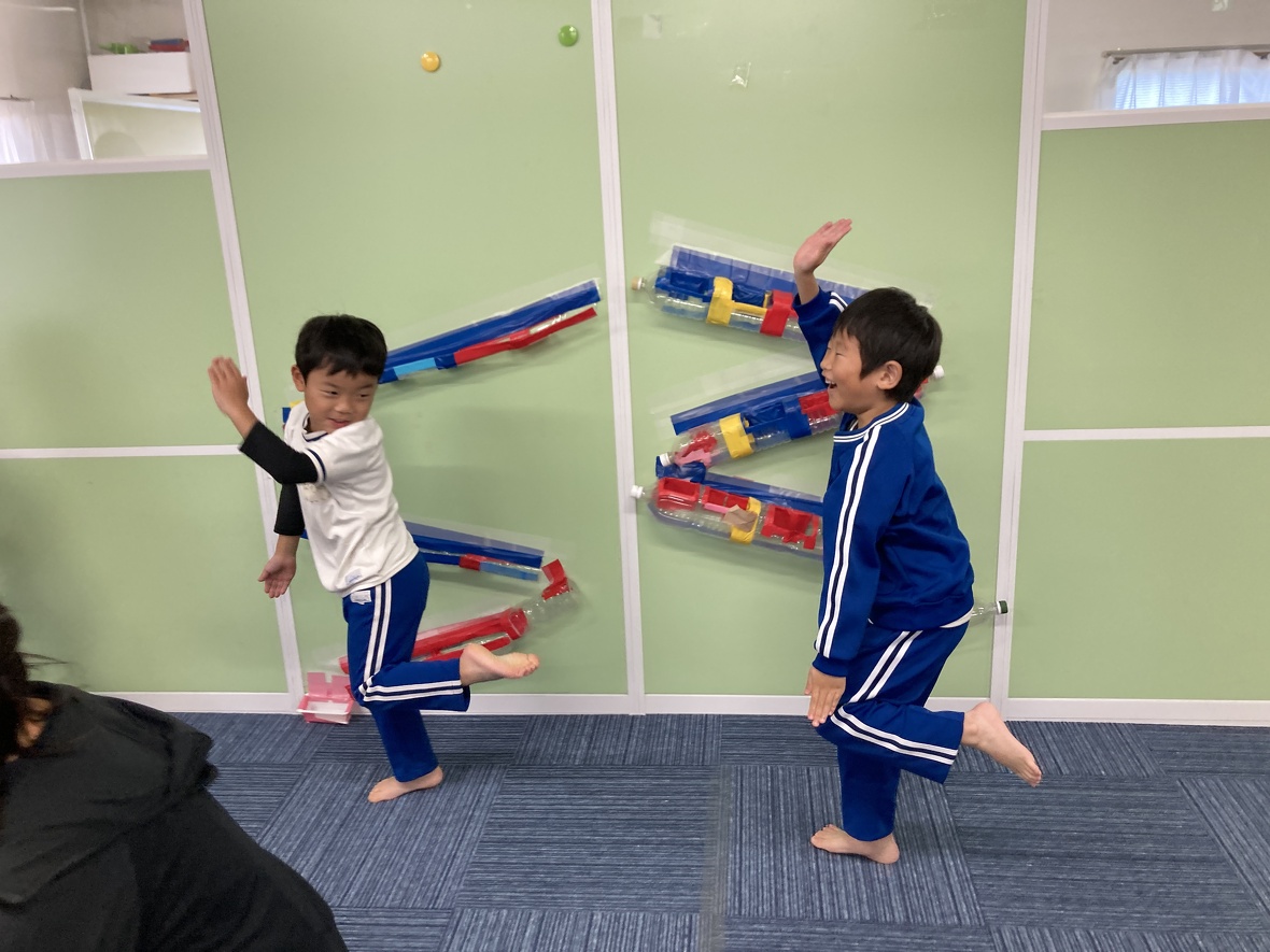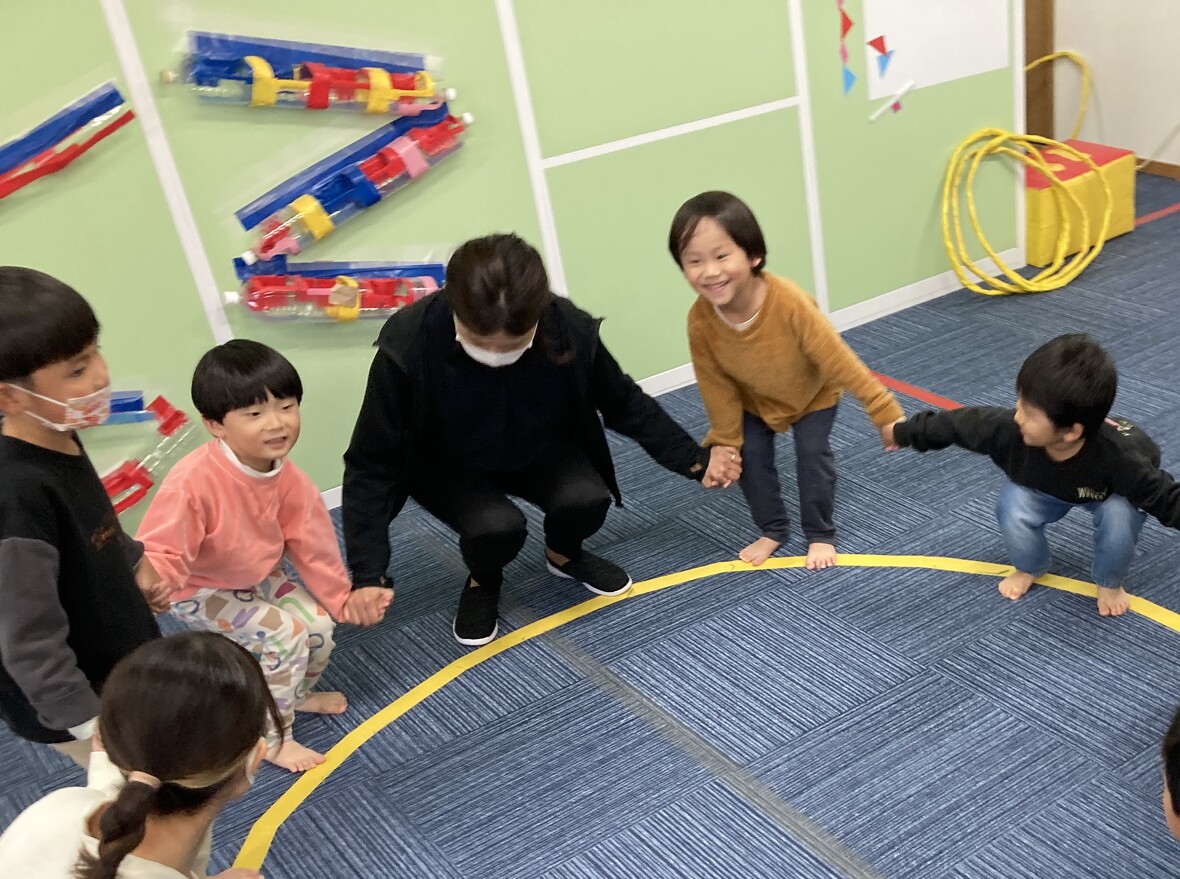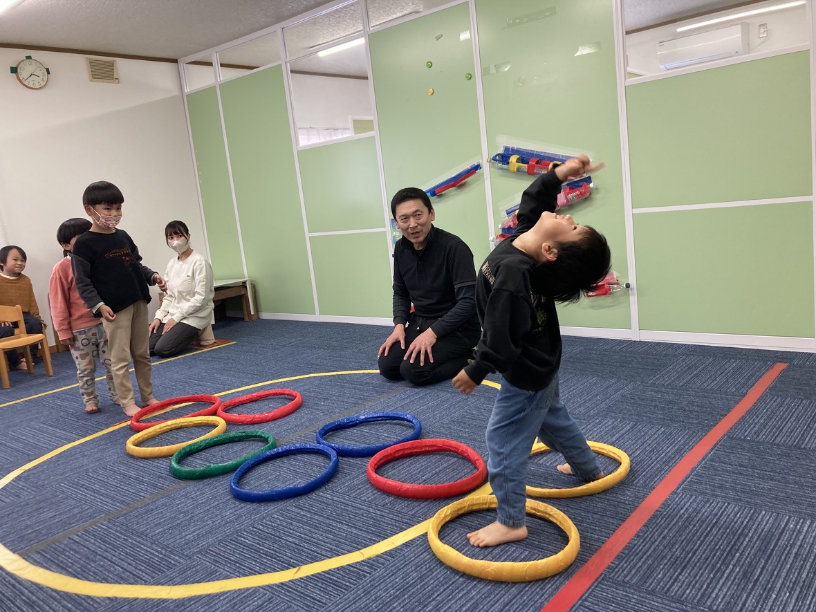 2023年11月24日(金) スタッフブログ 今日はバランス遊びにチャレンジしました!! 片足で安定して立つためには、体幹の強さに加えて、バランス能力が必要となります。今日は遊びながらバランス向上につながる運動にチャレンジしました!!みんな楽しく取り組んでいましたよ!! まずは準備体操!! 手をつないで・・・ 手を放さずに、フープを移動させます 片足で立って、フープをくぐるのは大変です。 両足と片足のジャンプを組み合わせて、最後に「ポーズ!!」 きれいに着地 片足立ちで、こんな動きもできました
