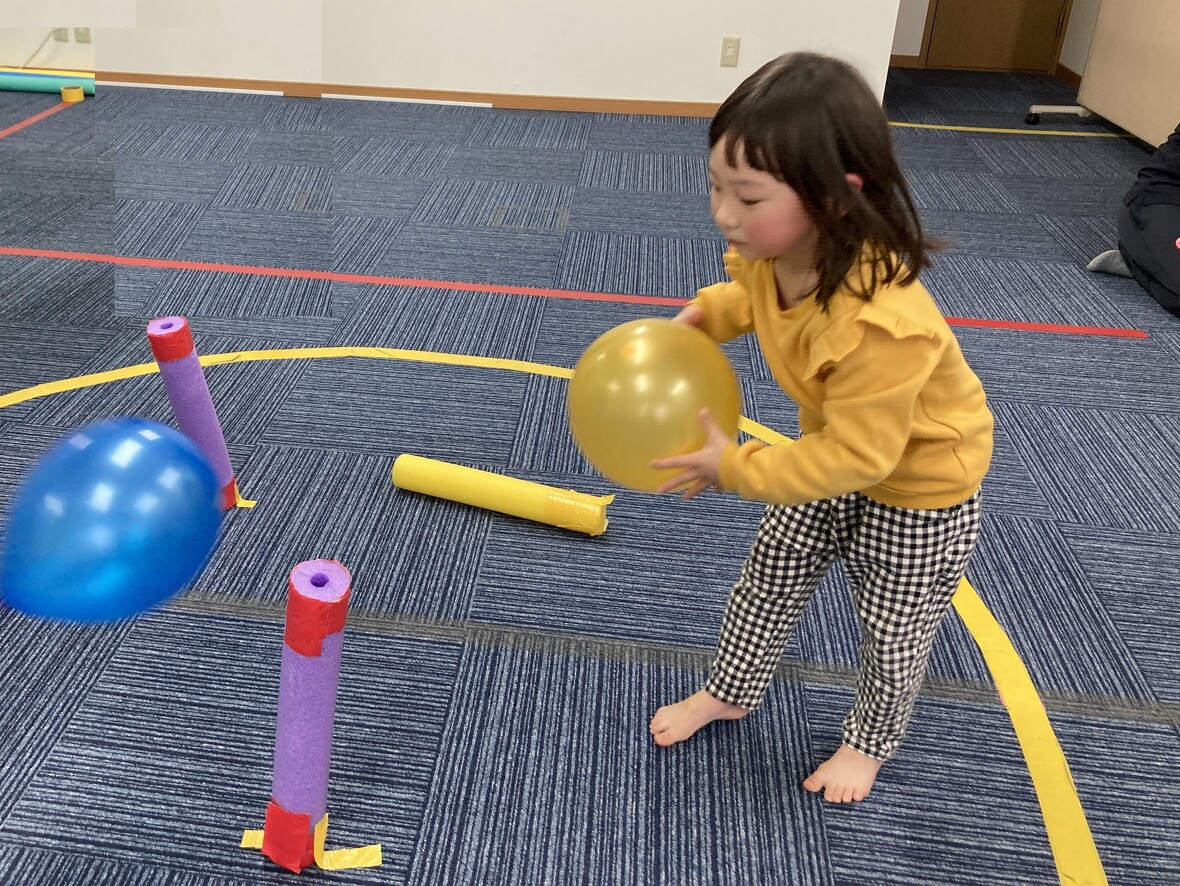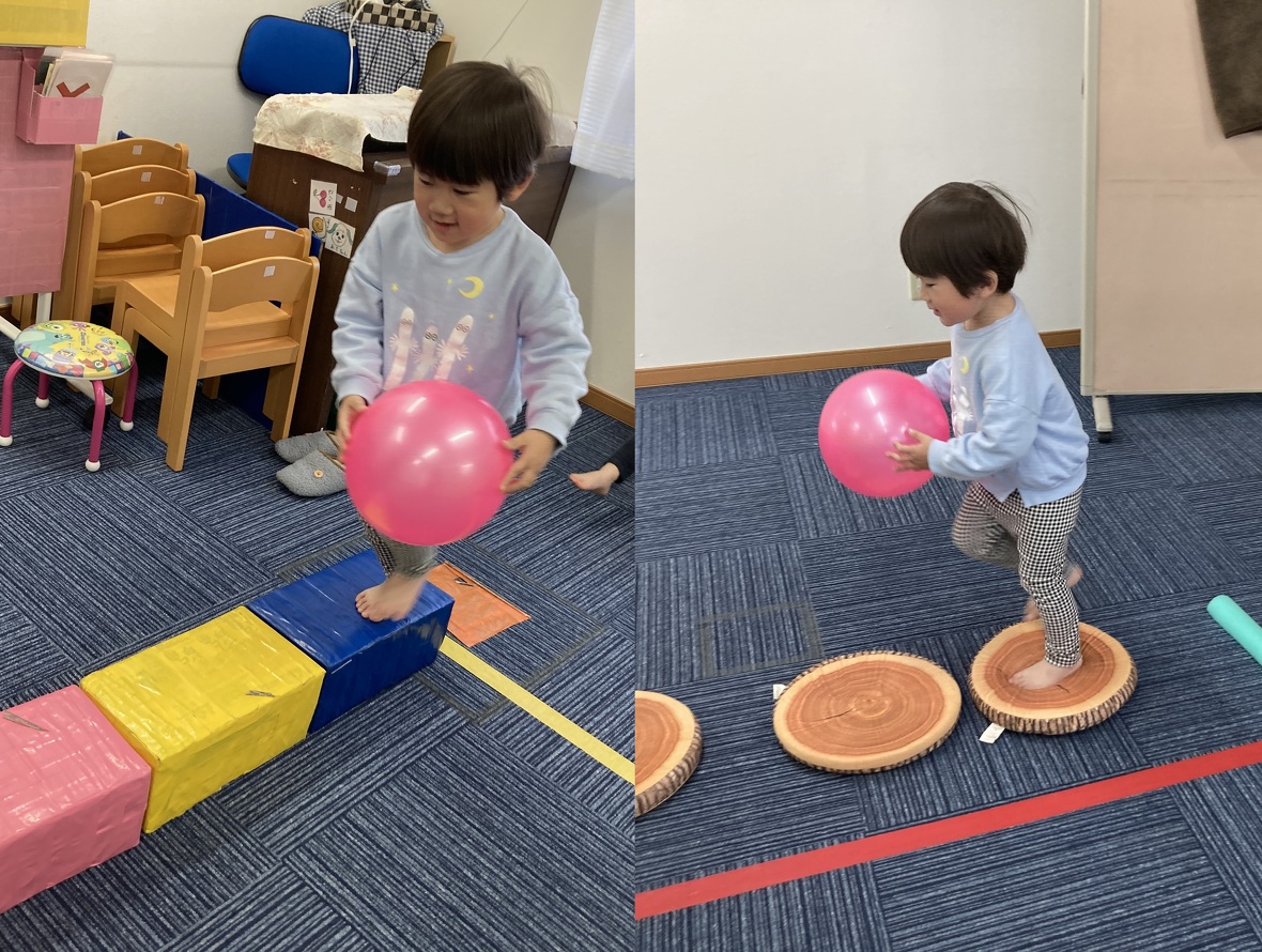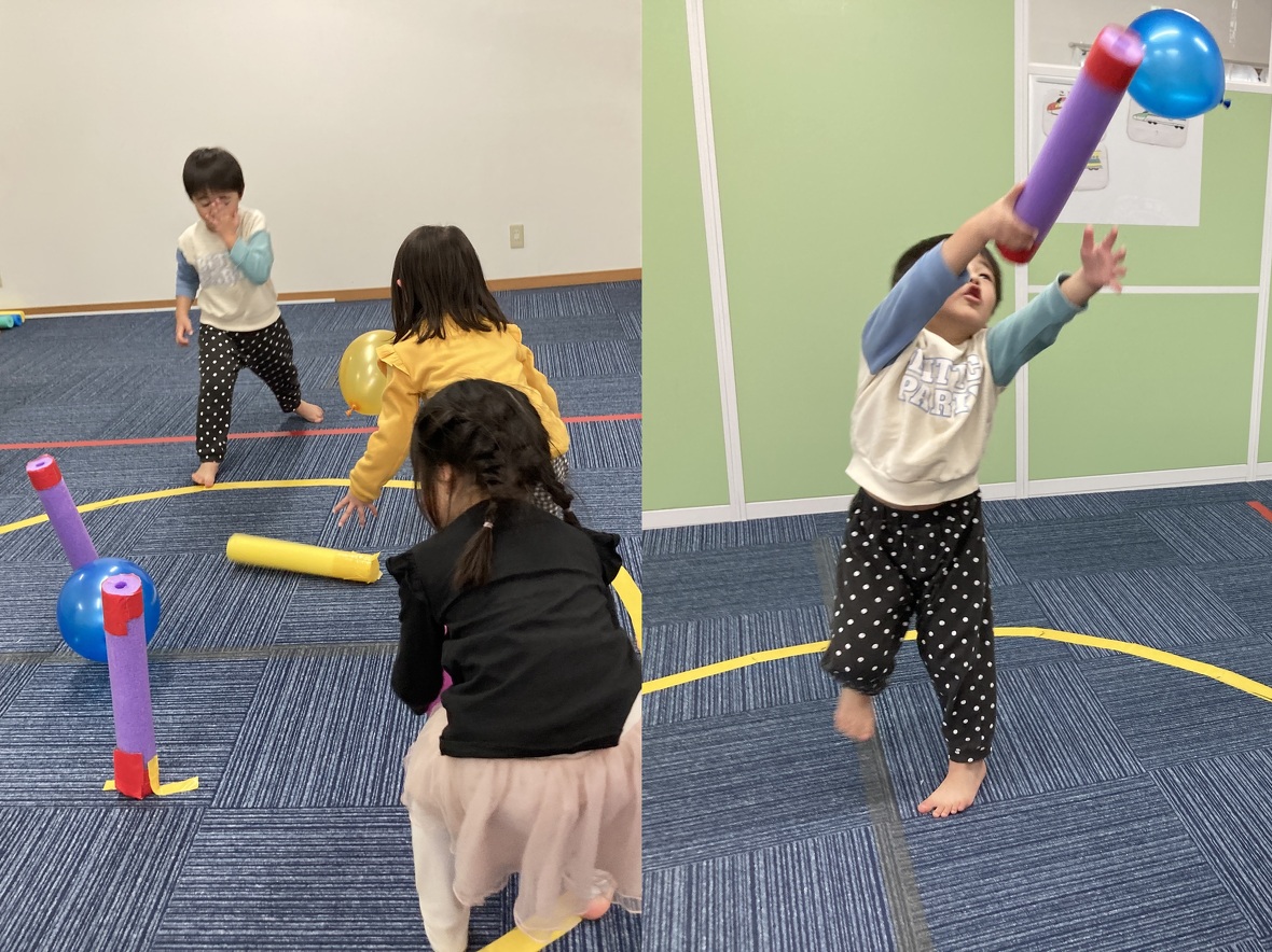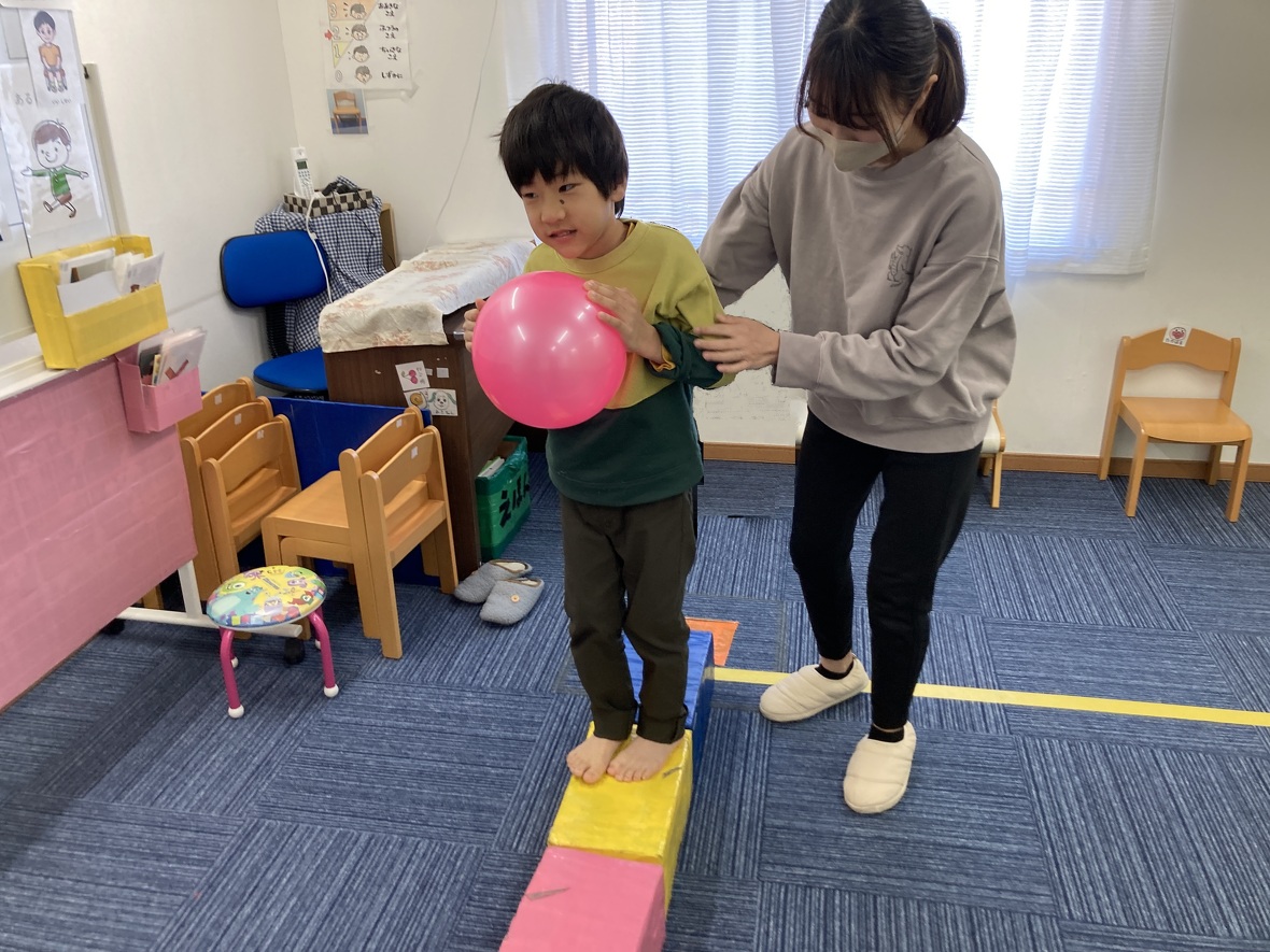 2023年12月26日(火) スタッフブログ 風船で楽しく遊ぼう!! 今日は風船を使った遊びにチャレンジしました。フワフワして思い通りに動かないところが、風船の面白さですね!かわいい笑顔をたくさん見ることができました!!! 風船を落とさないように慎重に・・・ 上手に平均台も渡ります まずは高くあげて・・・ 落ちてくる風船を追いかけます お顔にポーンと当たってしまいました 今度は風船でポールを倒します 他にもいろいろな遊びにチャレンジ!! ウレタンポールでポンッポンッ!!
