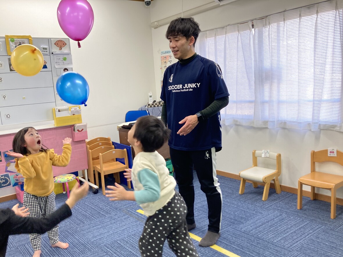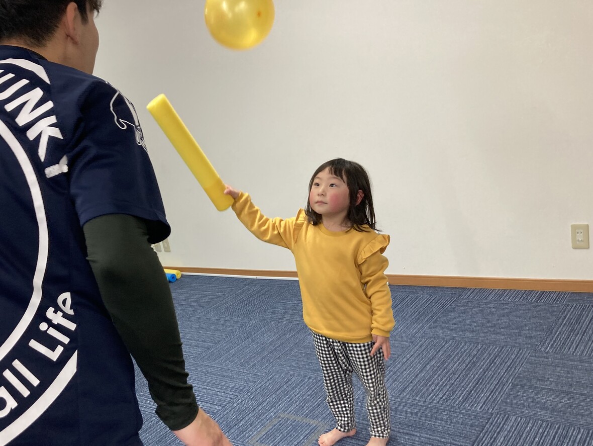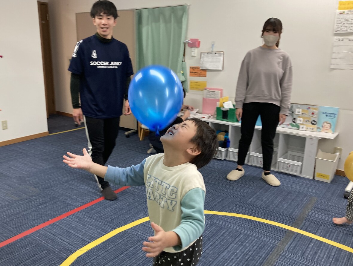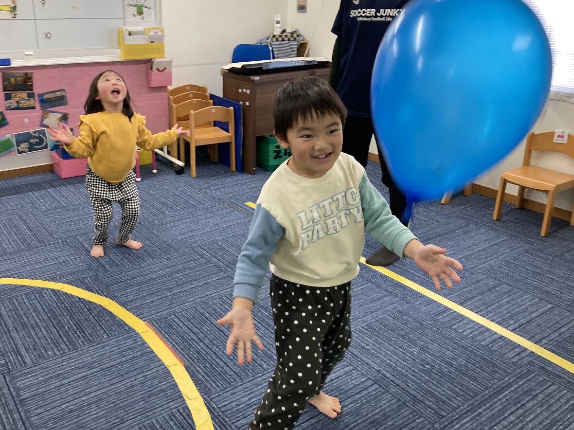 2023年12月26日(火) スタッフブログ 風船で楽しく遊ぼう!! 今日は風船を使った遊びにチャレンジしました。フワフワして思い通りに動かないところが、風船の面白さですね!かわいい笑顔をたくさん見ることができました!!! 風船を落とさないように慎重に・・・ 上手に平均台も渡ります まずは高くあげて・・・ 落ちてくる風船を追いかけます お顔にポーンと当たってしまいました 今度は風船でポールを倒します 他にもいろいろな遊びにチャレンジ!! ウレタンポールでポンッポンッ!!