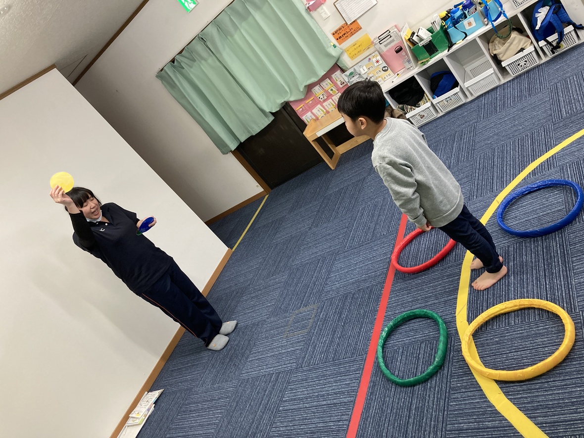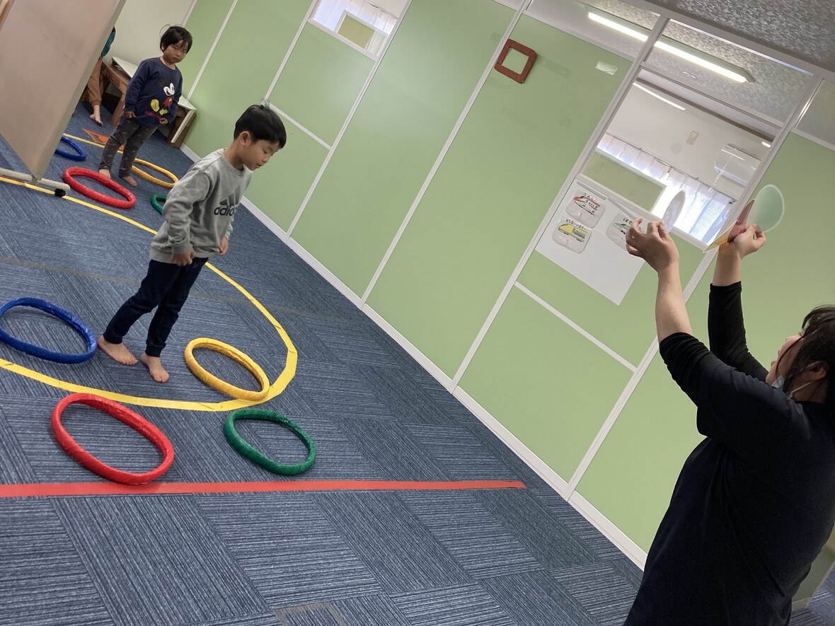 電話帳で番号を調べてから、電話をかける場合、必ず一時的にその番号を記憶してからテンキーをタッチします。自宅や友人の携帯電話など、よく使用する番号はいつでも思い出せますが、ほとんどの場合は、電話をかけ終われば、その番号は忘れてしまいますね。このように作業に必要な情報を一時的に保存し、その後整理していく記憶(またはその情報処理)が”ワーキングメモリー”です。今日は、先生がカードを見せながら、その色を言葉で読みあげて指示をして、それを受けて子どもたちは、同じ色のフープに同じ順番で入る遊びをしました。以前にも説明しましたが、”ワーキングメモリー”自体を鍛えることについては、まだ十分な解明ができていないようです。「忘れ物が多い」「不注意」「読み書きが苦手」といった子どもは、ワーキングメモリーの機能が関係している場合も考えられますが、その場合には、長期記憶と結び付けたり、画像や音、においなど、五感を活用して他の情報と組み合わせることによって、ワーキングメモリーをサポートすることが重要になります。