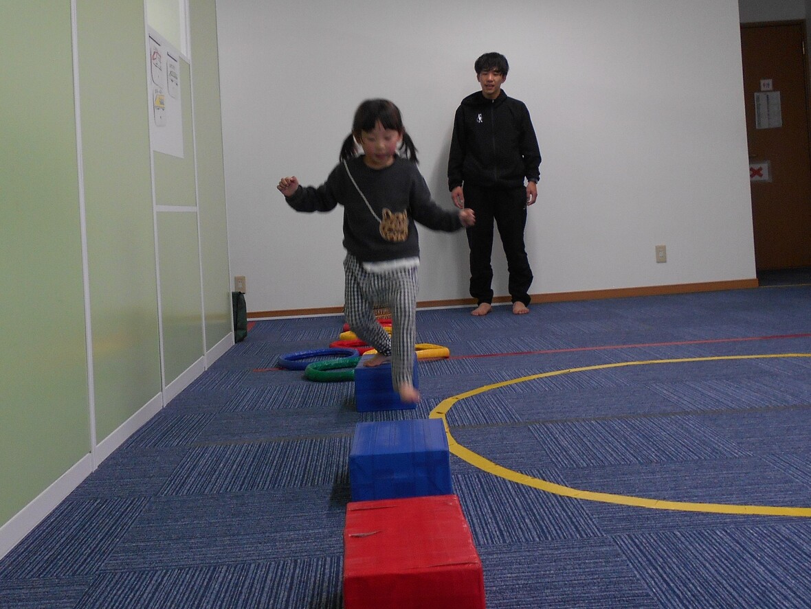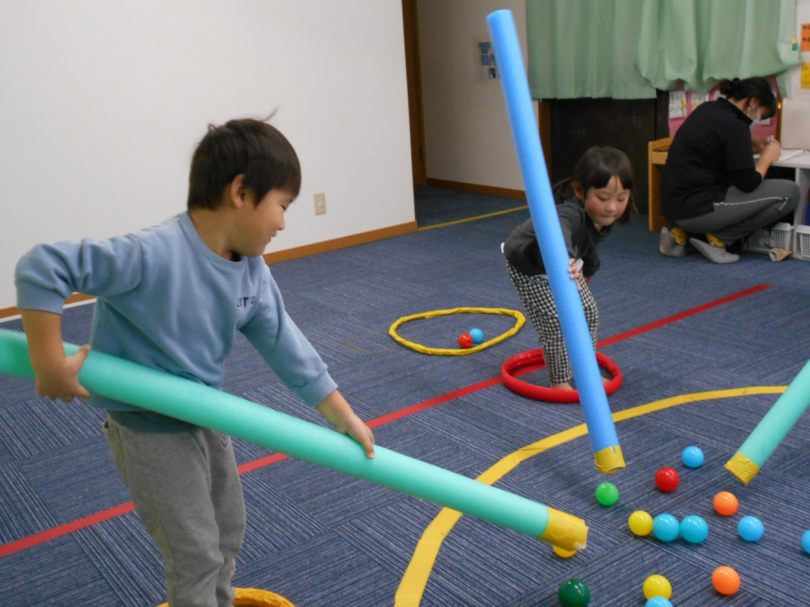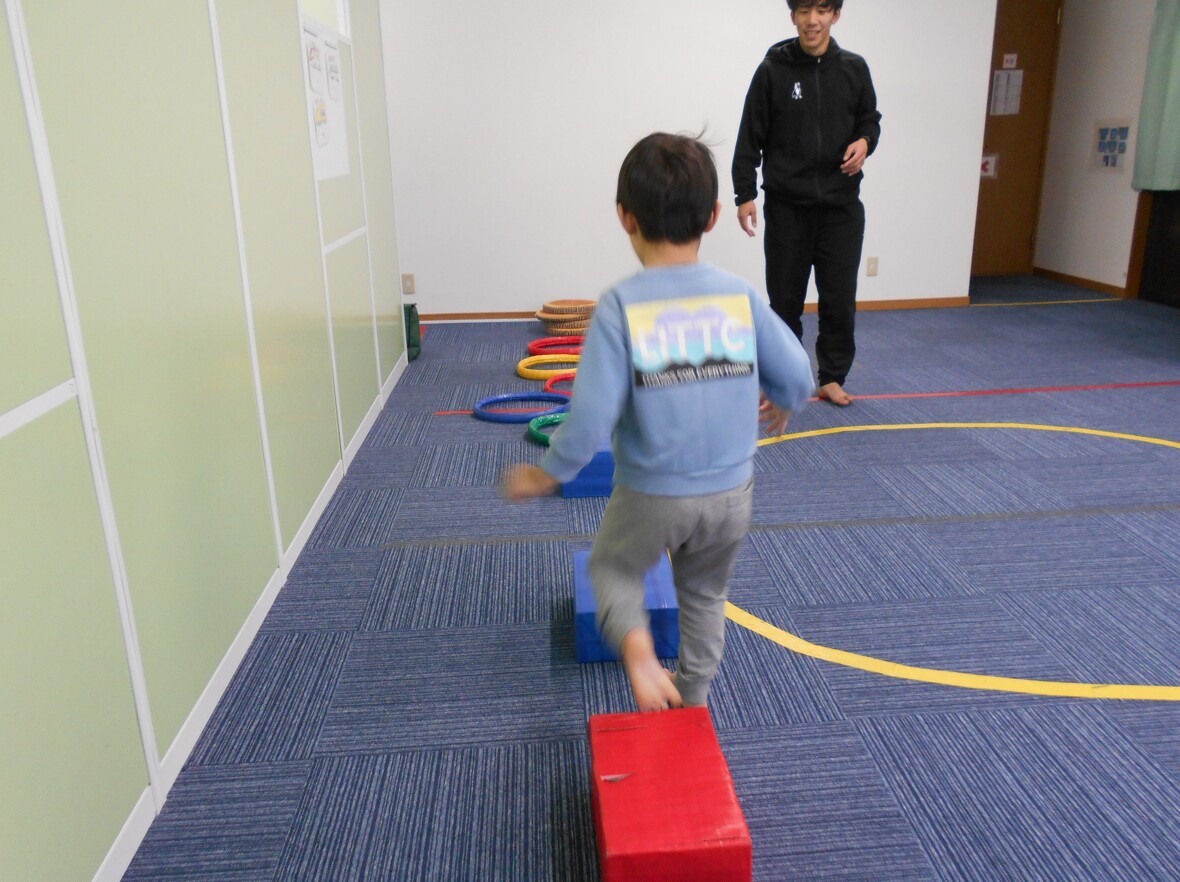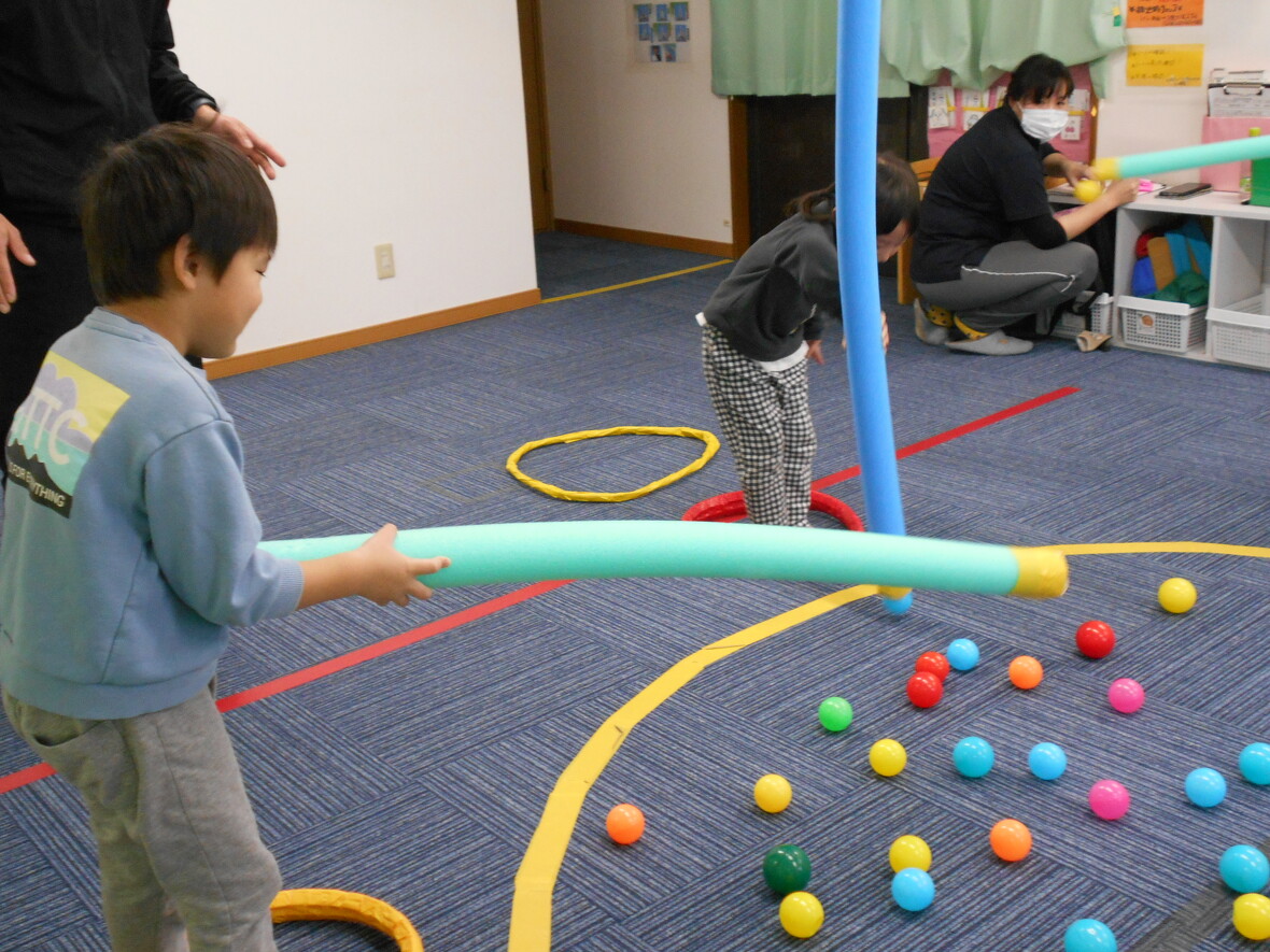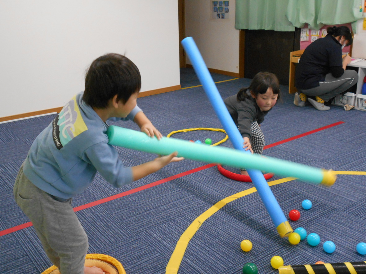2024年01月16日(火) スタッフブログ タカ先生とバランス遊び!!! 今日はタカ先生とバランス遊びをしました。平均台の上を歩いた後は、ウレタンポールの先についたガムテープでボールをくっつけて「ボール取り」。小さなフープの中から出ないように遠くのボールを取る時には、足でしっかりバランスを保つ必要があります。たくさんボールをゲット!! 平均台はスイスイ~ いいバランスですね~ 足の位置はフープから出ないように ウレタンポールの釣り竿でボールをくっつけます みんな上手にとれました