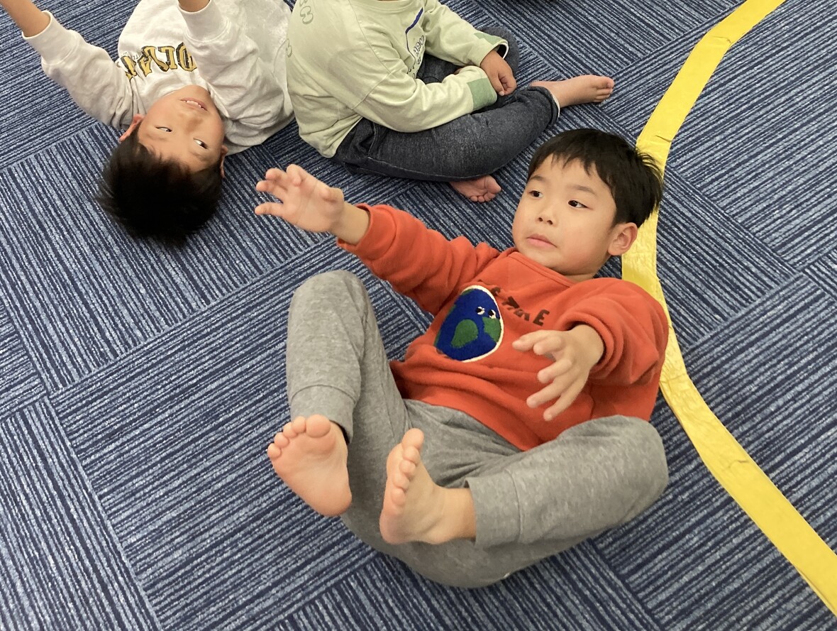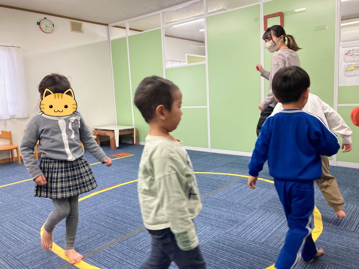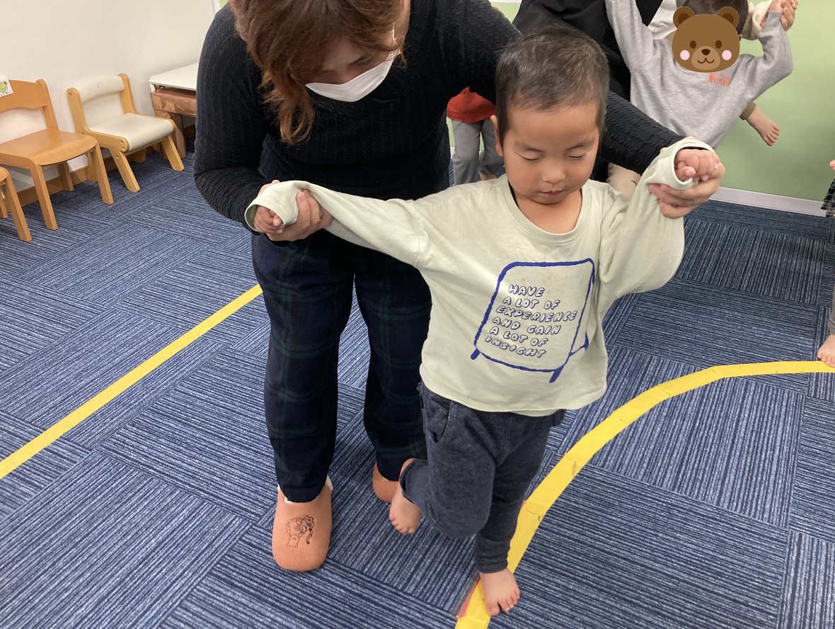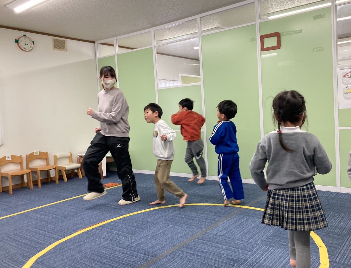 2024年01月17日(水) スタッフブログ 音楽に合わせて体を動かそう!! 今日は音楽に合わせて、いろいろな動きを楽しみました!ゾウさんのように大きくゆっくりした動きから、小さな動物のような早いリズムに変えてみます。リズム感を養い、動物の動きをイメージすることで想像力を高めることにつながりますね。 最初はゆっくり歩いて・・・ 次はぴょんぴょん跳びはねて・・・ 片足立ちもできますよ ひっくり返った”カメさん”?
