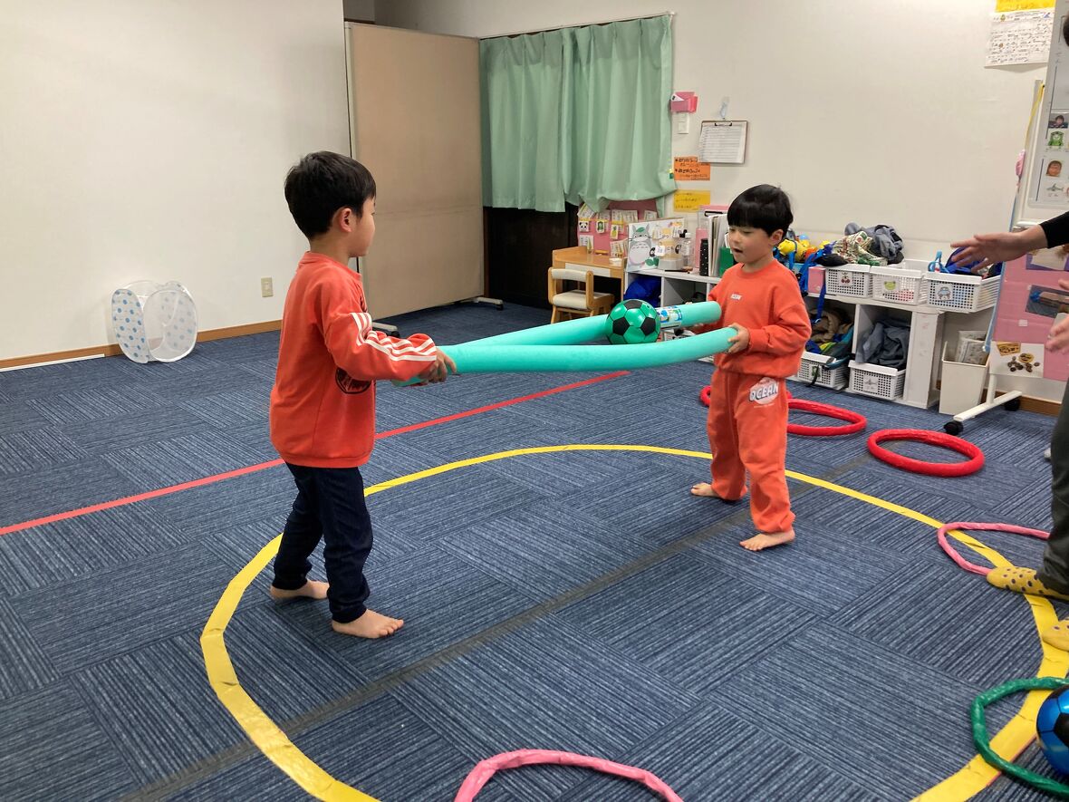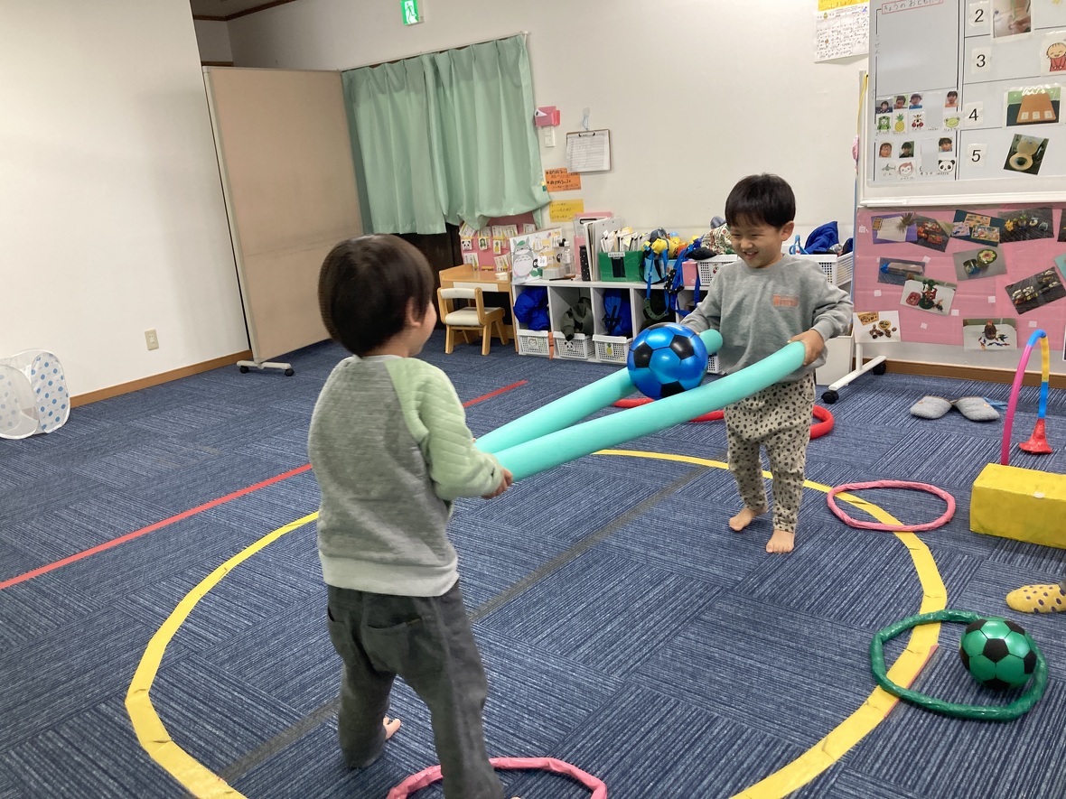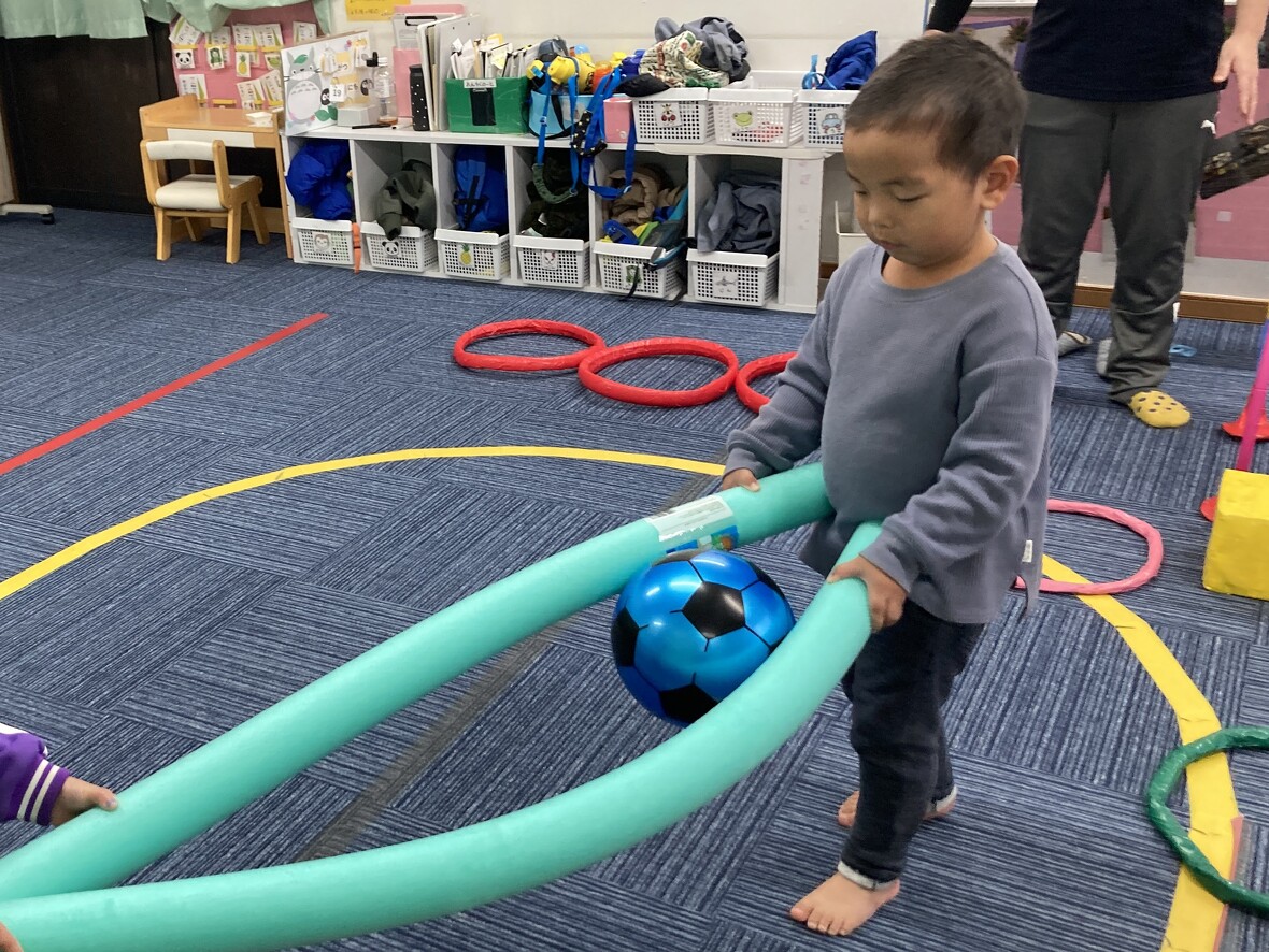 2024年01月19日(金) スタッフブログ サーキット遊びを楽しもう!! サーキット遊びは、いくつかの動きを組み合わせて、楽しみながらバランスよく体力づくりができるプログラムです。今日のサーキット遊びには、二人組になってウレタンポールでサッカーボールをはさんで運ぶ難しい動きもありましたが・・・・。お友だちと力を合わせて上手にできていましたよ!! 向かい合って、ウレタンポール2本を使って 先生と一緒に 落とさないように・・・ 慎重に運びます ボールを運び終わったら、左右に分かれてピョンピョンと・・・ ジャンプ!! トンネルくぐりもありました!