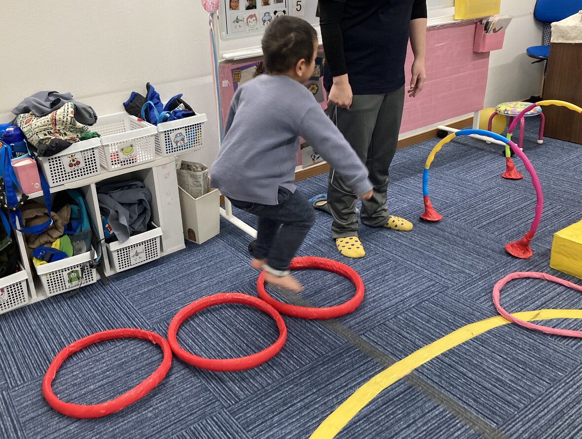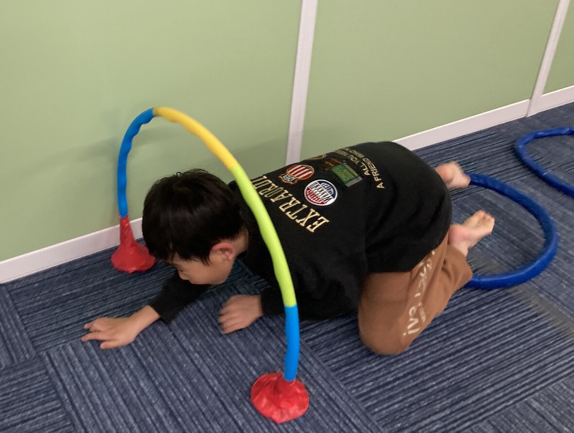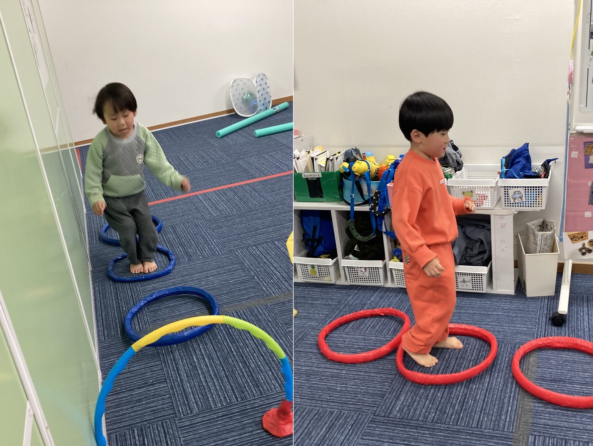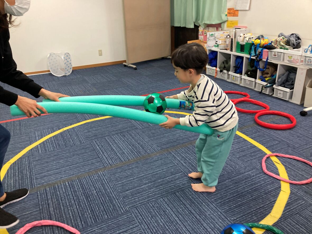 2024年01月19日(金) スタッフブログ サーキット遊びを楽しもう!! サーキット遊びは、いくつかの動きを組み合わせて、楽しみながらバランスよく体力づくりができるプログラムです。今日のサーキット遊びには、二人組になってウレタンポールでサッカーボールをはさんで運ぶ難しい動きもありましたが・・・・。お友だちと力を合わせて上手にできていましたよ!! 向かい合って、ウレタンポール2本を使って 先生と一緒に 落とさないように・・・ 慎重に運びます ボールを運び終わったら、左右に分かれてピョンピョンと・・・ ジャンプ!! トンネルくぐりもありました!