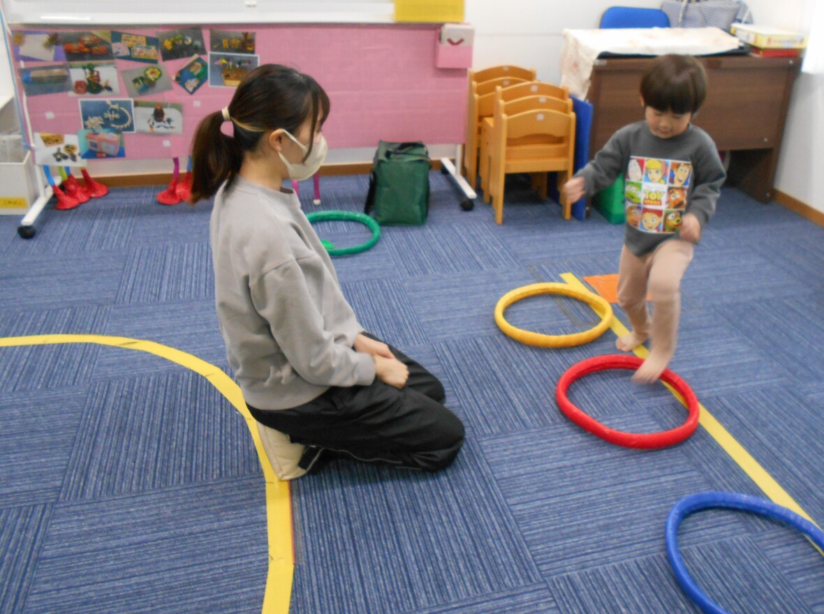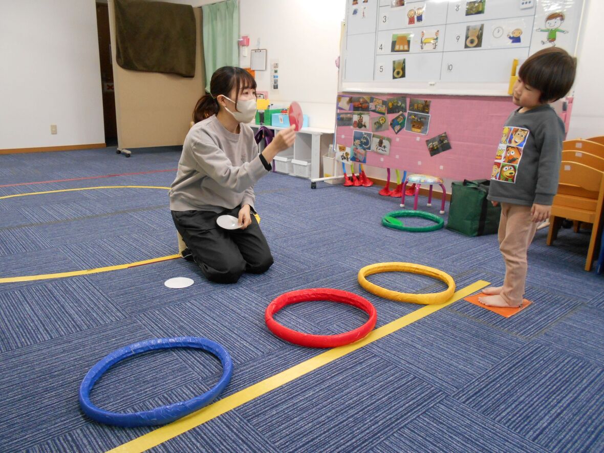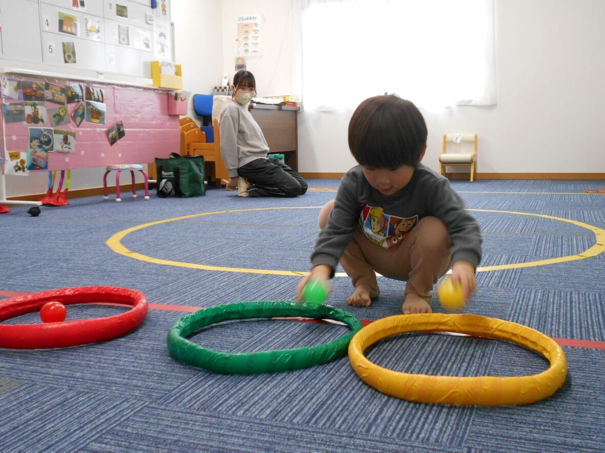 2024年02月01日(木) スタッフブログ "色"をおぼえて、さがしてみました(ワーキングメモリー) 先生が色のついたカードを見せながら、「赤!」「青!」と読みあげます。子どもはその色をおぼえてから、同じ色のフープに入ったり、ボールを探してみます。この遊びには"ワーキングメモリー"と呼ばれる一時的な情報の記憶と処理、そして整理を行う能力が使われます。ワーキングメモリーは短期の作業記憶で日常生活においても非常に重要なものです。 先生が色のカード(赤)を見せます 迷わずに赤いフープに入ることができました 今度は、カードの色のボールを3種類集めましょう