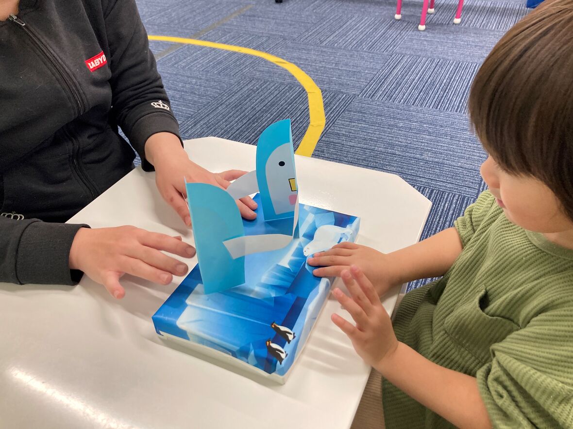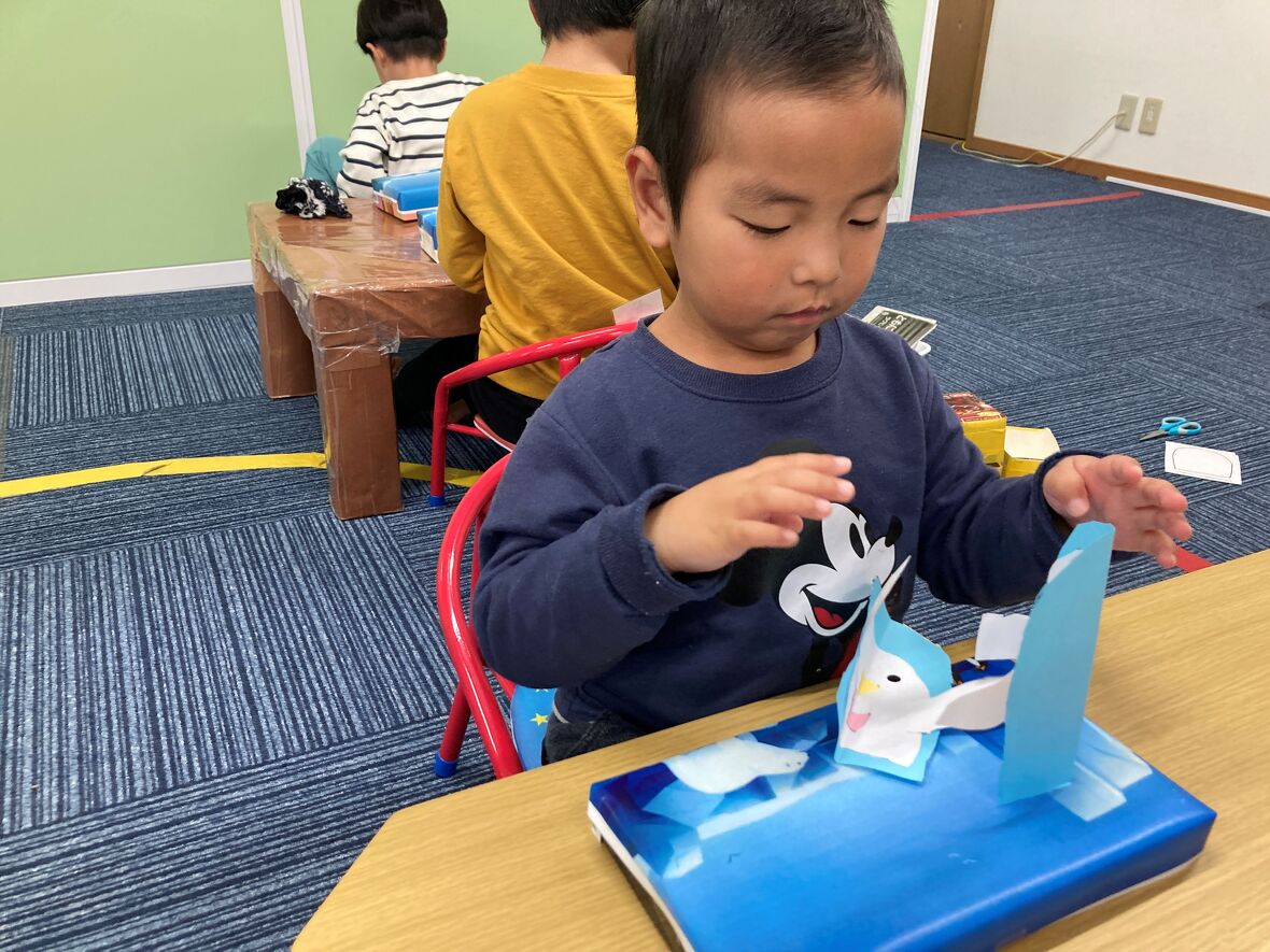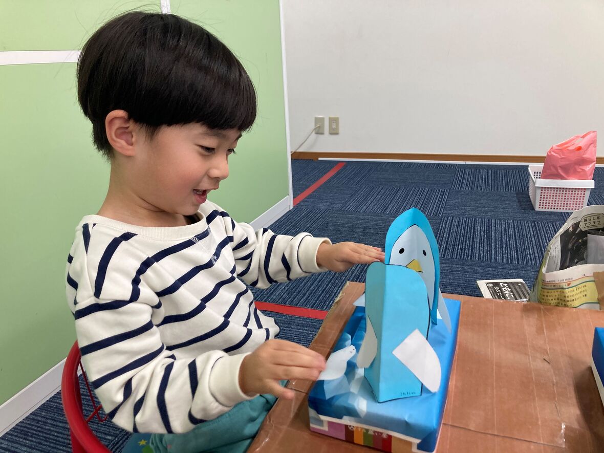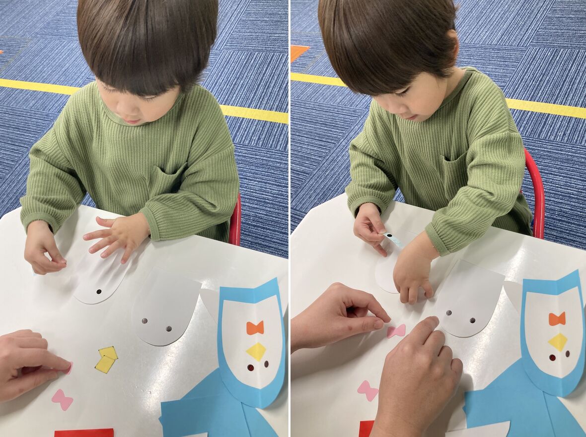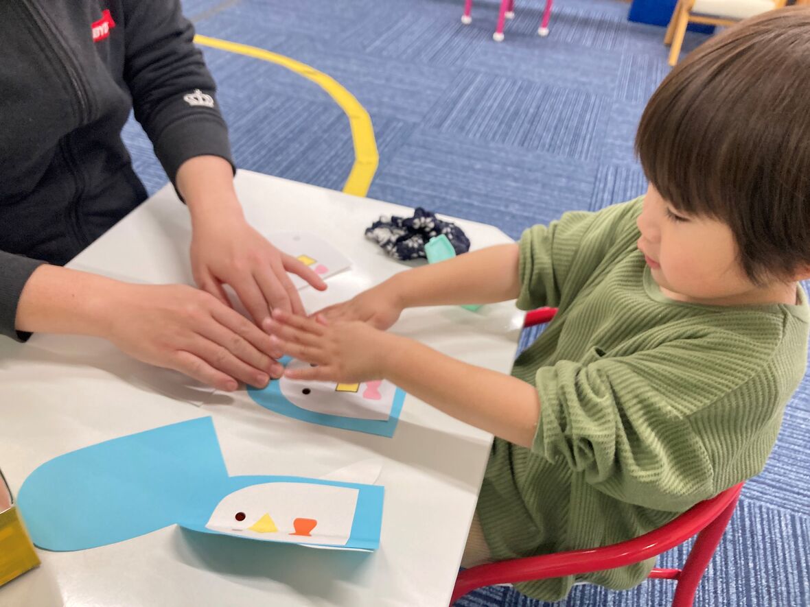 2024年02月05日(月) スタッフブログ トントン相撲で遊びました! 今日は「制作」でペンギンさんのトントン相撲を作りました。型紙に目や口を貼っていくと・・・ペンギンさんの出来あがり!! 北極の氷山の土俵で、ペンギンさんの大相撲!おうちでも遊んでみてね!! 台紙に目や口を貼って 蝶ネクタイもつけましょう ペンギンさんのできあがり ペンギンさんのできあがり 午後のお友だちは、パーツを自分で切ってみました。 先生にも少し手伝ってもらって”チョキチョキ” トントン相撲で遊んでみました