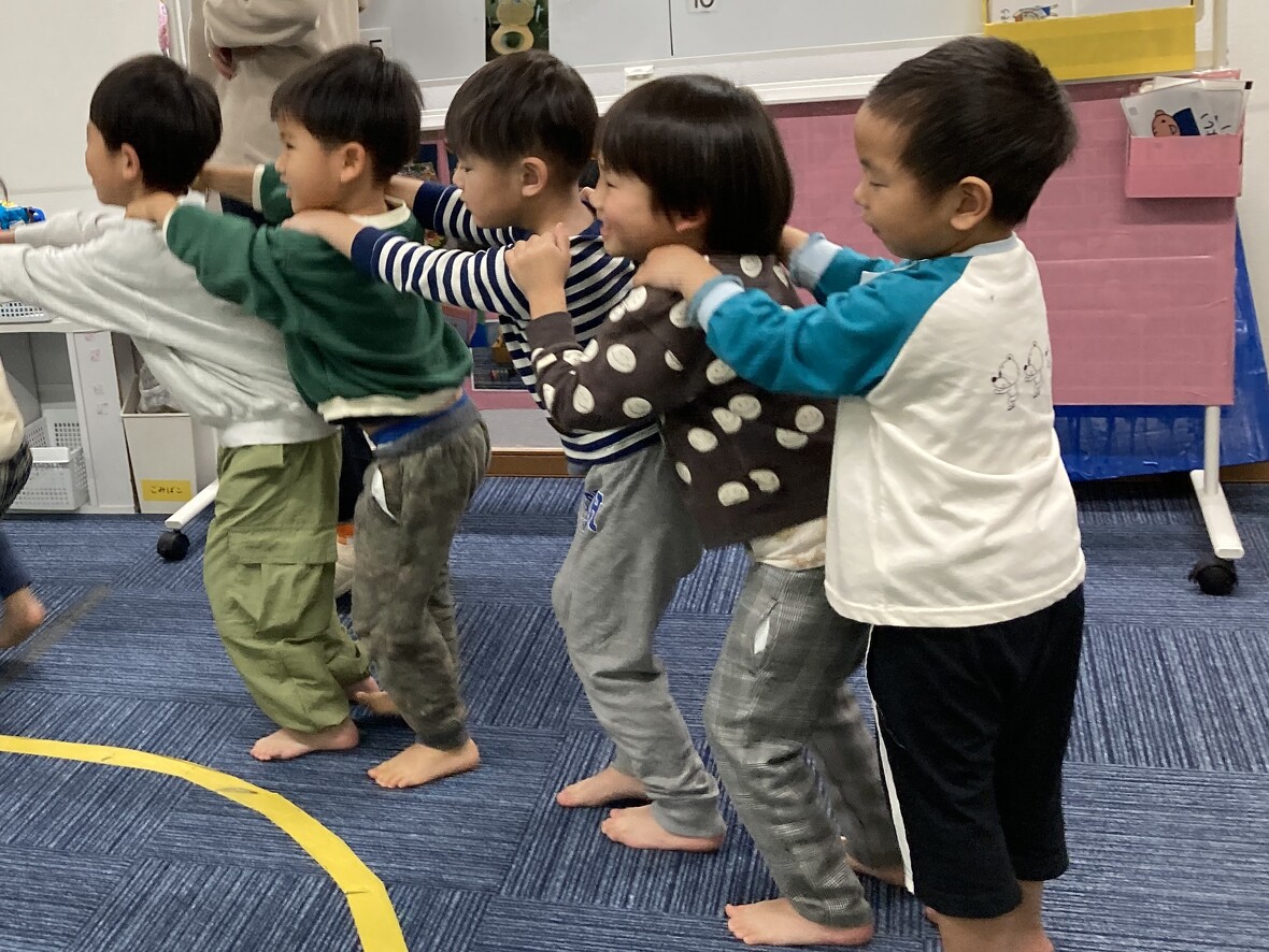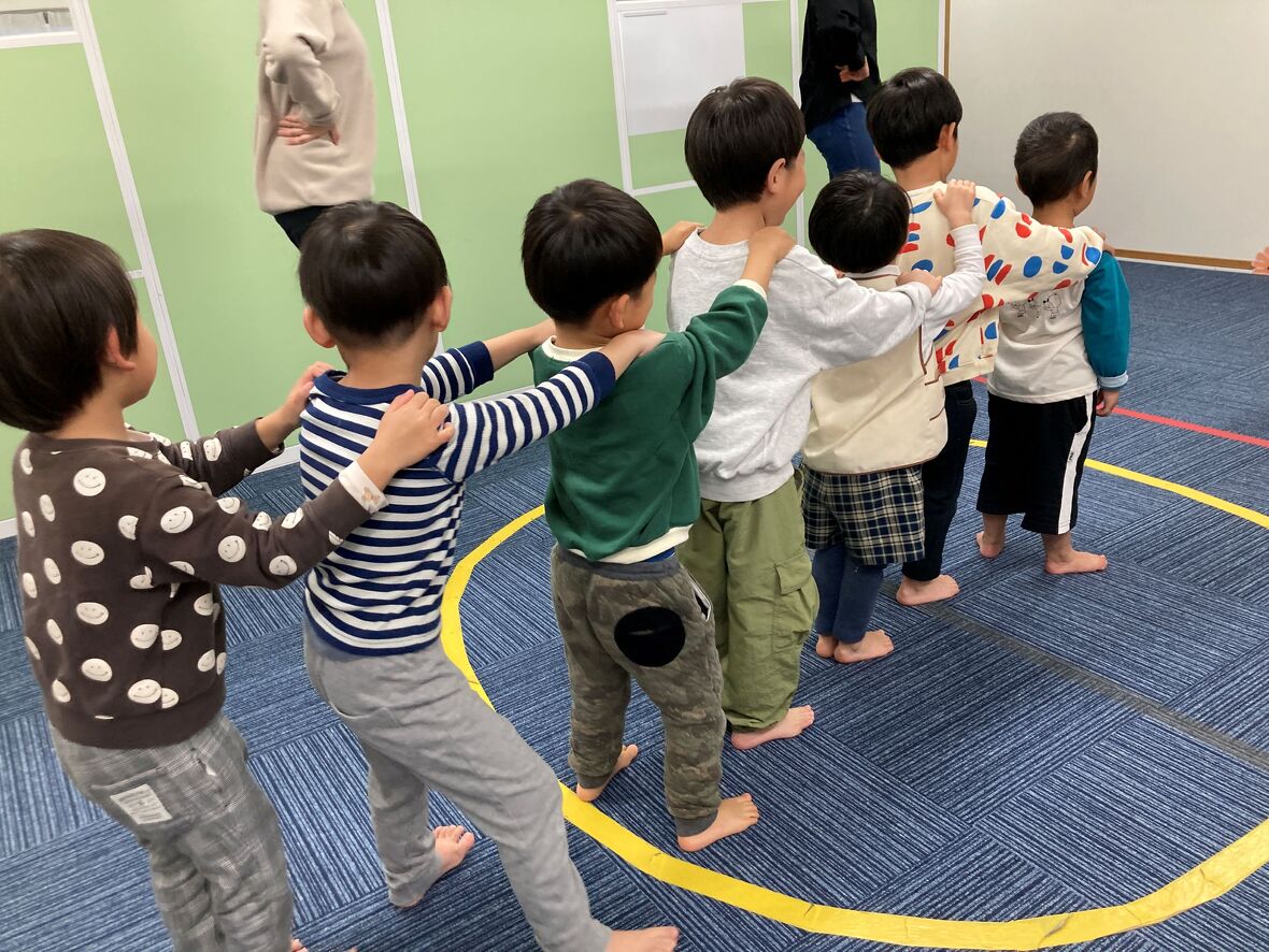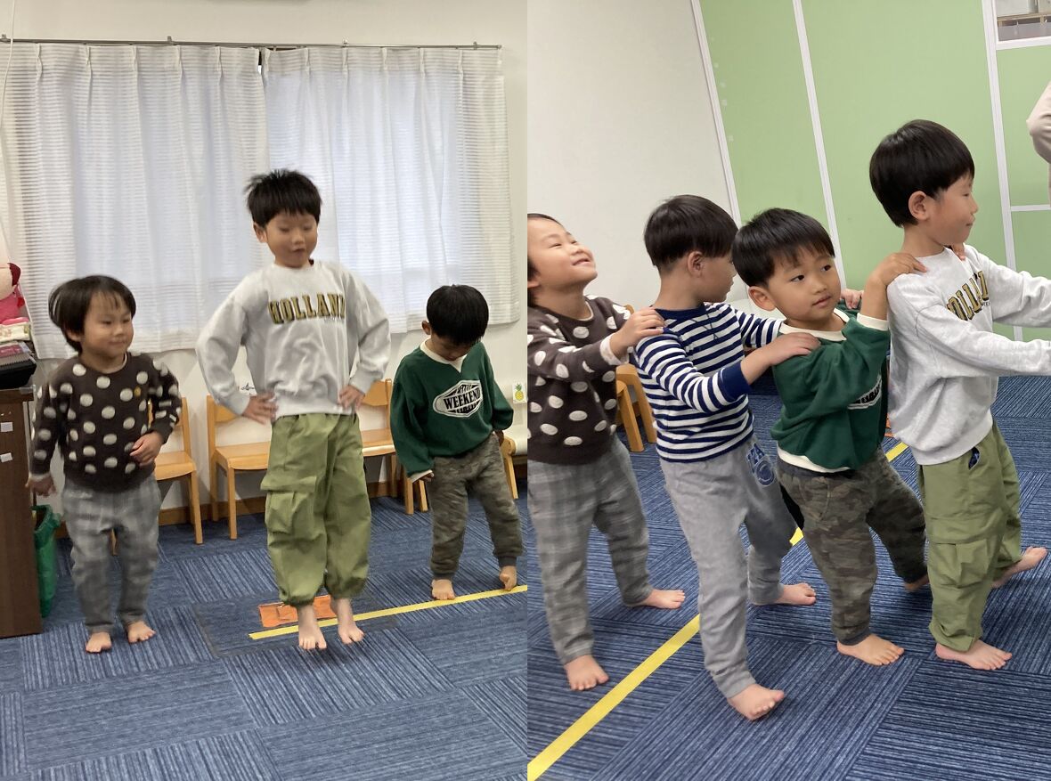 2024年02月21日(水) スタッフブログ "ジェンカ"をみんなで踊りました♫♬ 保護者の皆様は「ジェンカ」というと何を思い出されますか?パーティや家族で楽しむ木片を使ったゲームではありませんよ(あれは”ジェンガ”末尾音が濁ります)。坂本九さんの歌「レットキス」に合わせたフォークダンスとして有名かもしれませんが、フィンランド民謡に合わせたダンスですね。今日は子どもたちとジェンカダンスを楽しんでみました。これがなんと大盛り上がり!!!!!明るい笑い声が部屋中にあふれていました。 動きの練習から。「ホップ」「ステップ」「キックして~」 さあ、みんなでつながってダンス♬ 上手にできましたね!!!