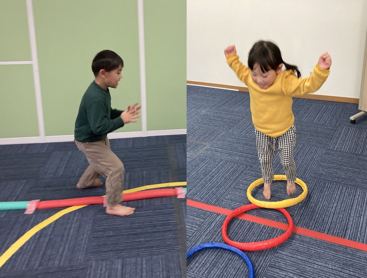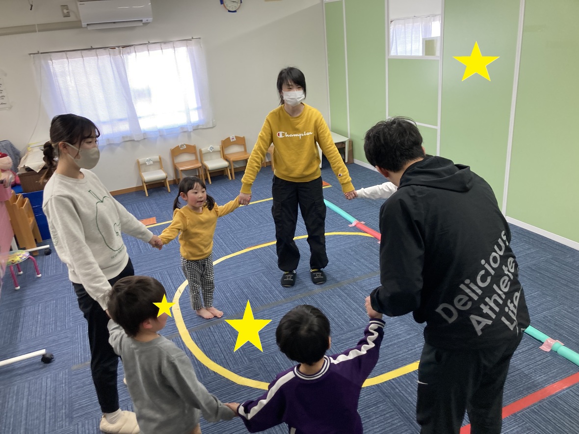 2024年02月27日(火) スタッフブログ タカ先生とジャンプ!! みんなで大きな輪になって「前」「後ろ」にジャンプ!!フープやウレタンポールを使って楽しく遊びながら、ジャンプ運動にチャレンジしました。 手をつないで輪になって・・・ しっかり安定した動きができていますね