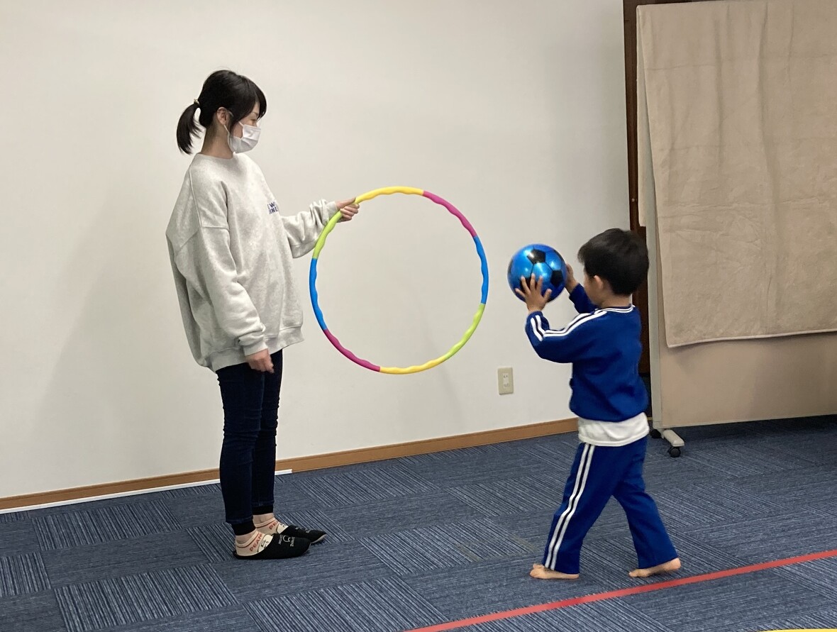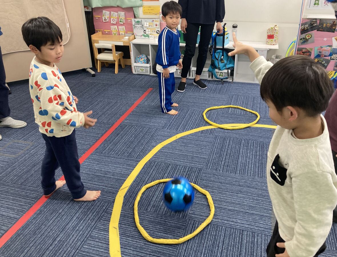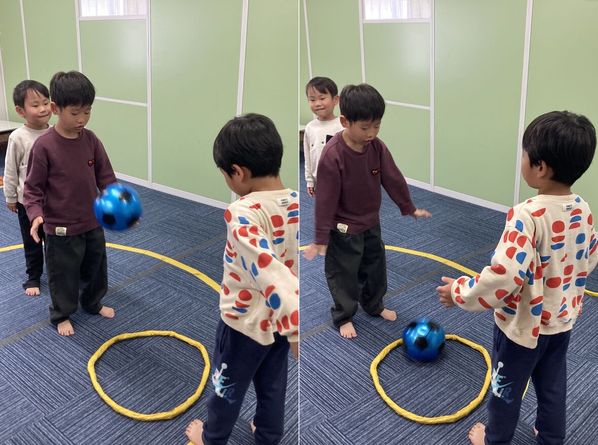 バスケットボールやハンドボールで用いられるバウンド(バウンズとも)パスは、相手にボールをカットされにくい高度な技術で、年少や年中のお友だちには少し難しい動作です。両手でしっかりボールを押し出す(チェストパス)、またはボールを両手で持ったまま、頭より高く挙げて振り下ろす(オーバーヘッドパス)など、地面(床)に弾ませる練習を少しずつ行うことで、年長のお友だちはボールの動きをコントロールして相手にパスができるようにもなりました。相手との距離を視覚で確認して、腕の動作の強さを調節するフィードバックというメカニズムを高めていきます。
