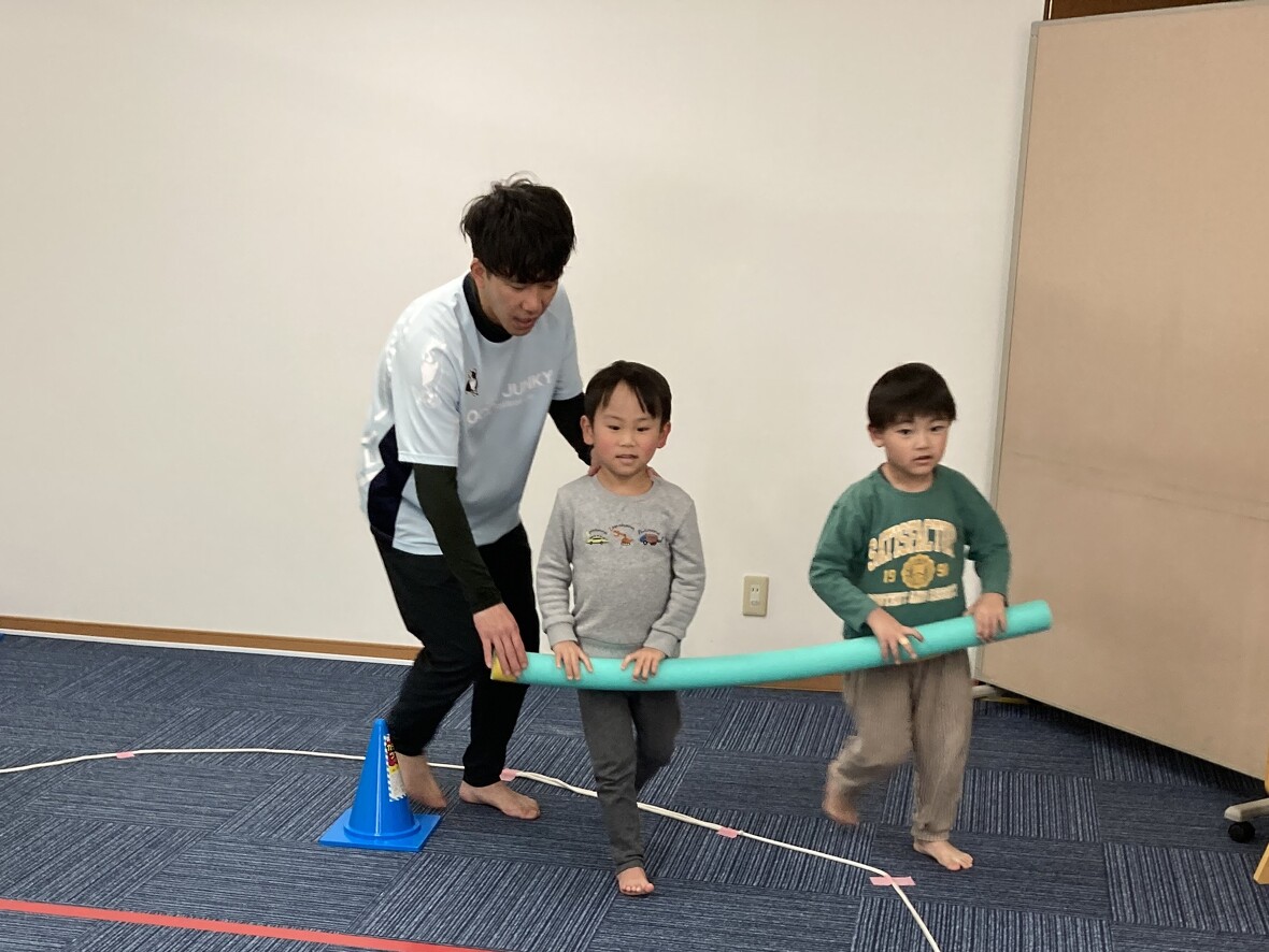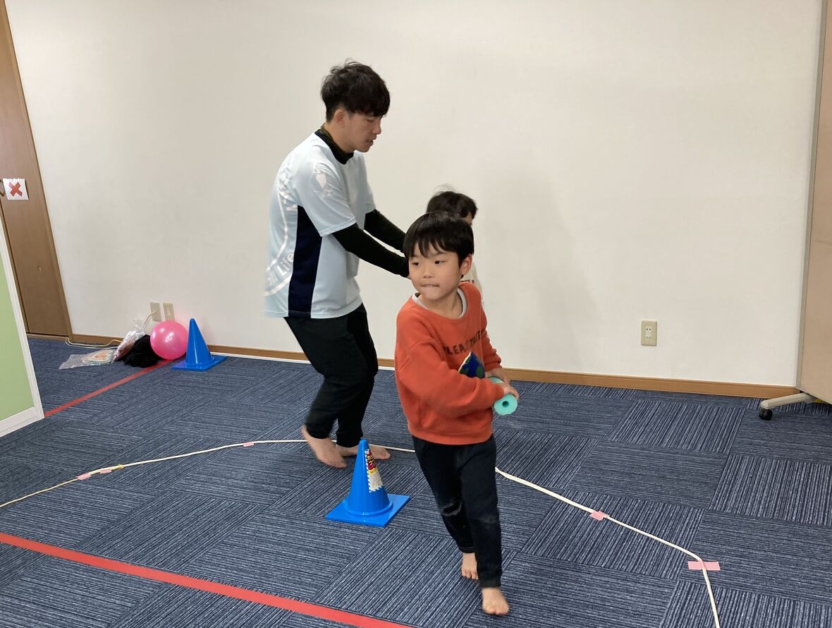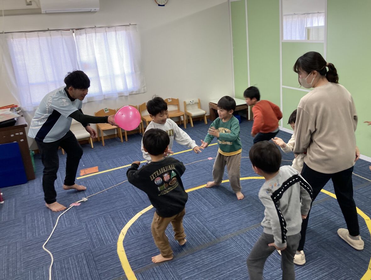 2024年03月22日(金) スタッフブログ タカ先生と楽しくボール遊びをしました!! 今日はタカ先生と運動の日です。ウレタンポールを使ってリレーをしたり、ボールをあてる”おにごっこ”をしたりして、みんなで遊びました!!特におにごっこはボールから逃げるときにみんな大歓声!!!楽しかったね~ 二人でバランスよく歩くことができました! おっと!ちょっとコースからはずれた? タカ先生が転がしたボールにあたらないように・・・。 みんなで大騒ぎしながら逃げました~