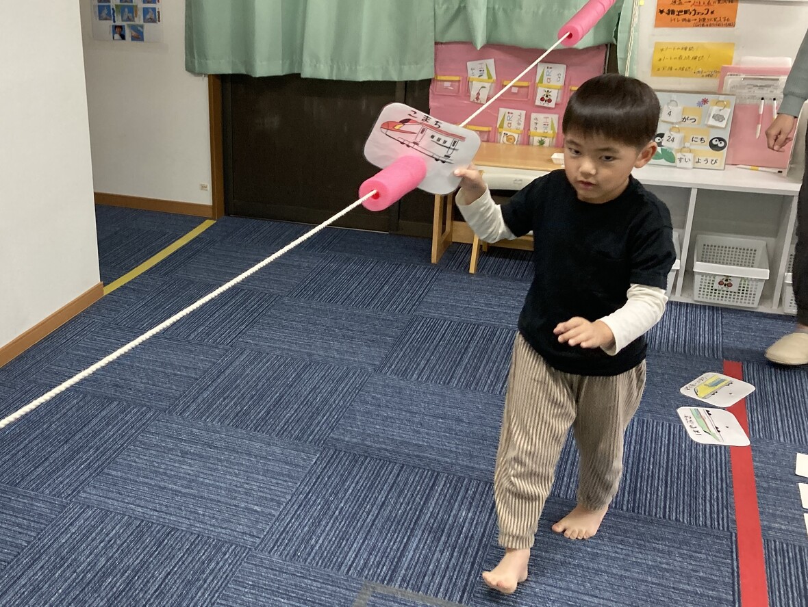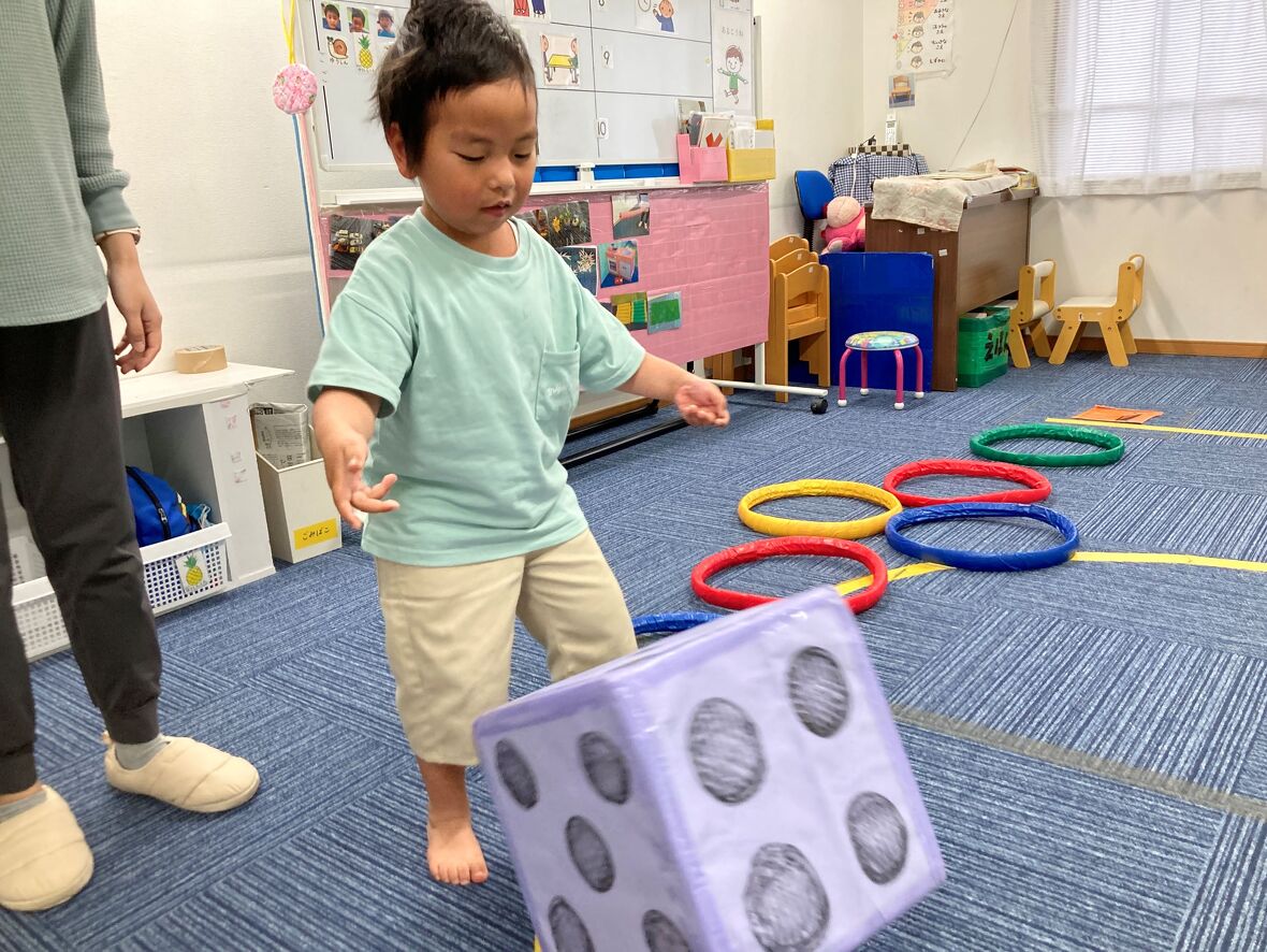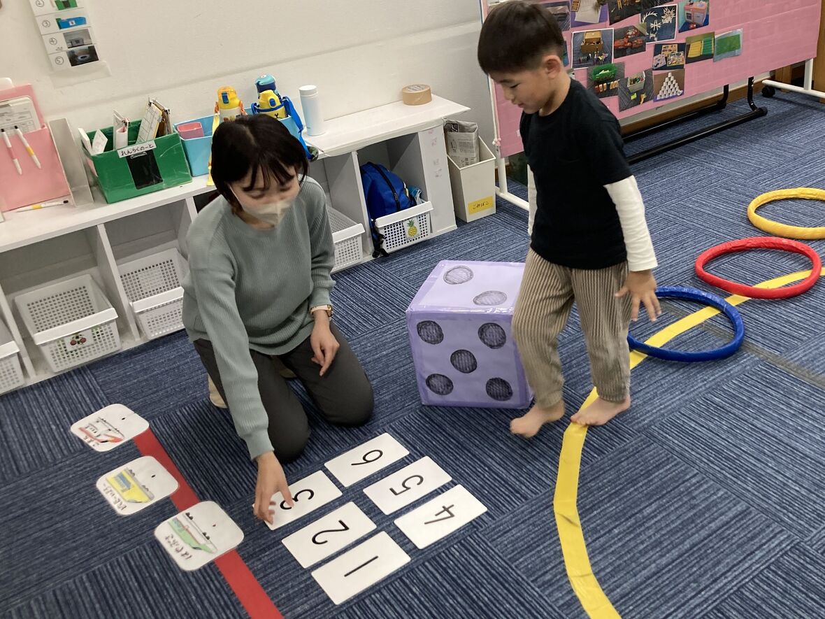 2024年04月24日(水) スタッフブログ サイコロを使ってサーキット! 今日はサイコロを使ってサーキットを楽しみました!サイコロで出た目と数字をマッチングして数を確認。その数だけ新幹線が進みます。数の概念を理解するうえで大切な遊びです。 大きなサイコロを振って・・・ サイコロで出た数字を探します ウレタンポールのそろばんを使って、出た数だけ新幹線が進みます