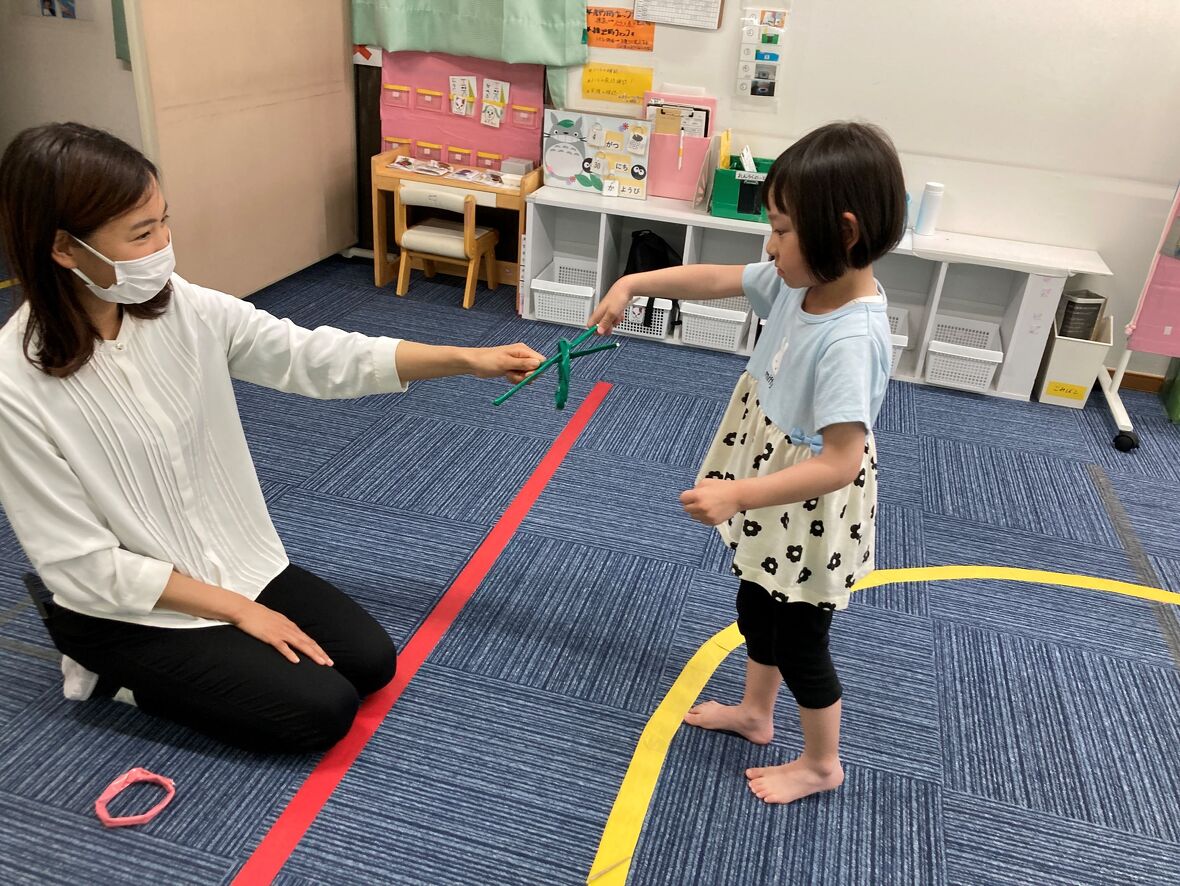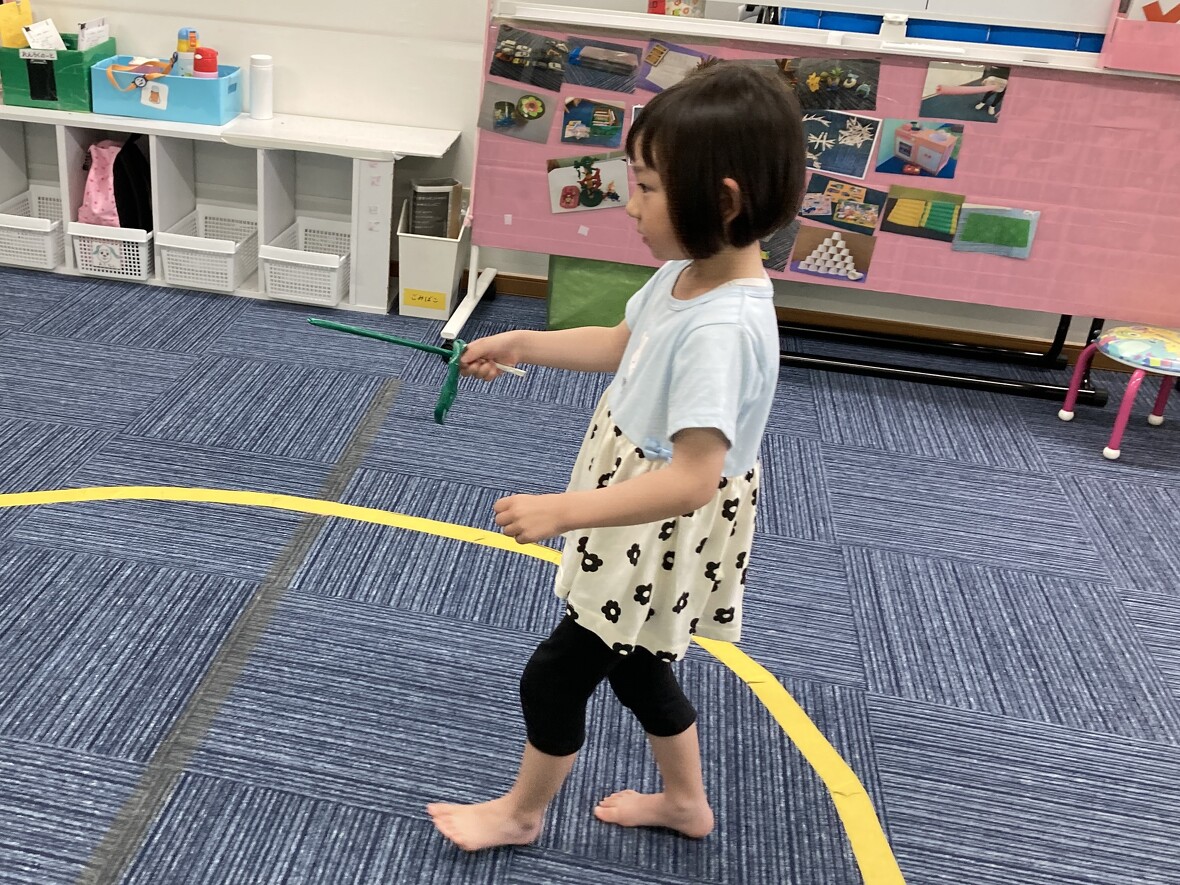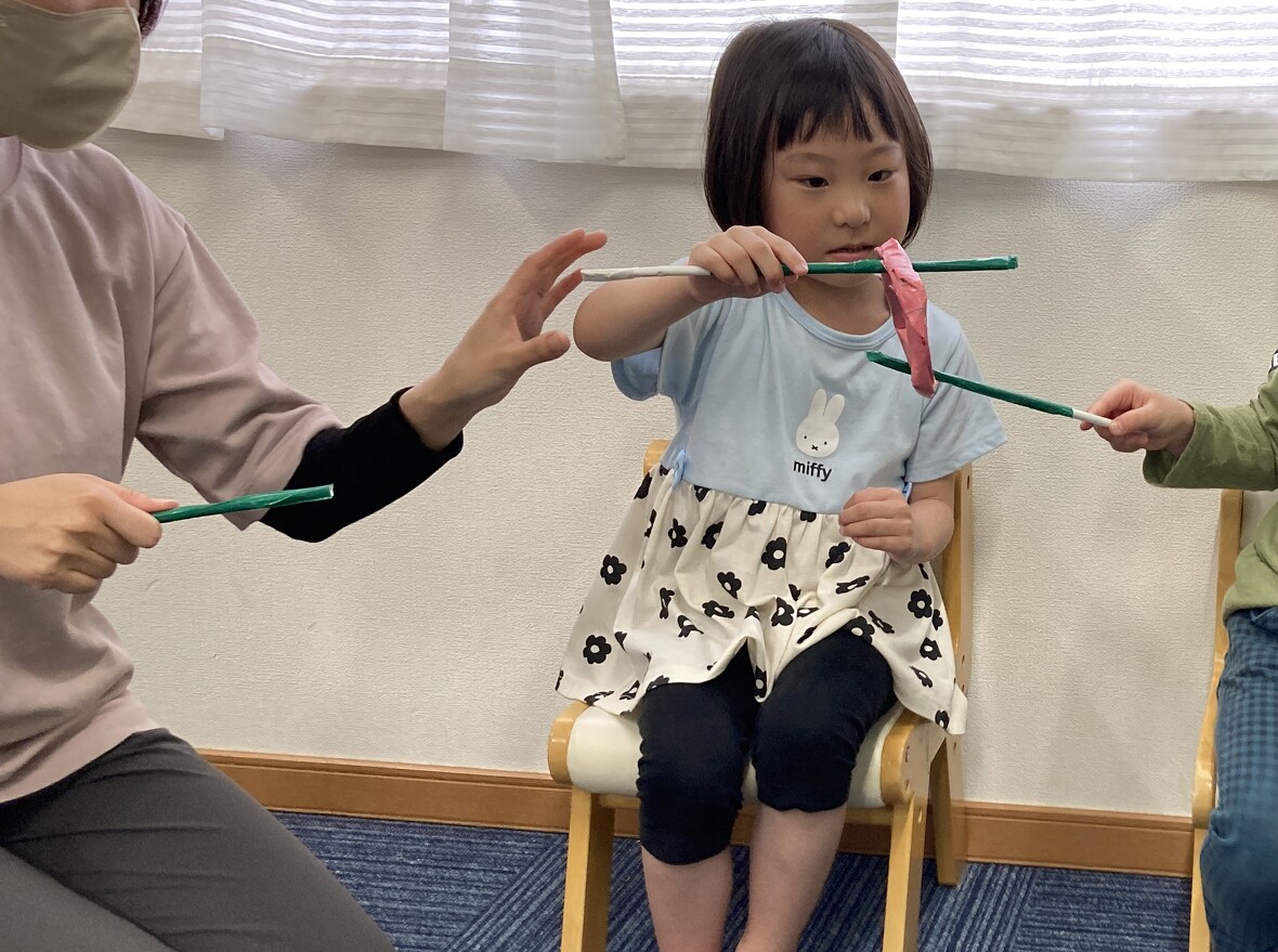 2024年04月30日(火) スタッフブログ そーっとそーっと輪っか渡し! 今日はステッキと輪っかを使って輪っか渡しに挑戦!そーっと運んでお友だちに渡す時は自分のステッキを輪っかから抜かないといけません。集中力を養うには最適なゲームですね。 そーっとそーっと・・・お隣さんにどーぞっ! お次はちょっと遠くまで歩いて運びます。 先生にハイ!どーぞっ!上手に渡せましたね!