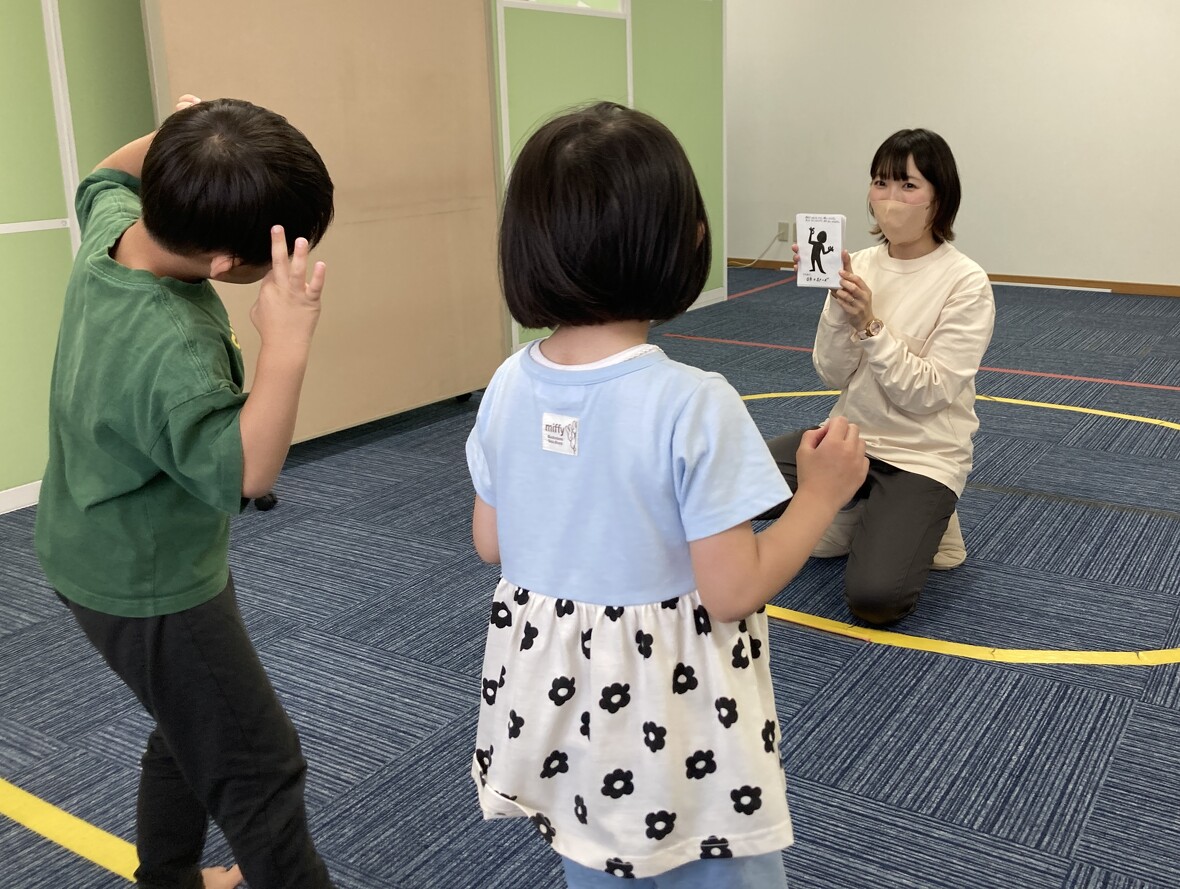 2024年05月14日(火) スタッフブログ ポーズカードゲーム! 今日はポーズカードを使ったプログラム。ピクトグラム(絵ことばと言われるイラスト)を描いたカードを見ながら、みんなに同じポーズをしてもらいました。途中から先生のことばの指示を聞いてポーズを決めてもらい、そのポーズが合っているかポーズカードを見ながら確認していきました。みんな上手にポーズを決めていました! これはどんなポーズかな? しっかりポーズカードを見てます。 ポーズカードと同じポーズですね! 他にもいろんなポーズをして楽しみました♩