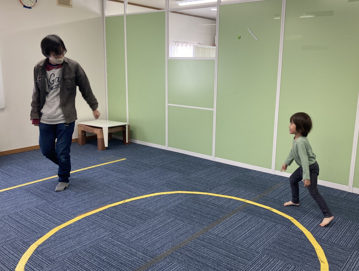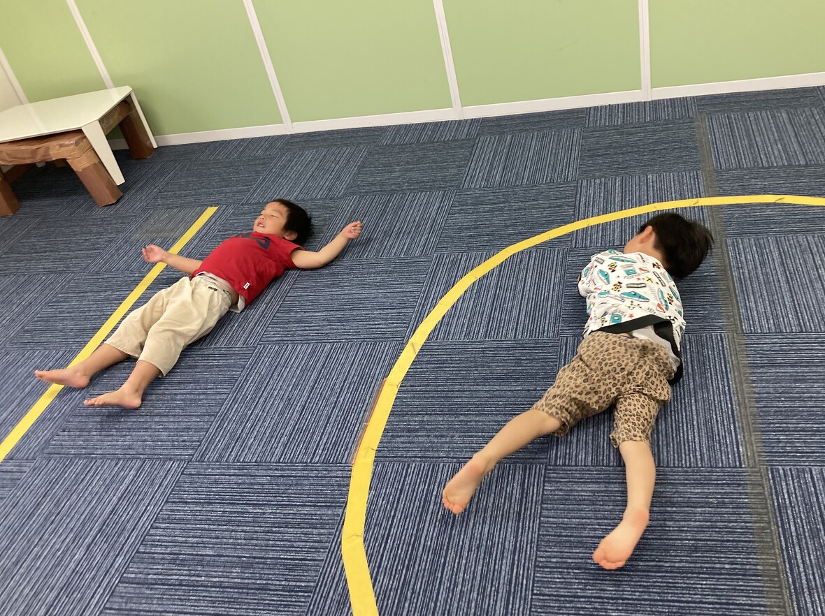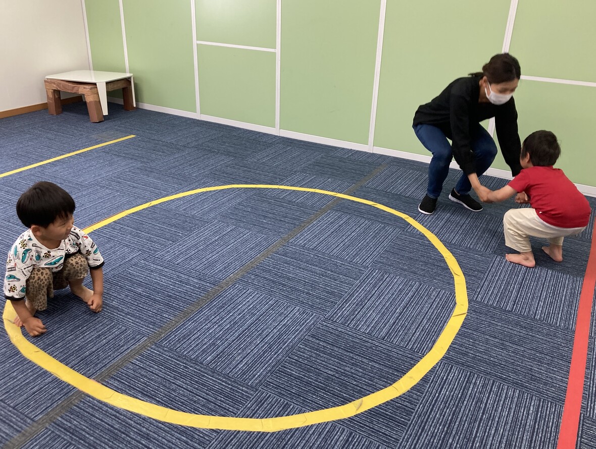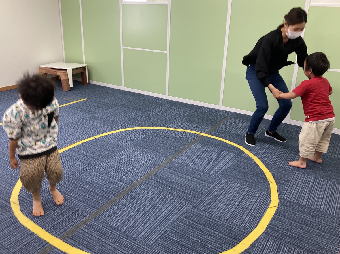 2024年05月15日(水) スタッフブログ リトミック♩ 今日は週1回のリトミックの日です!リズムに合わせて身体を動かしていきます! 先生の声掛けやピアノの音に合わせて、歩いたり、走ったり、いろいろな生き物に変身したりしました!! 黄色の丸の周りを先生のピアノに合わせて走ります! 今度はカエルになって跳びながら移動してます! 大きなカエルのジャンプ!! 最後はどんぐりになって左右に転がっています♩