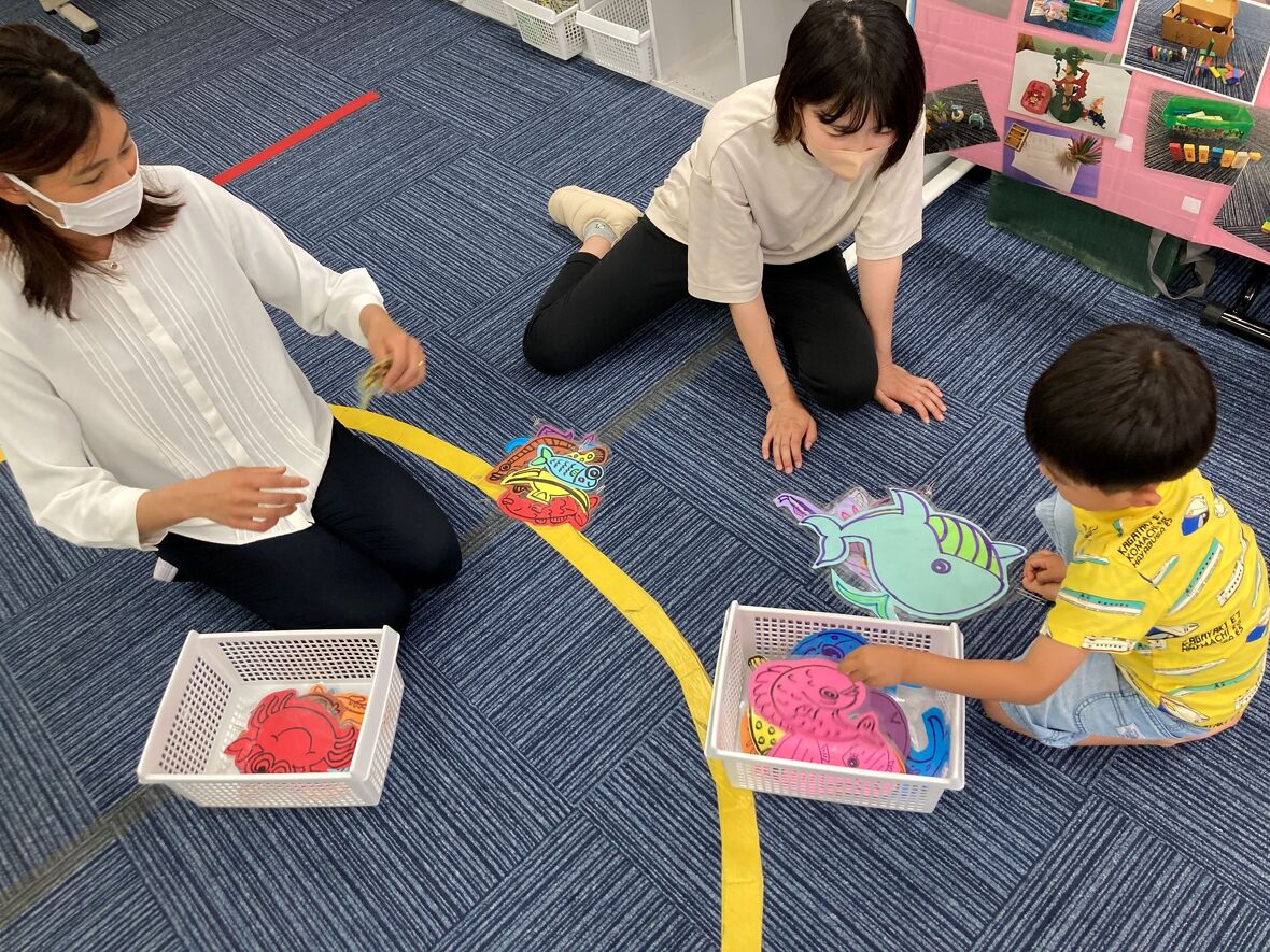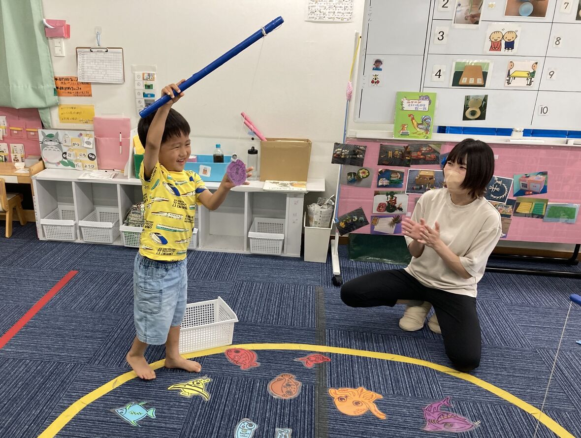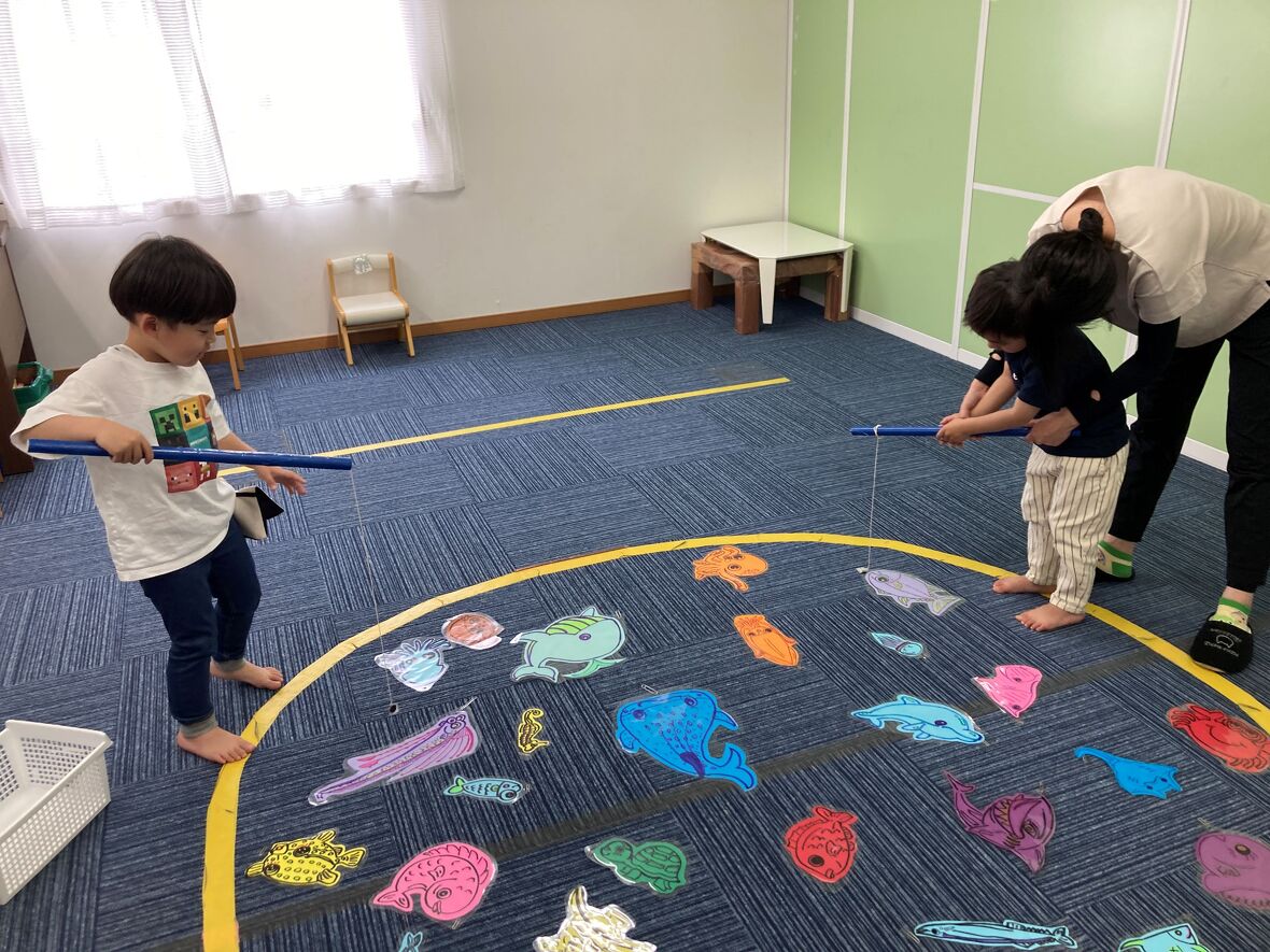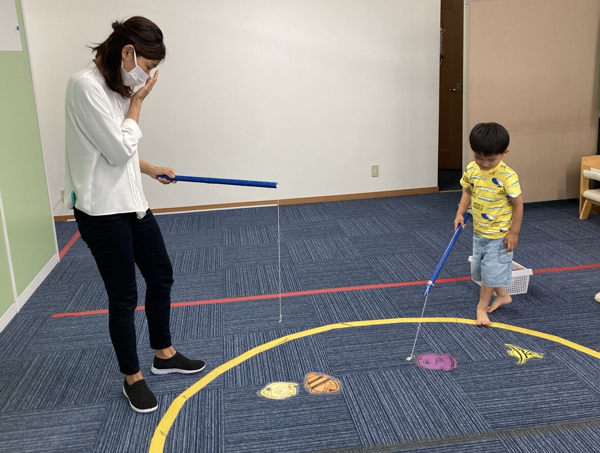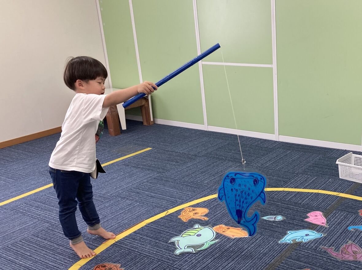 2024年05月22日(水) スタッフブログ 魚釣りを楽しもう!! 今日はみんなでお魚釣りをしました♩磁石がついている竿を持って、クリップをつけた魚を釣り上げます! 磁石とクリップがしっかりくっつくように、みんな集中して、慎重にゆっくりお魚を釣り上げていました! お魚釣れるかな…? 上手に釣れています! 今度は大きい魚が釣れました!! 先生と対決! どっちがたくさん釣れたか、数えてますね。