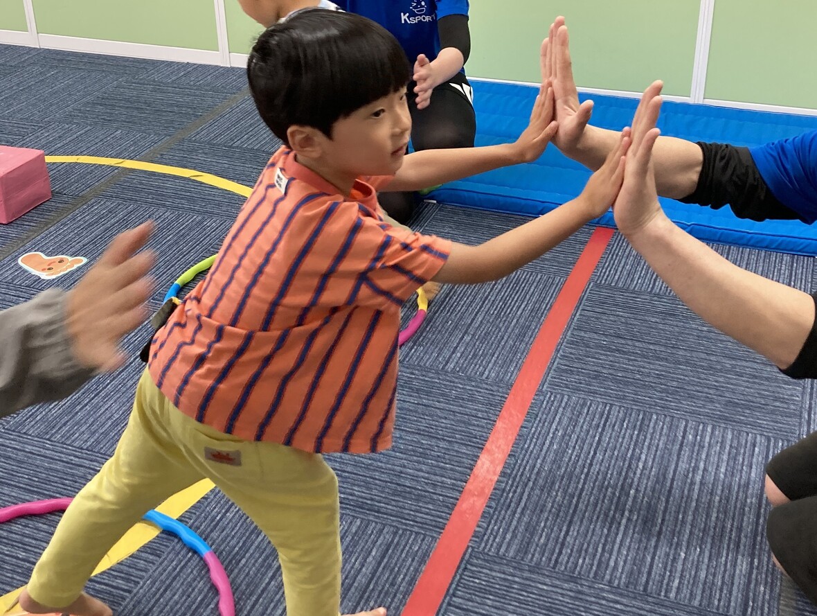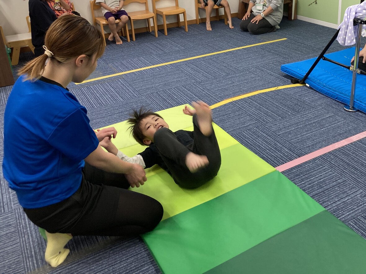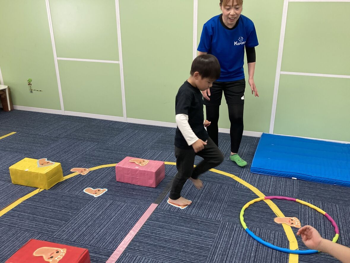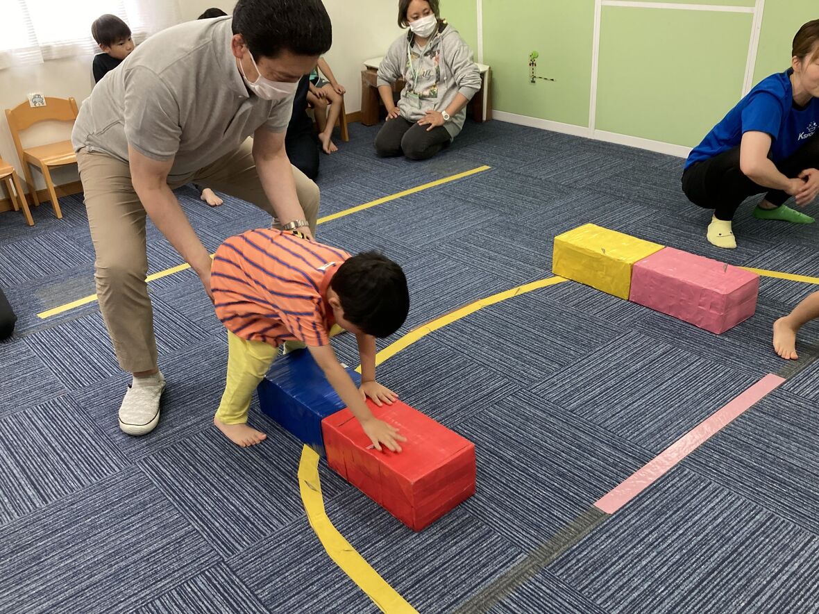 2024年05月31日(金) スタッフブログ ミポ先生と体操♩ 毎週金曜日はミポ先生の体操の日。いつものようにマットや鉄棒にチャレンジしました!ミポ先生は毎回面白い遊びを使って、体を鍛えられよう教えてくれます♩今日はダンボールボックスやフラフープでサーキットをつくり、コースに貼った手形や足形にそって四つ這いの「クマさん歩き」で進んでいきます♩腕を支える力をしっかりと使うことができますよ。サーキットの後は、マットで「でんぐり返し」も練習しました。 足形をなぞって慎重に渡ります。 出来たら先生にハイタッチ♩ 今度は「クマさん歩き」で進みます! 前転の練習!! くるりんぱ!!!