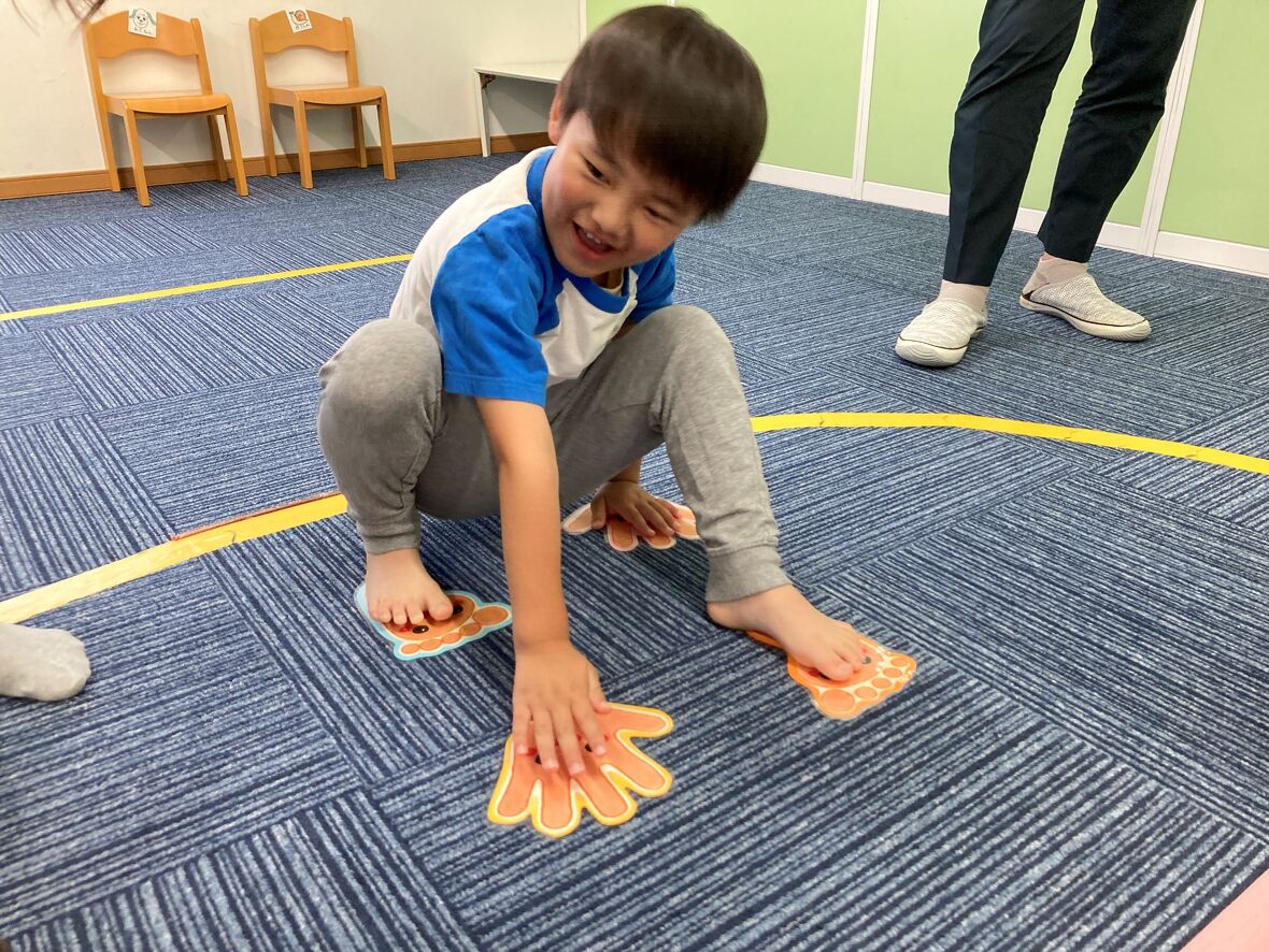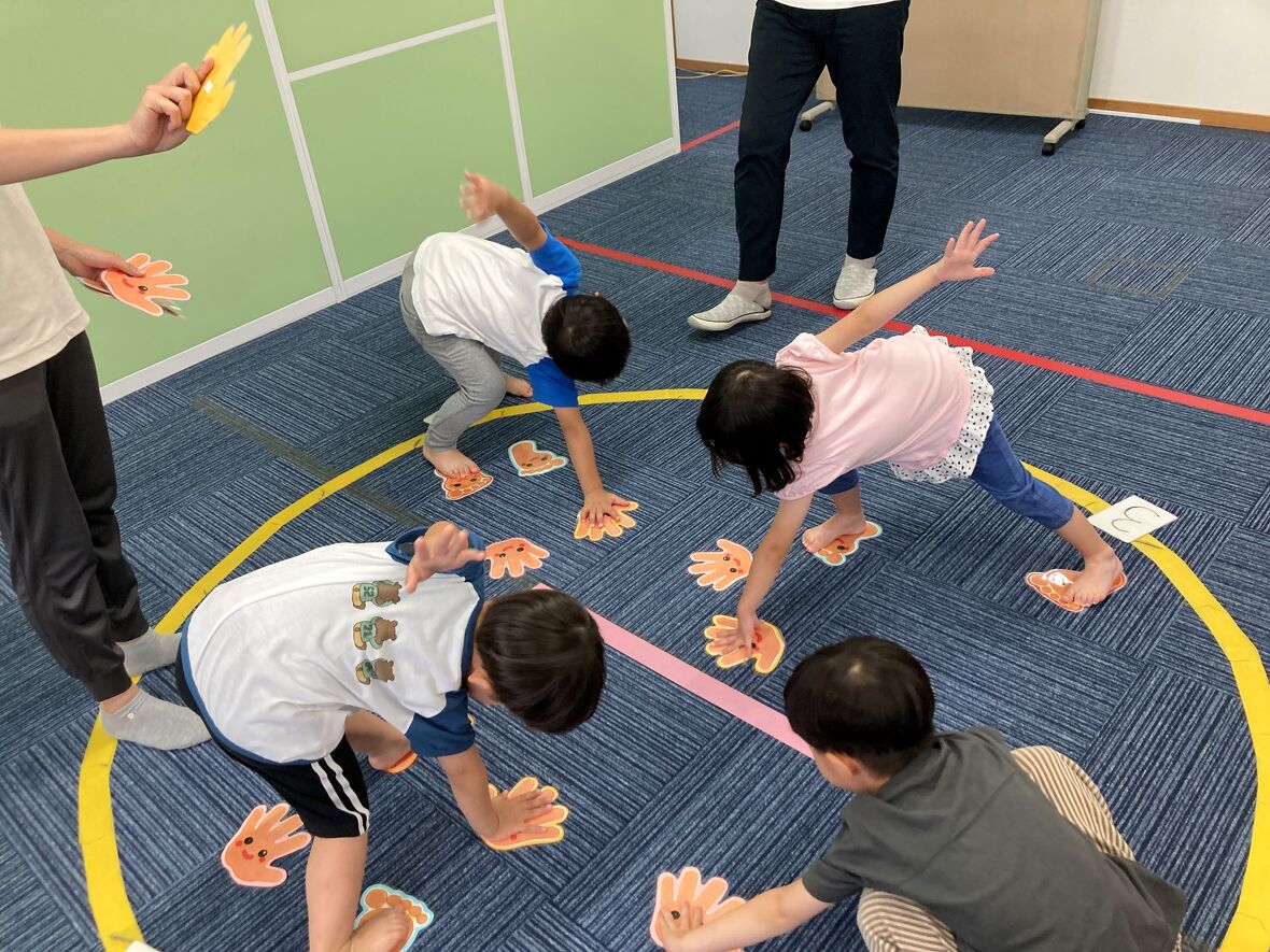 2024年06月18日(火) スタッフブログ ツイスターゲームを楽しみました ツイスターゲームは柔軟性やバランス力、体幹を育むことができるうえに、体のどこを動かすかというボディーイメージの発達につながります。姿勢を保つ筋力を育てると、普段の生活や勉強、運動などにスムーズに取り組みやすくなります。今日はそのツイスターゲームをみんなで行いました! 説明をしています。 先生の指示を聞き、「足型・手形」の上に足と手を置きます。 足と手を置いたら、10秒キープ! みんなよく出来ました♩
