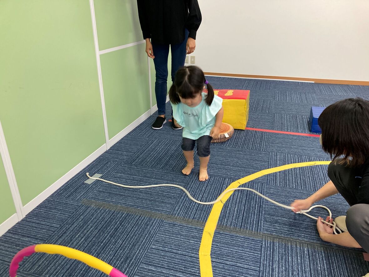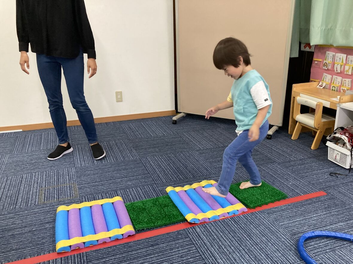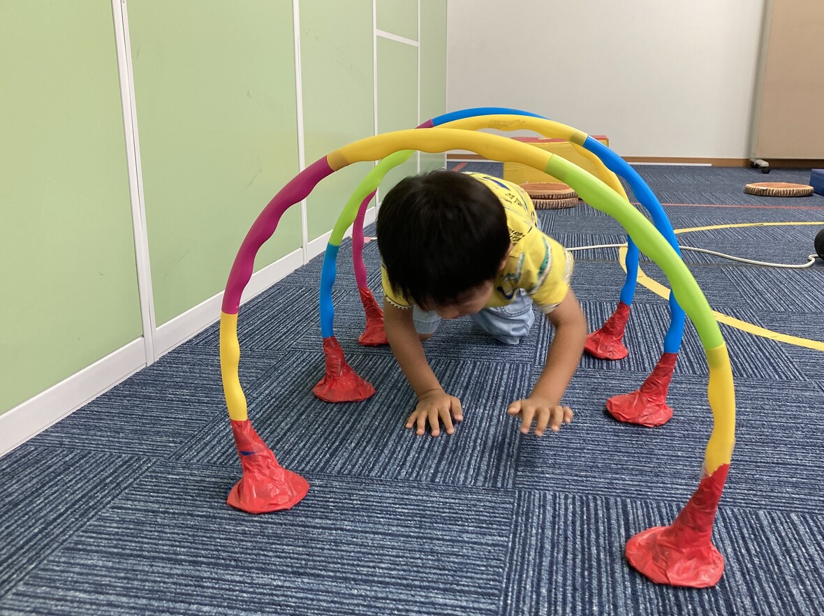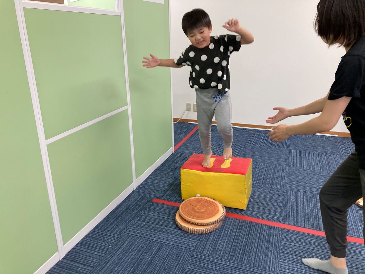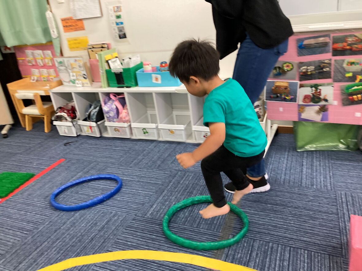 2024年06月20日(木) スタッフブログ みんなでサーキット! 今日はみんなでサーキット遊びをしました!輪っかやダンボールボックス、クッション、縄などを使って作った ジャンプ運動メインのサーキット☆彡上手にジャンプしながら前に進むことが出来ていました! 輪っかの中をジャンプ~ 足の裏を刺激します! 高い台の上から思いっきり…ジャンプ! 「ニョロニョロ」縄のヘビさん!引っかからずにジャンプ出来ました☆ フープをくぐって席に戻ります!