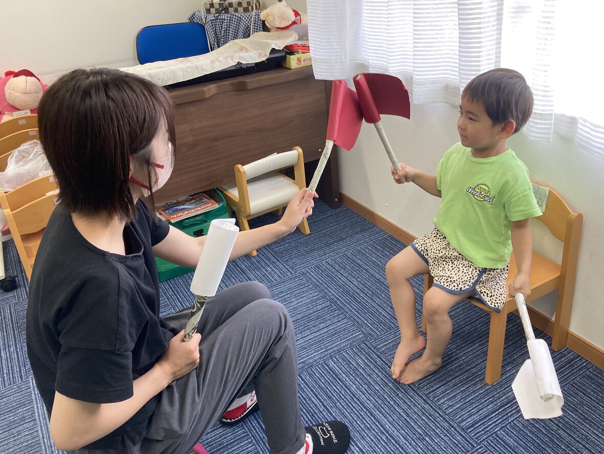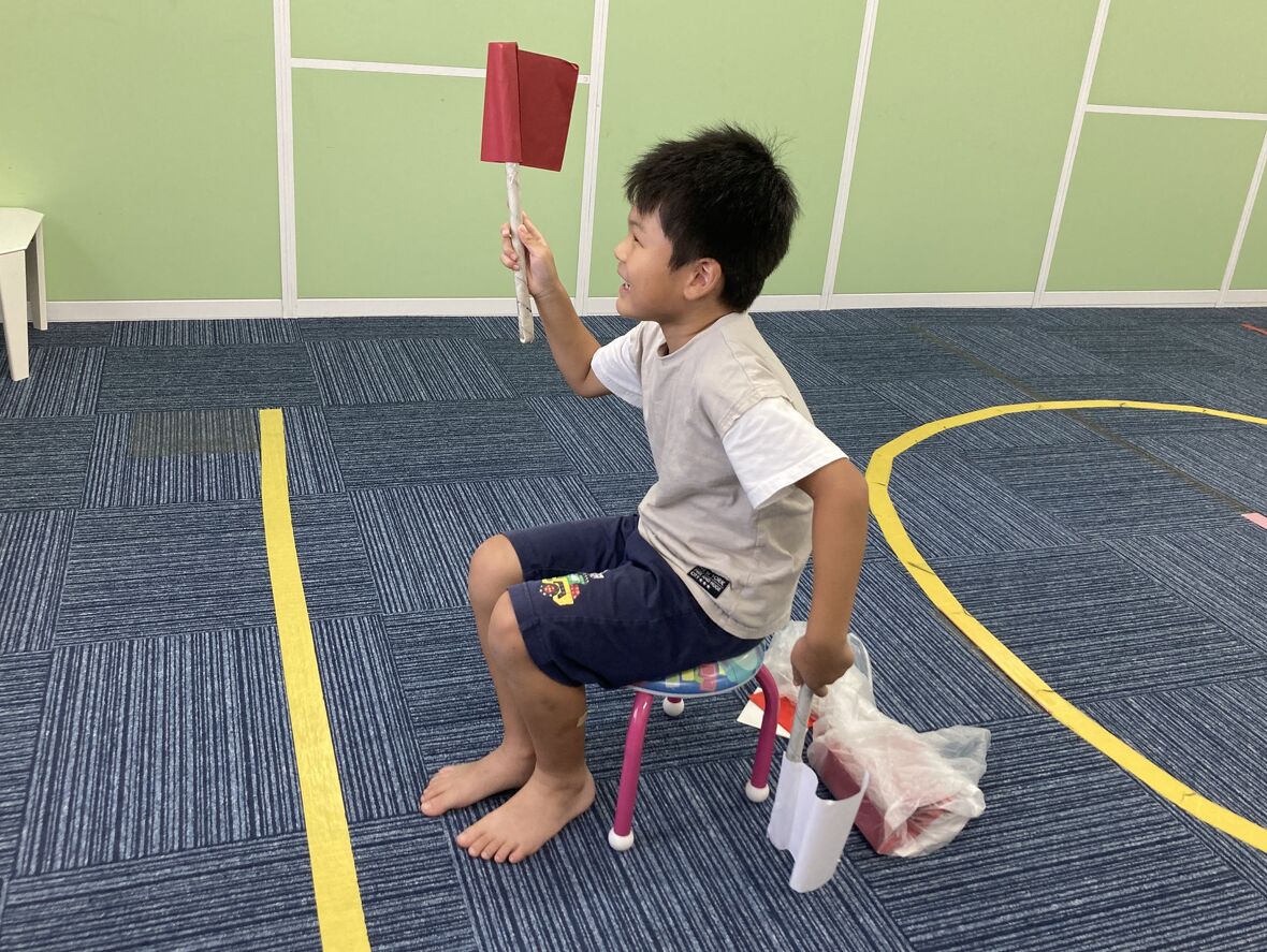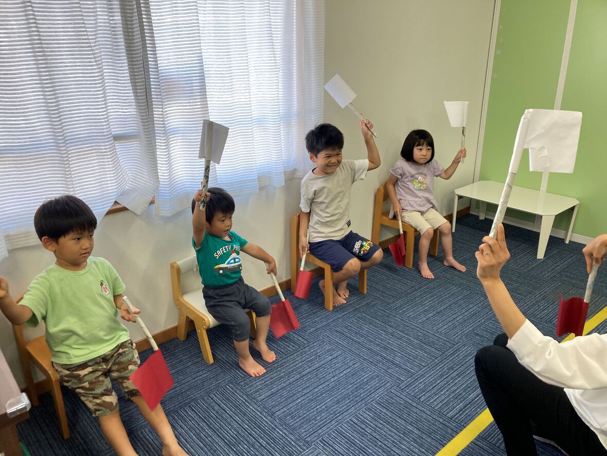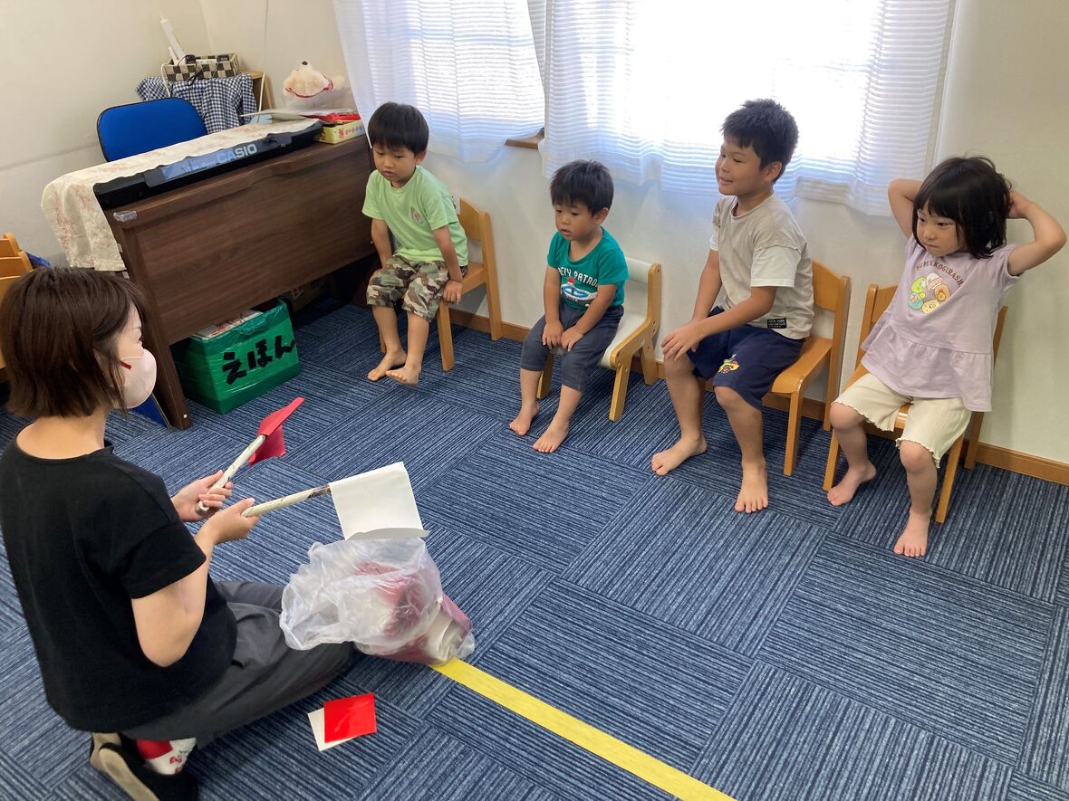 2024年07月03日(水) スタッフブログ 旗上げゲーム! 今日の活動は旗上げゲームです。右左の手に「赤い旗」「白い旗」をそれぞれに持ち、先生の出される指示の通りに旗を上げ下げする遊びです。指示を聞き、旗の色を見ることで、聞く力や模倣する力、集中力を高めることが出来ます。また、考えて行動することで子どもの思考力の向上にもつながります。 先生の説明を聞いてます。 先生と同じ赤!確認してます。 先生が白を挙げているので、みんなも白をあげています! 最後は子ども達に先生役をしてもらいました!