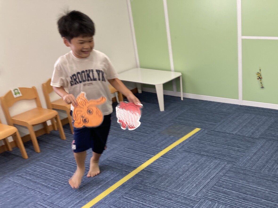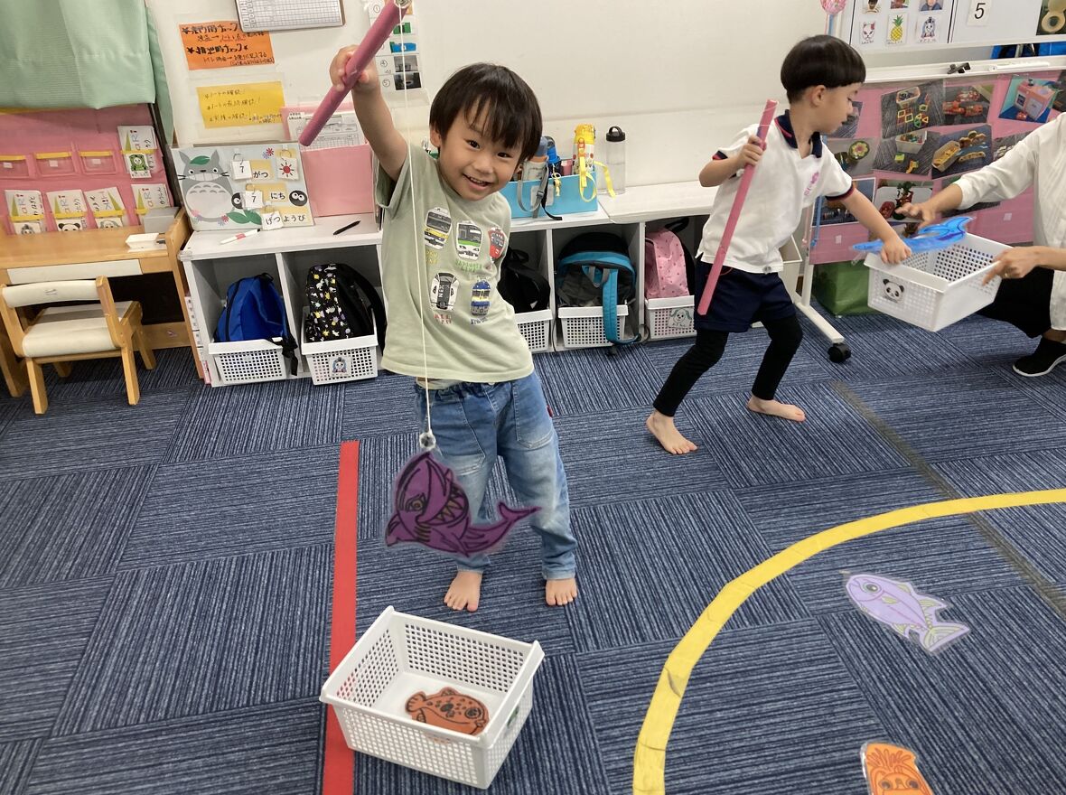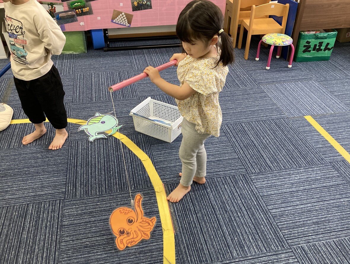 2024年07月08日(月) スタッフブログ お魚釣りゲーム 今日の活動はみんなでお魚釣りゲームです!お魚を釣る前に先生が部屋中にお魚を隠します。隠されたお魚をみんなで探して池(黄色い丸の中)に戻してお魚釣を楽しみました♩ 2匹見つけた~♩ ここにもお魚さん♩ 見つけた魚を釣るぞ~! 上手に釣れました♩