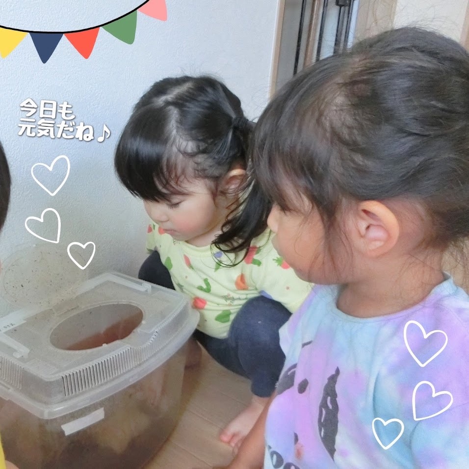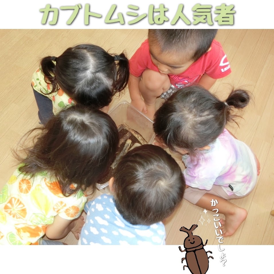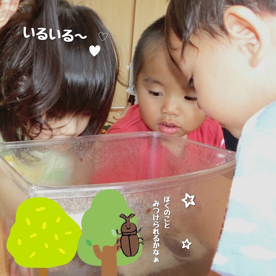 2024年09月04日(水) スタッフブログ おひさまぐみ/昆虫観察 少し前からおひさまぐみのお部屋には カブトムシが仲間入りしました(^o^) 朝の自由時間など、虫かごの周りに集まり 中をのぞいてカブトムシを探すのが日課に なっています♫ ゴソゴソと動くカブトムシを確認し 満足そうにしていますよ(^^)♪