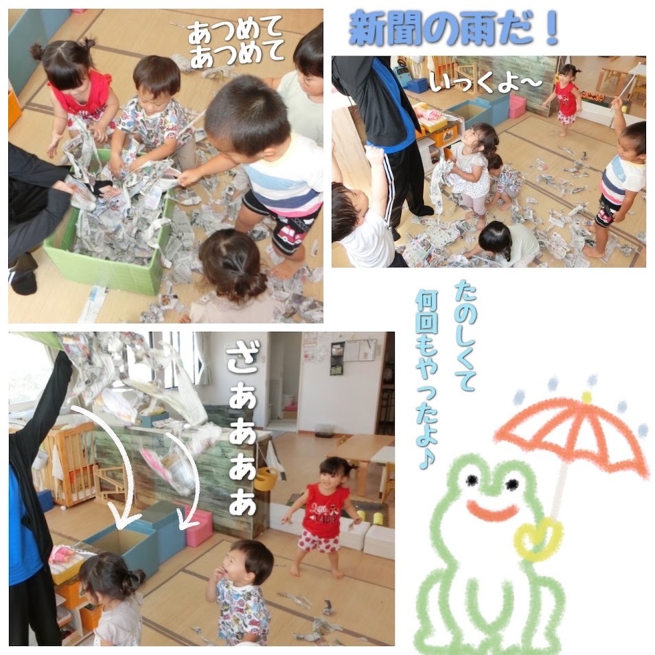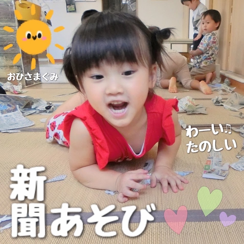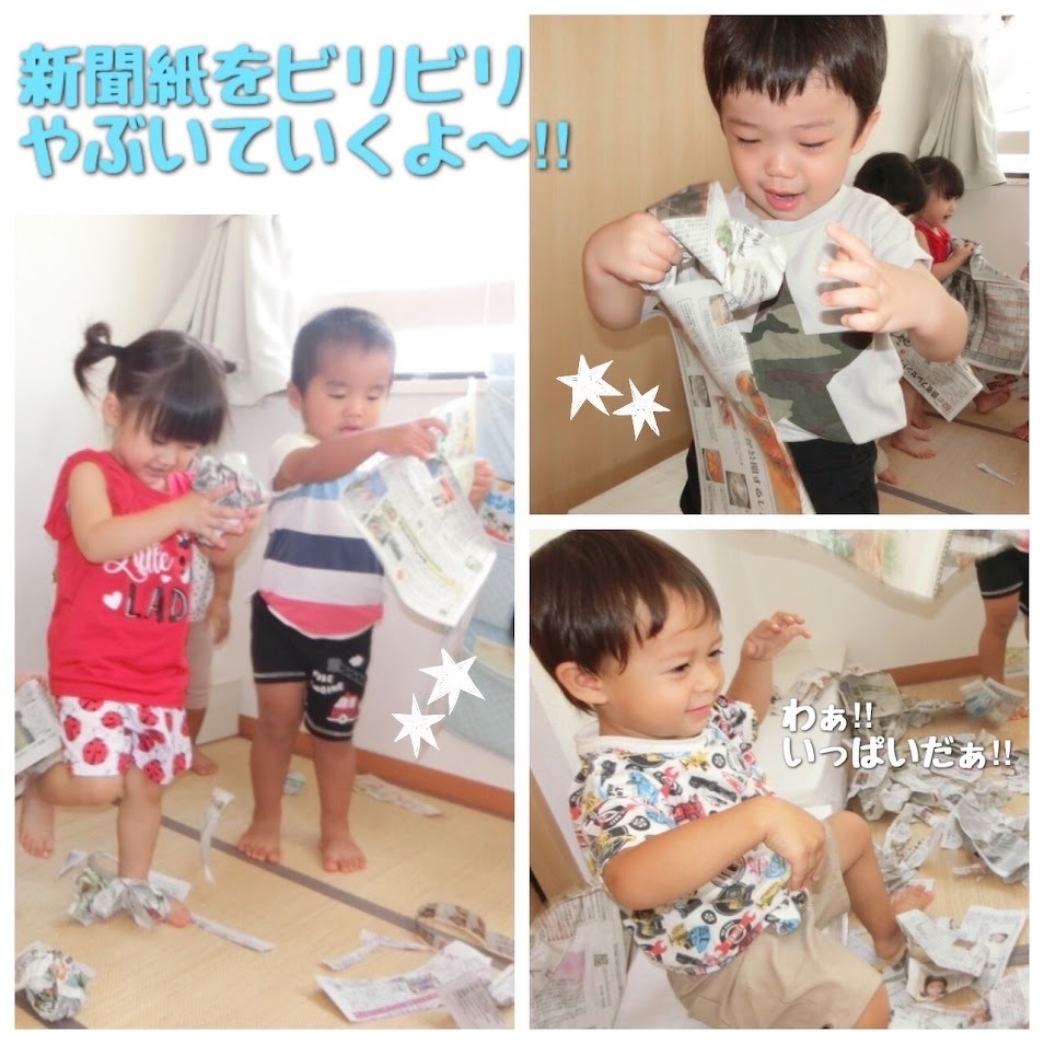 2024年09月20日(金) スタッフブログ おひさまぐみ/新聞あそび おひさまぐみで新聞あそびをしました(^o^) 新聞紙を持ち、手を前後左右に動かしながら ビリリリリ~とやぶいていきます☆彡 小さくやぶいたり、棒状にしたり、形を作った り、思い思いに楽しみます(^^)♪ やぶいた新聞紙をダンボールにあつめて 先生が上からザァーっと降らせると、みんな キャッキャと大喜び♫ 「もう1回!!」と繰り返しやりました(^_^)