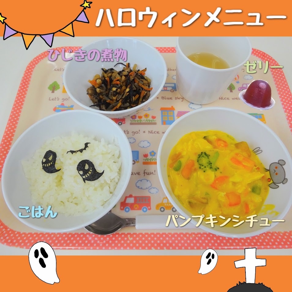2024年10月31日(木) スタッフブログ 給食/ハロウィンメニュー HAPPY HALLOWEEN!! 今日の給食は ・パンプキンシチュー ・ひじきの煮物 ・ごはん ・ゼリー でした(^_^)♪ ハロウィンパーティーの様子も後日 ご紹介する予定です!! お楽しみに(^_-)-☆