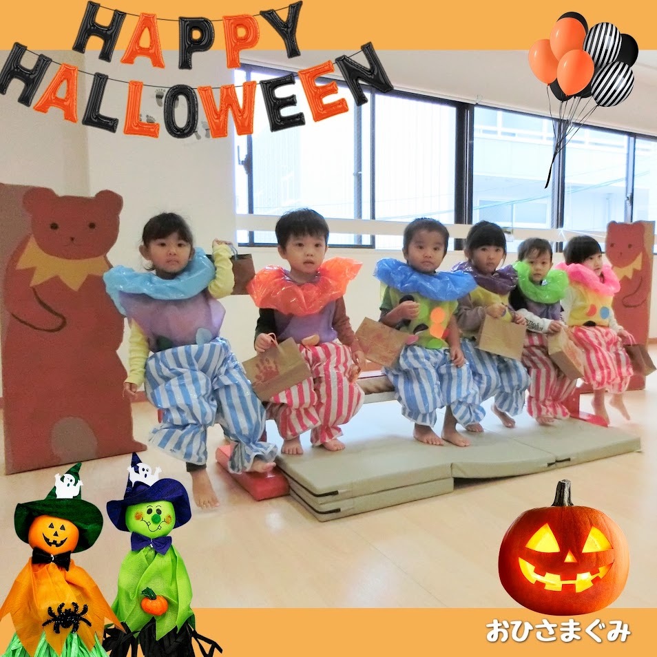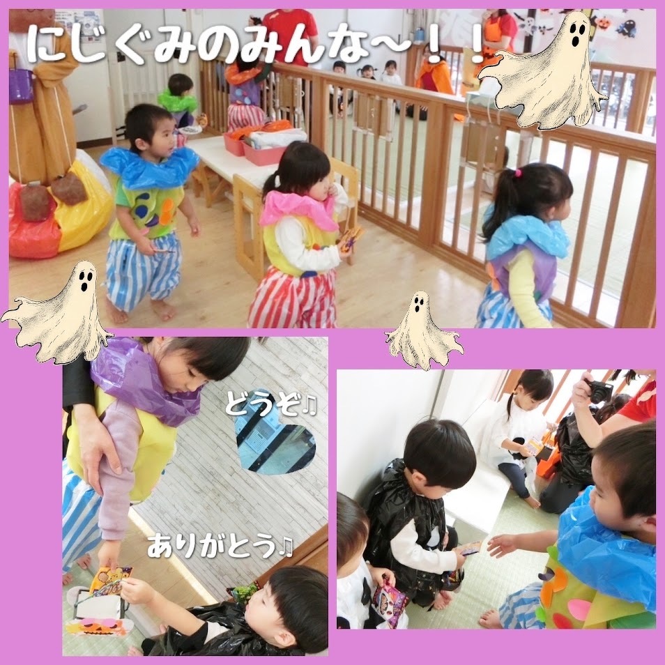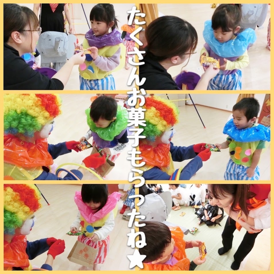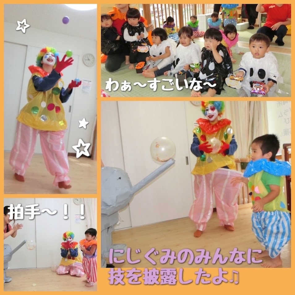 2024年11月05日(火) スタッフブログ おひさまぐみ/ハロウィン おひさまぐみのハロウィンの様子です(^o^) ピエロの修行を経て、にじぐみにお菓子を 配ったり、技を披露しに行きました♪ たくさんお菓子をもらって、嬉しそうな 子どもたちでした(^^)☆