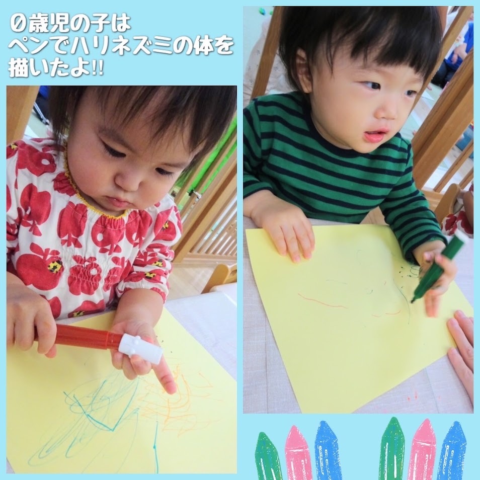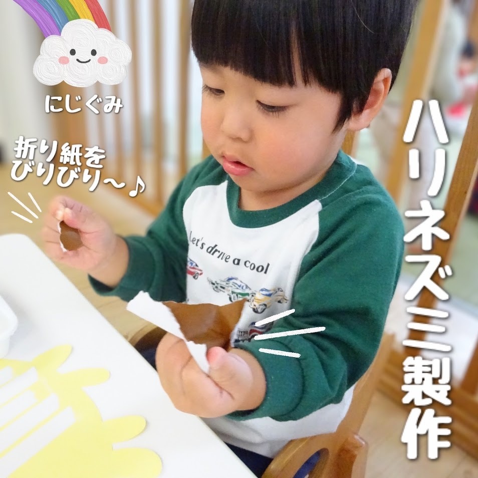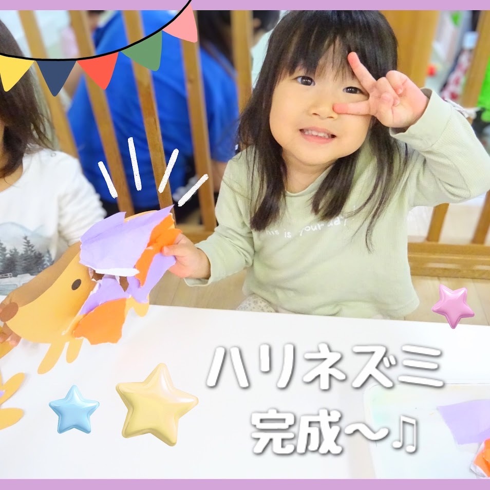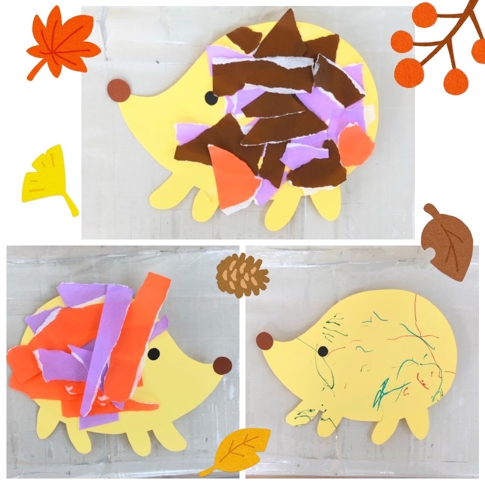 2024年11月29日(金) スタッフブログ にじぐみ/ハリネズミ製作 にじぐみのみんなでハリネズミ作り(^o^) まずは折り紙をちぎります! 小さ~くちぎったり、細長~くちぎったり 子どもたちの個性が溢れますね(^^)♪ 両面テープの剥離紙も先生に手伝って もらいながらゆっくりと剥がし、そこに ちぎった折り紙を貼り付けていきます☆彡 0歳児の子は画用紙にペンで『ハリ』を描き ました!! かっこいいハリネズミ、可愛いハリネズミ いろんなハリネズミが出来ました♫
