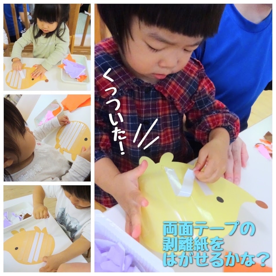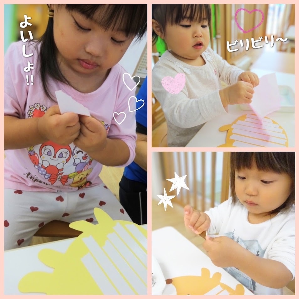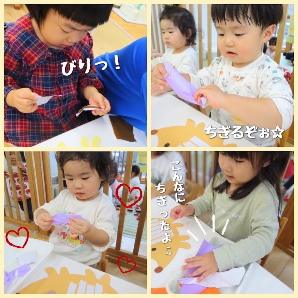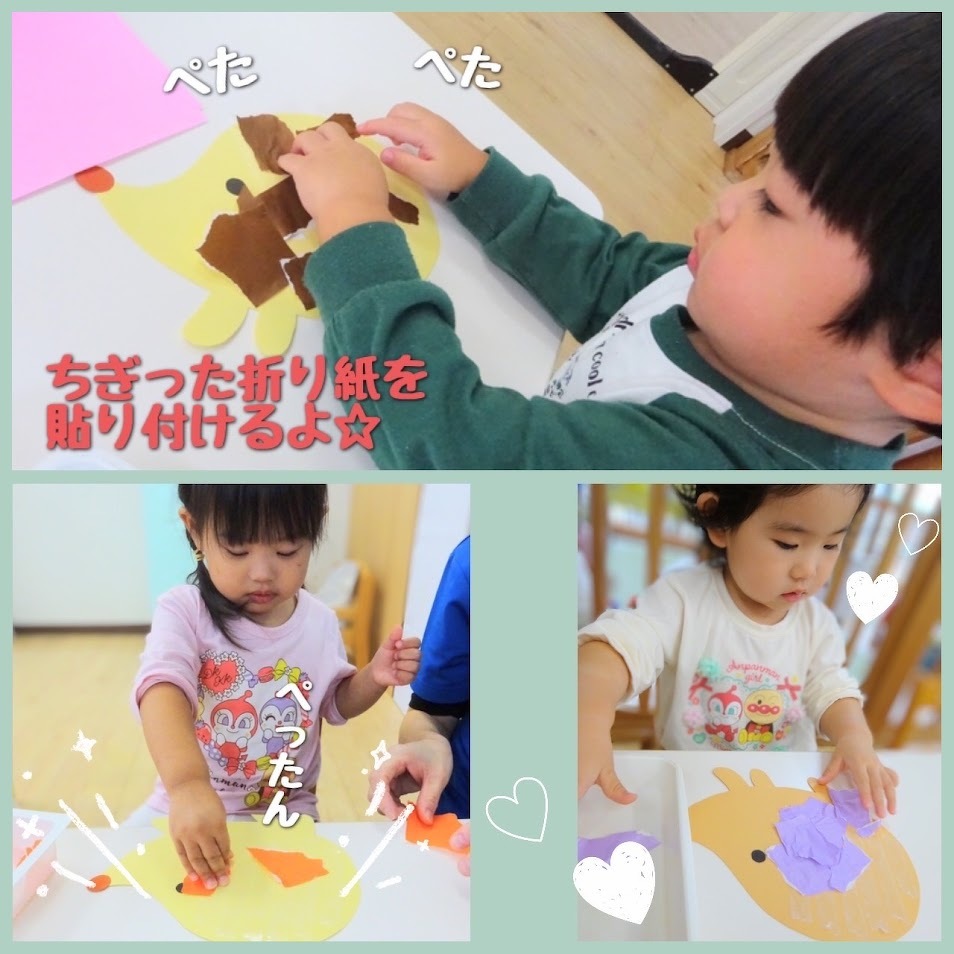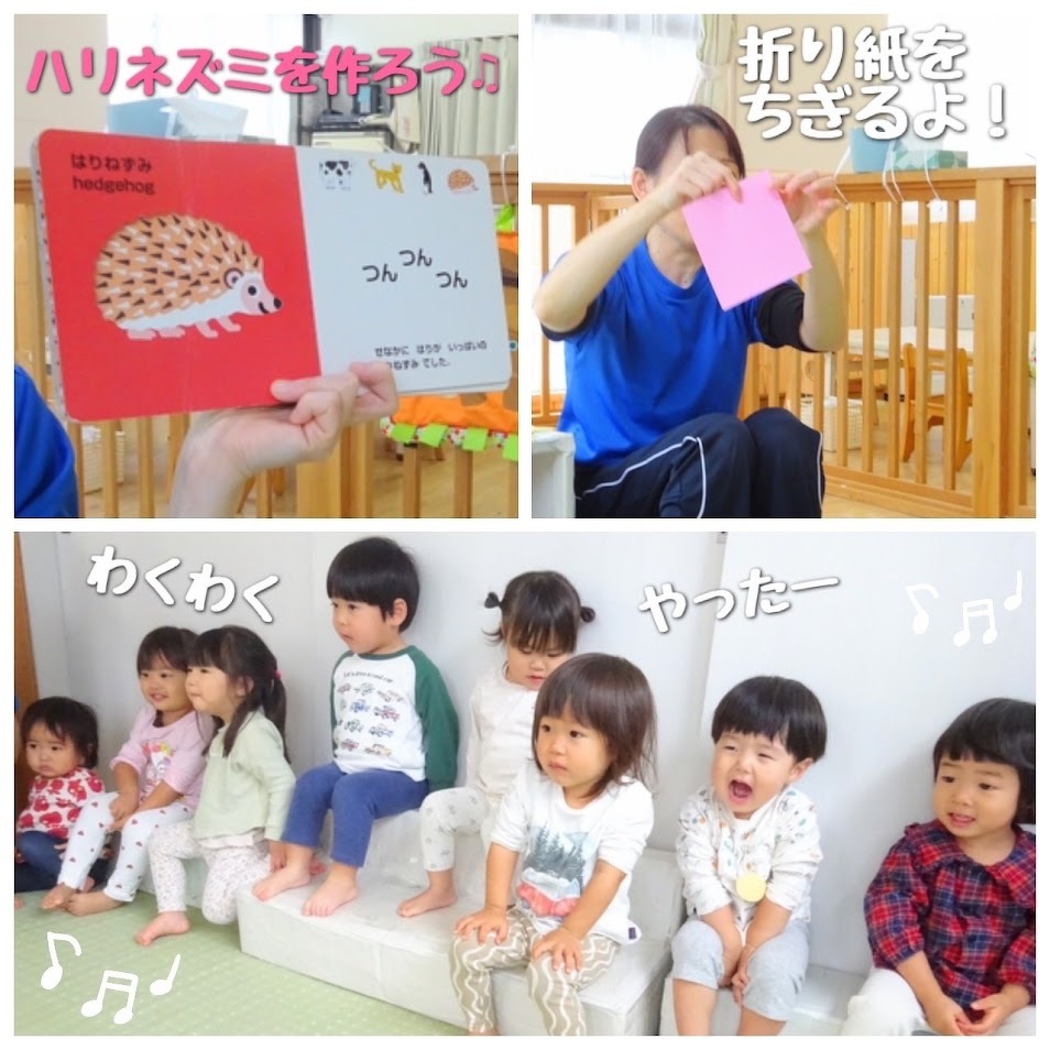 2024年11月29日(金) スタッフブログ にじぐみ/ハリネズミ製作 にじぐみのみんなでハリネズミ作り(^o^) まずは折り紙をちぎります! 小さ~くちぎったり、細長~くちぎったり 子どもたちの個性が溢れますね(^^)♪ 両面テープの剥離紙も先生に手伝って もらいながらゆっくりと剥がし、そこに ちぎった折り紙を貼り付けていきます☆彡 0歳児の子は画用紙にペンで『ハリ』を描き ました!! かっこいいハリネズミ、可愛いハリネズミ いろんなハリネズミが出来ました♫