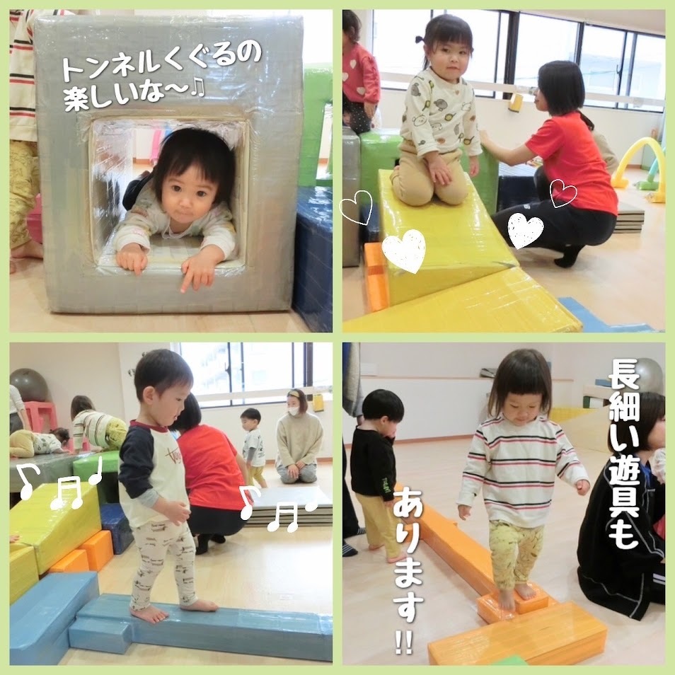 2024年12月06日(金) スタッフブログ 園開放の様子/0歳児、1歳児 先日の園開放の様子をご紹介します(^o^) 階段、トンネル、坂道、一本橋など様々な形を した遊具で身体を動かします! 低月齢のお子さんが遊びやすい柔らかい マットや低めの遊具もあります♫ 先生と話したり、保護者の方同士での情報交換 などができる場にもなっています(^^)♪ 月に一度の園開放にぜひご参加ください☆彡