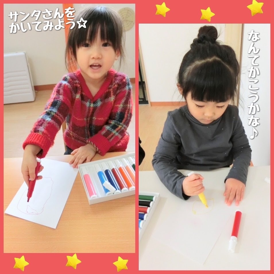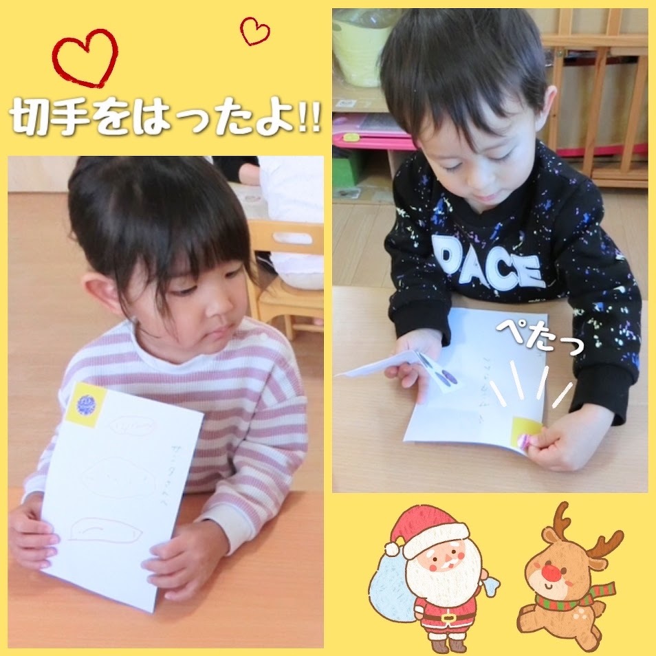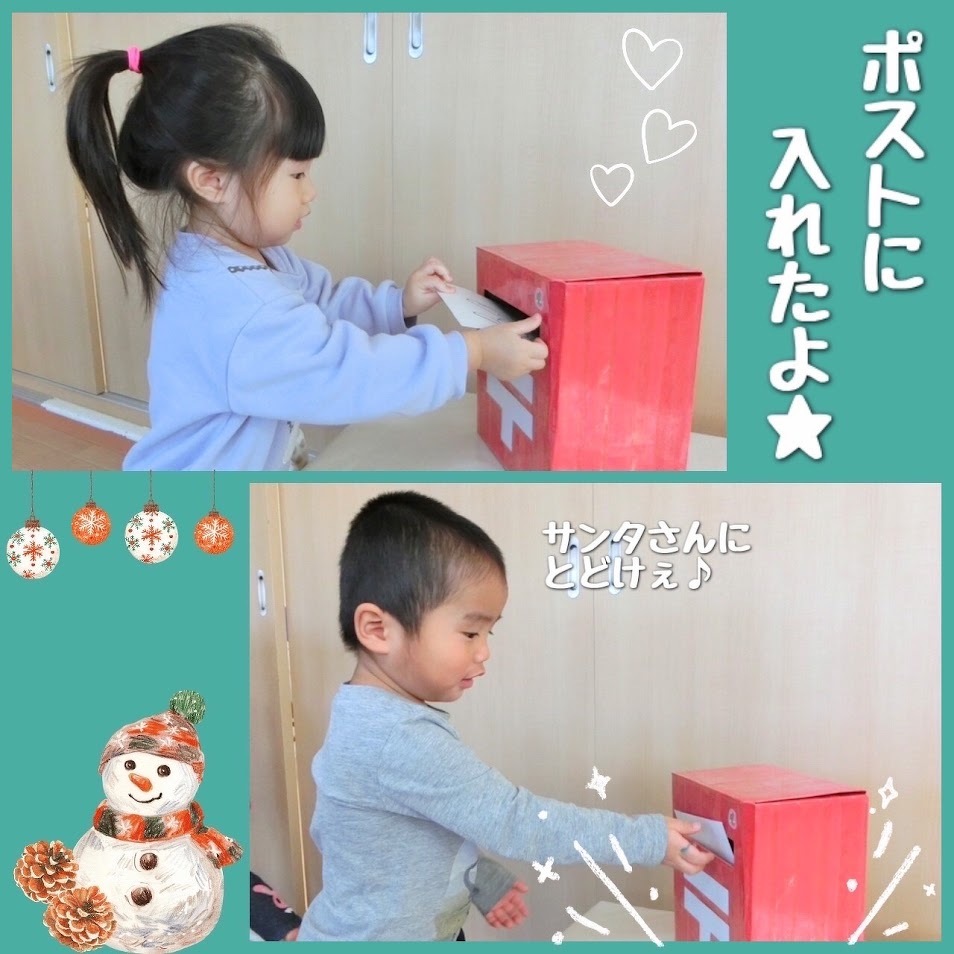 2024年12月24日(火) スタッフブログ おひさまぐみ/お手紙 先週、おひさまぐみのみんなでサンタさんへ お手紙を書いた時の様子です(^o^)♫ プレゼントをお願いしたり サンタさんの顔を書こうとしたり… 思い思いに書きました☆彡 書いたお手紙は切手をはって ポストへ~!!! クリスマスにワクワクしている 子どもたちが可愛いですね(^^) 楽しいクリスマスになりますように♪