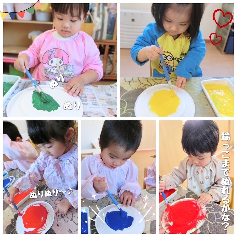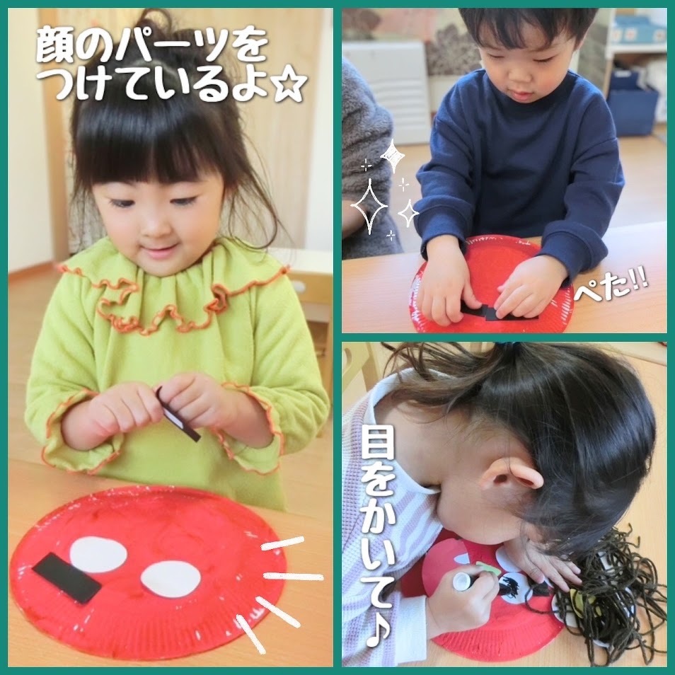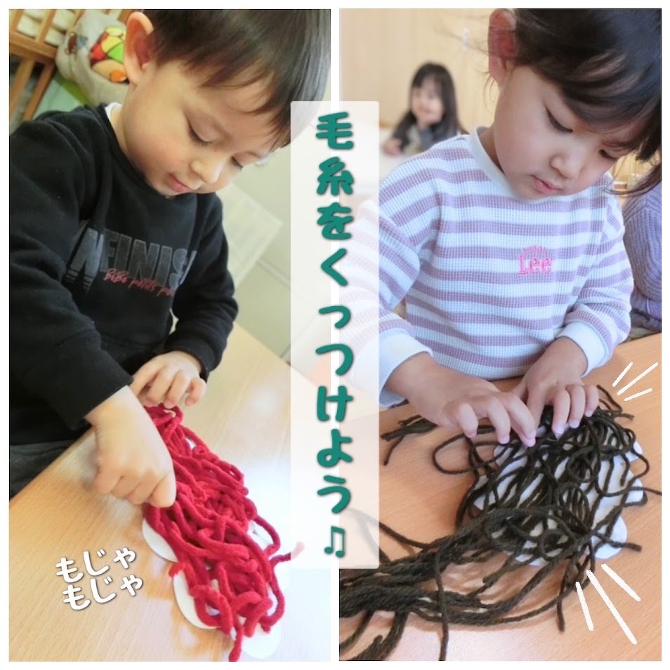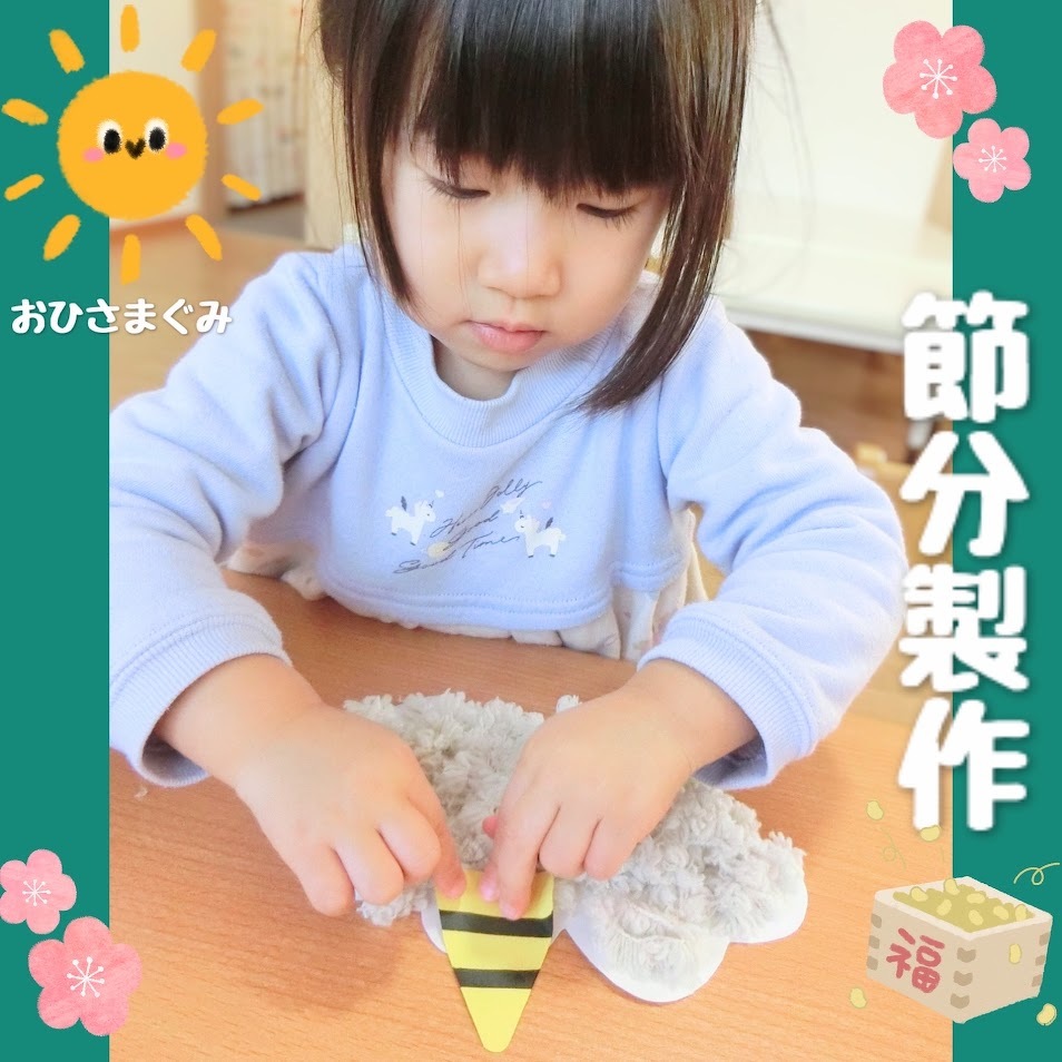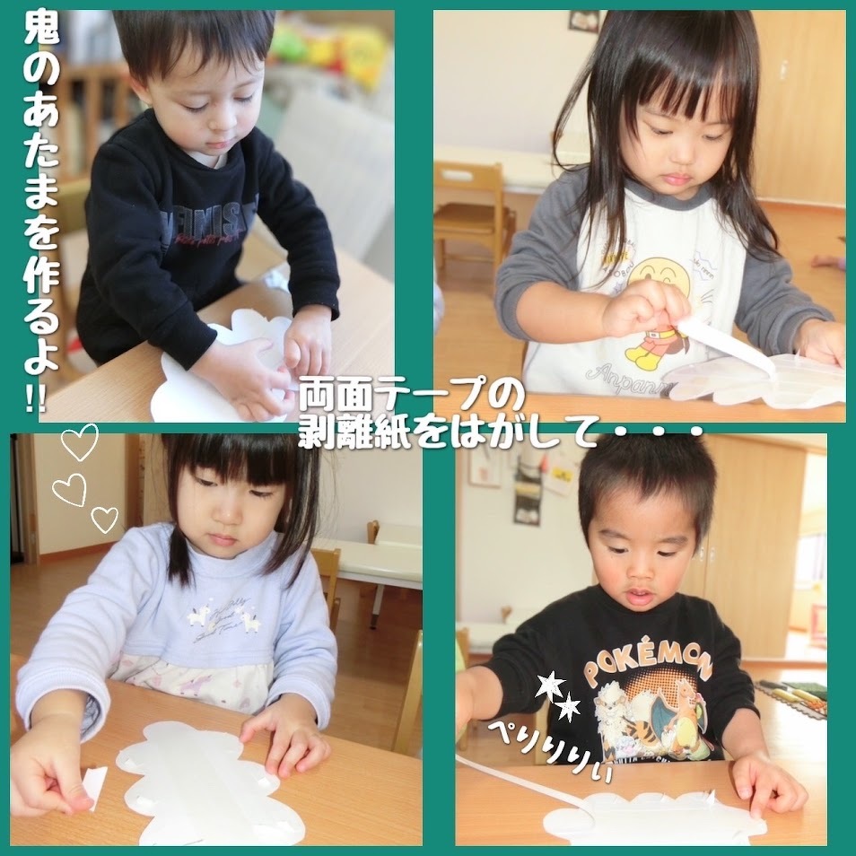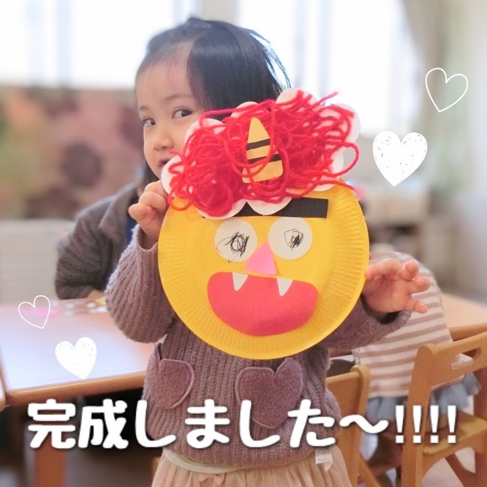 2025年01月29日(水) スタッフブログ おひさまぐみ/節分製作 おひさまぐみのみんなで鬼を作りました(^o^) まずは好きな色を選んで、白いところがなく なるように台紙をしっかりと塗っていきます! つぎは頭づくり☆ 両面テープの剥離紙をはがし、その上から 毛糸をくっつけていくと・・・ 鬼のもじゃもじゃ頭に♫ 最後に顔のパーツを台紙に貼り付けて、完成!! 節分会への準備が着々とすすんでいますよ(^^)♪