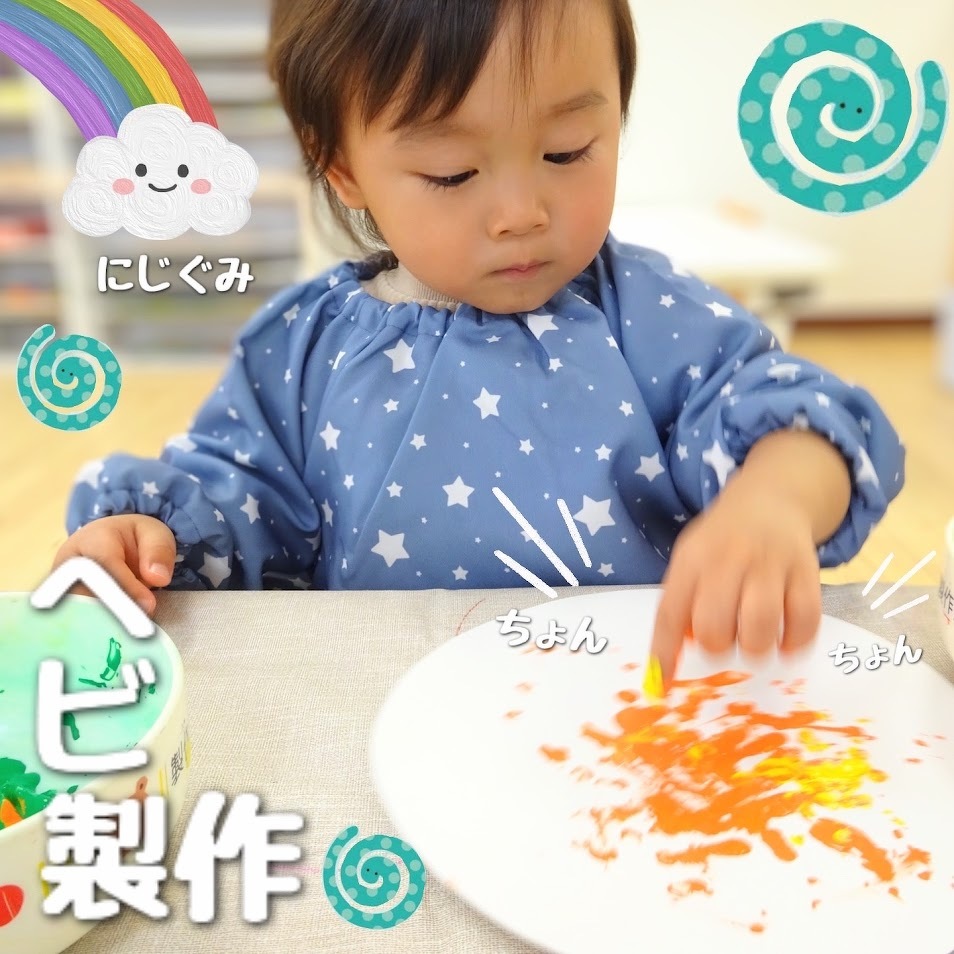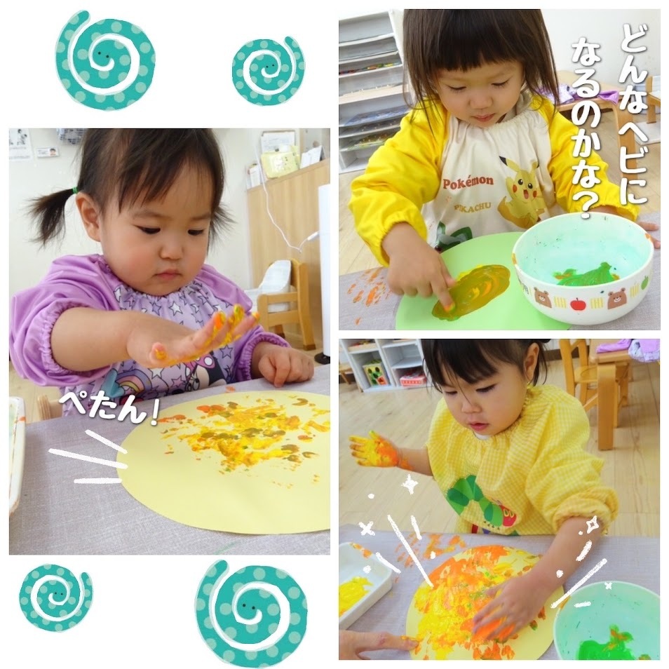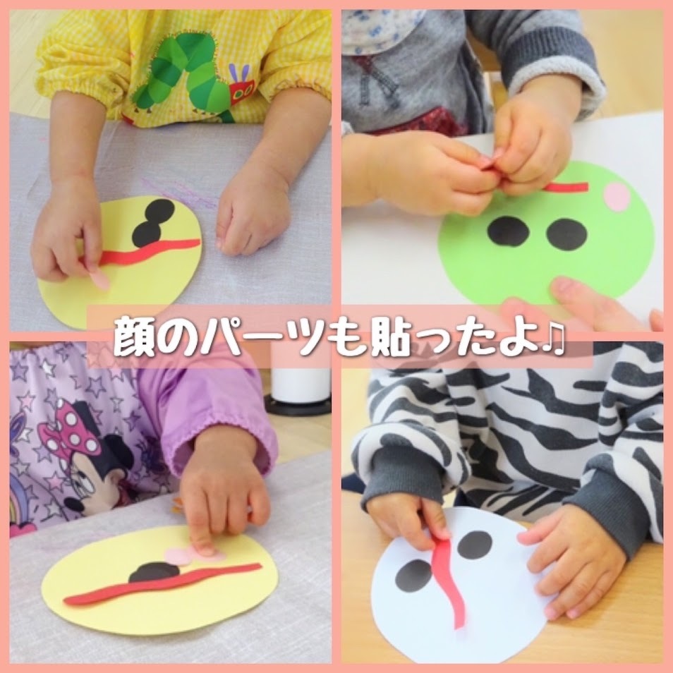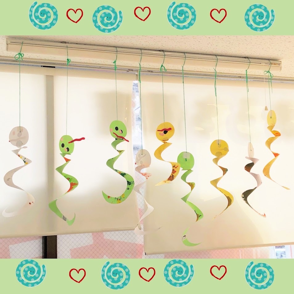 2025年01月31日(金) スタッフブログ にじぐみ/ヘビ製作 にじぐみで今年の干支であるヘビの製作を しました(^o^) ヘビの体となる画用紙に好きな色の絵の具を 指先や手のひら、タンポを使って模様を つけます♫ 別の画用紙には目や舌などの顔のパーツを 貼り付けました(^^)♪ 天井からつるして飾ると、くるくると回る 可愛らしいヘビの完成です☆彡