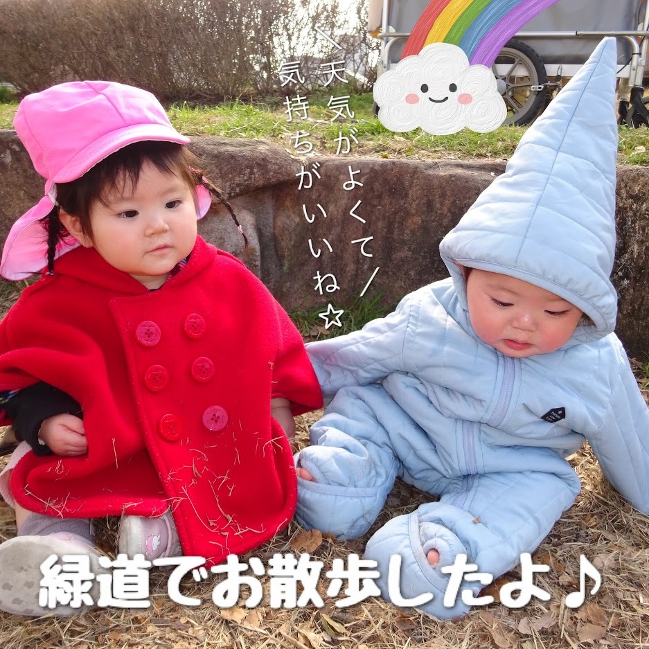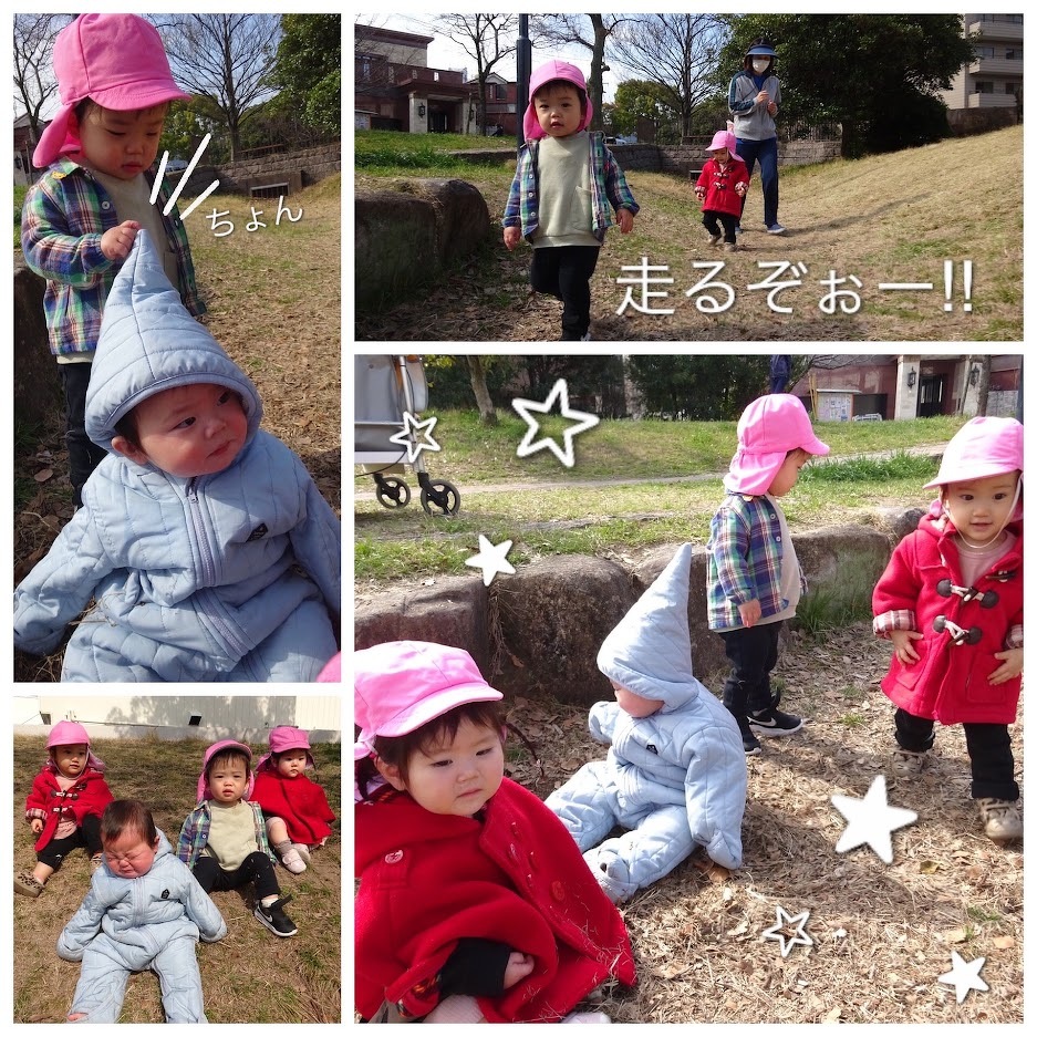 2023年03月09日(木) スタッフブログ にじぐみ/お散歩 3月に入り、日中は過ごしやすい日が増えてきましたね(^o^) 天気のよい日に近くの緑道へお散歩に行きました♪ 低月齢の子どもたちは芝生に座り、歩行がしっかりしてきた子どもたちは歩いたり走って体を動かし、外の空気に触れながらそれぞれの楽しみ方で過ごしました(^^)☆