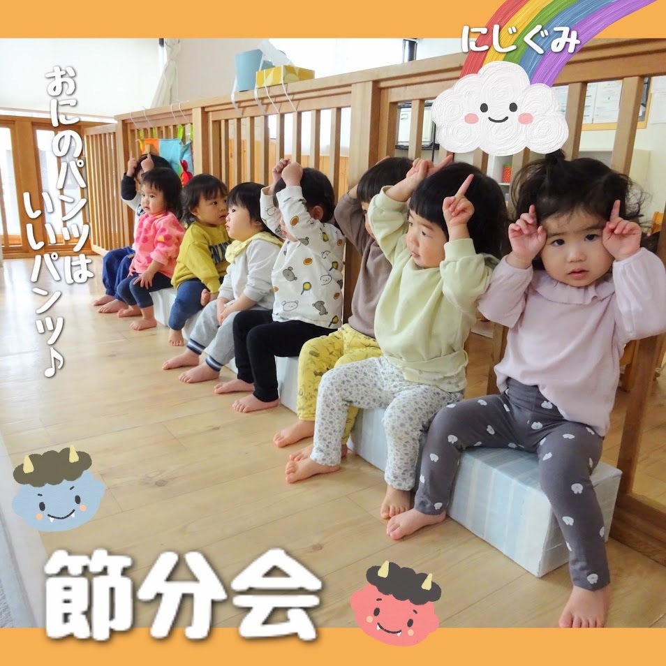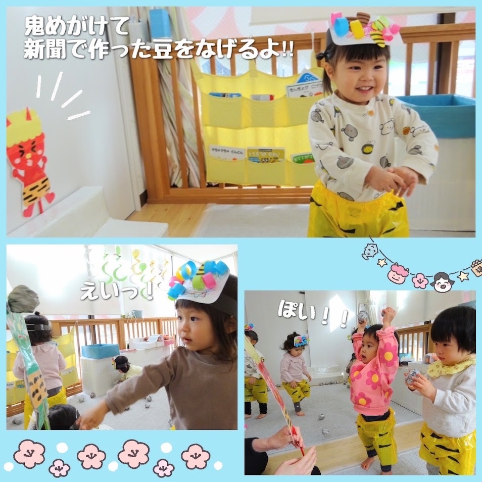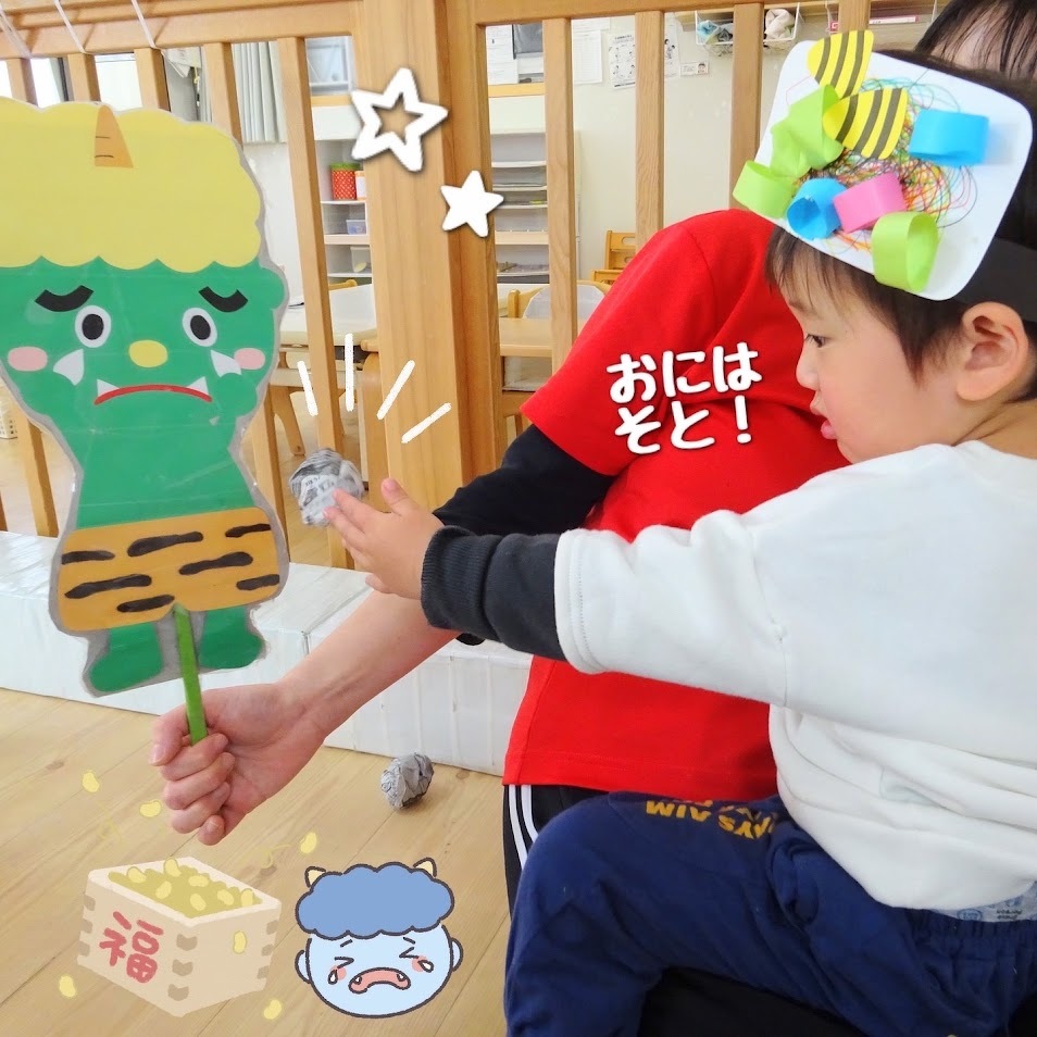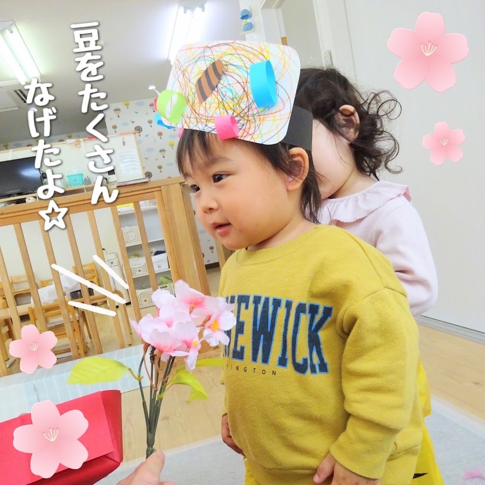 2025年02月10日(月) スタッフブログ にじぐみ/節分会 にじぐみの節分会の様子です(^o^) 子どもたちがリラックスして会に参加できる ように、歌をうたったり絵本を読んで節分会の 雰囲気づくり♫ 事前に作っていた鬼のお面をかぶり、いよいよ 鬼のイラストに向けて新聞で作った豆まき! 最初は遠慮気味に投げていましたが、時間が 経つにつれて積極的に投げていました☆ 福の神が登場し、紙吹雪や桜の花を見せて もらいみんなもニッコリ笑顔(^^)♪ 楽しい節分会でした!