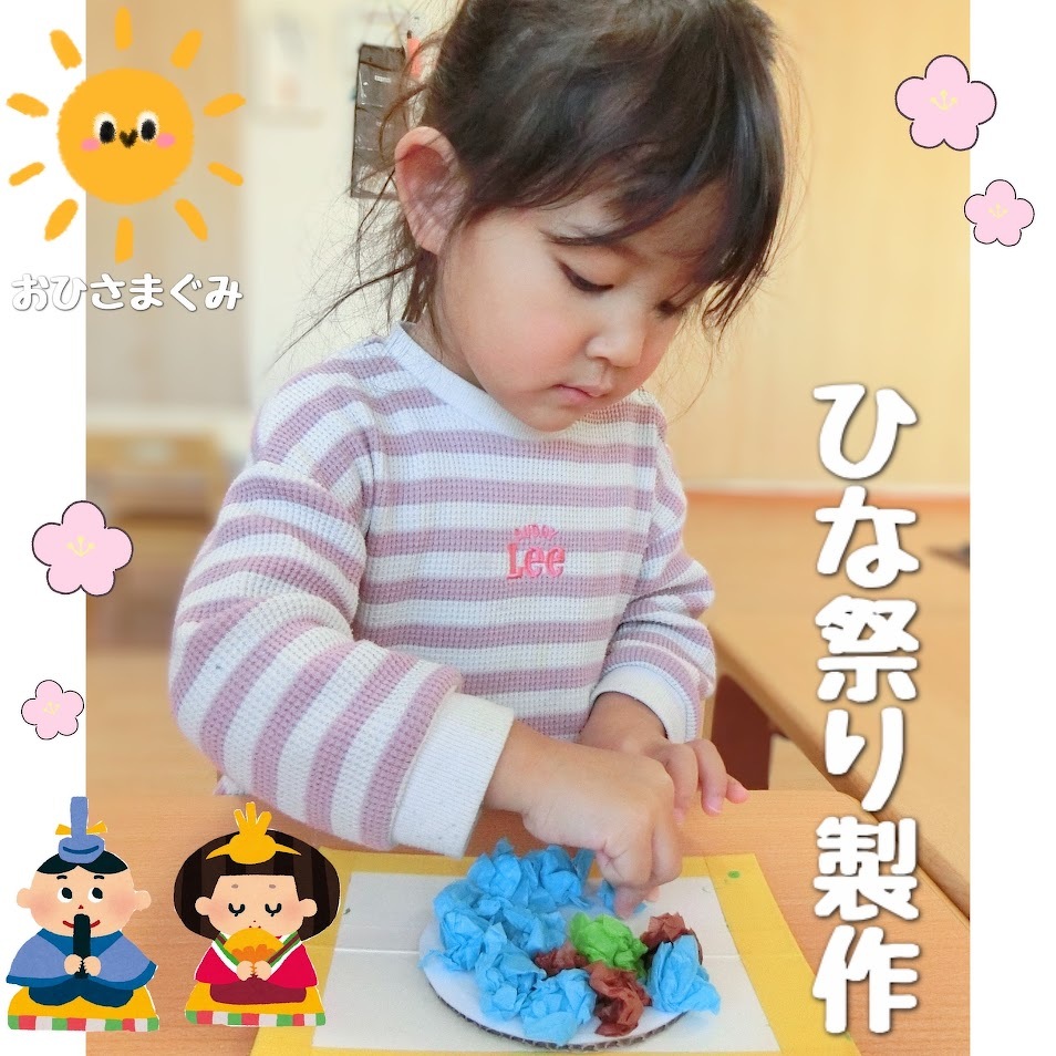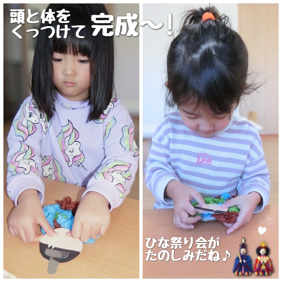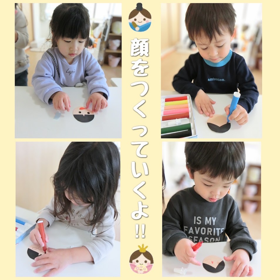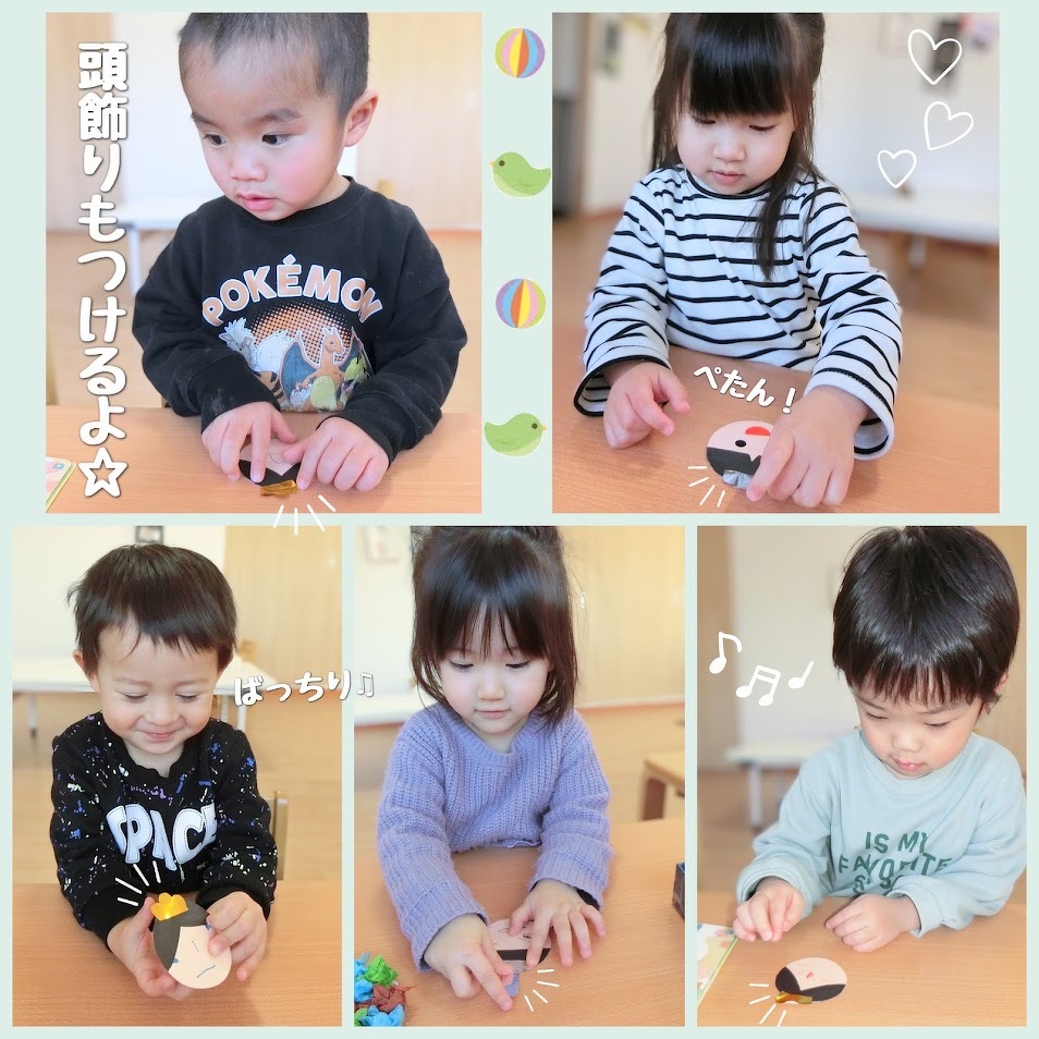 2025年02月26日(水) スタッフブログ おひさまぐみ/ひな祭り製作 おひさまぐみのみんなでひな祭りの製作を しました(^o^) まずはシールやペンを使って、お内裏様と お雛様の顔作りに挑戦! 表情豊かな顔ができました♫ お内裏様の体は花紙を丸めて台紙に貼り付け お雛様の体は台紙の穴に毛糸を通して作り ました☆彡 頭飾りも忘れずに!ぺたん! 顔と体をくっつけて、完成~(^^)♪ 完成品はひな祭り会の時にご紹介しますね★