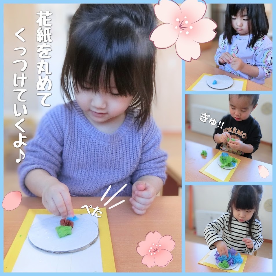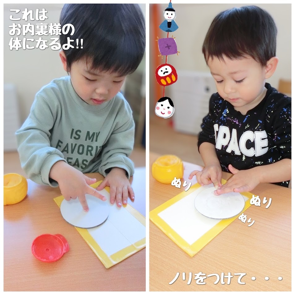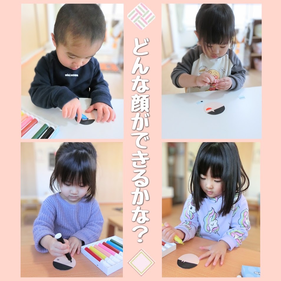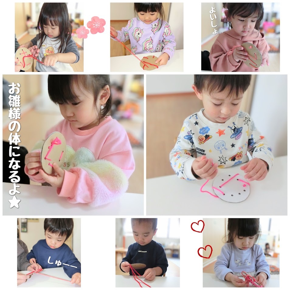 2025年02月26日(水) スタッフブログ おひさまぐみ/ひな祭り製作 おひさまぐみのみんなでひな祭りの製作を しました(^o^) まずはシールやペンを使って、お内裏様と お雛様の顔作りに挑戦! 表情豊かな顔ができました♫ お内裏様の体は花紙を丸めて台紙に貼り付け お雛様の体は台紙の穴に毛糸を通して作り ました☆彡 頭飾りも忘れずに!ぺたん! 顔と体をくっつけて、完成~(^^)♪ 完成品はひな祭り会の時にご紹介しますね★