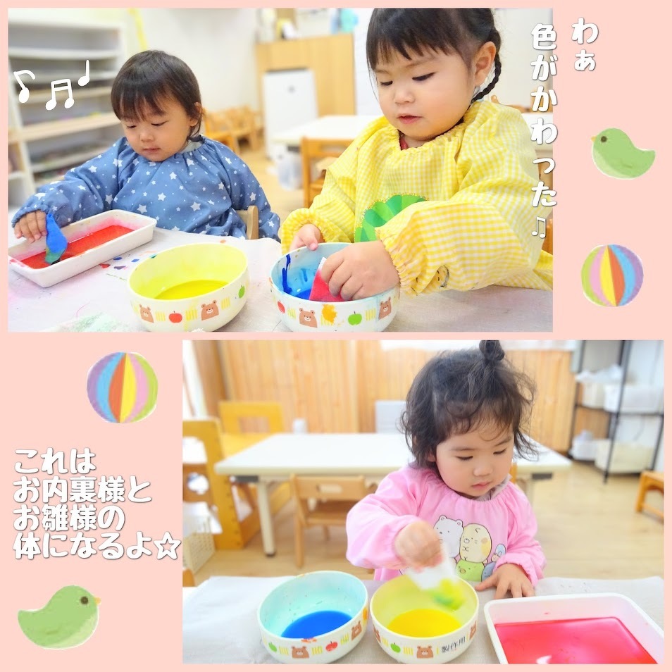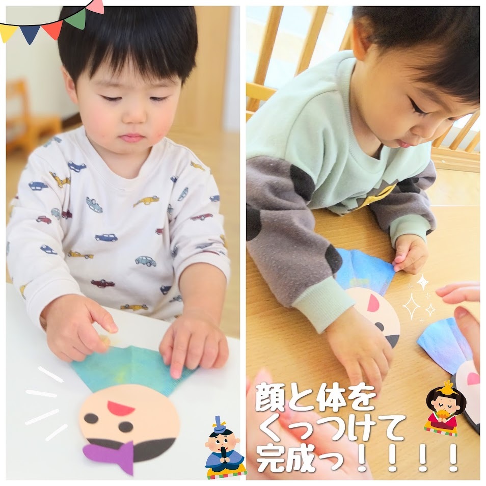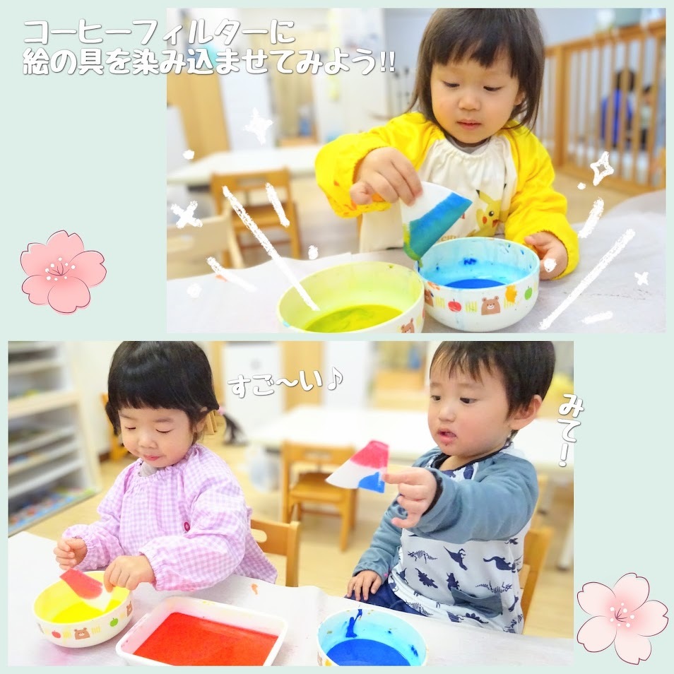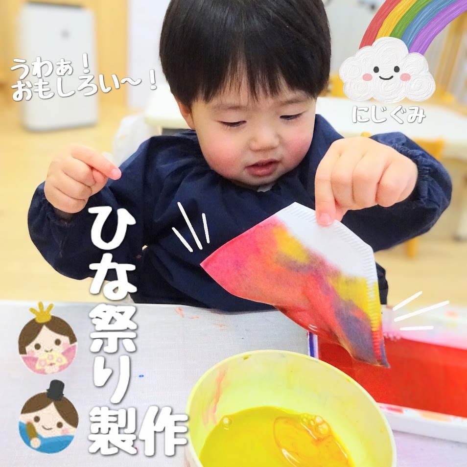 2025年02月28日(金) スタッフブログ にじぐみ/ひな祭り製作 にじぐみのみんなでひな祭りにむけて製作を しました(^o^) コーヒーフィルターに絵の具を染み込ませて 色をつけていきます☆彡 いくつか色を染み込ませ、色が混ざっていく 様子を楽しそうにしている子どもたち♫ 目や口のシールを貼って、お内裏様とお雛様の お顔も作りました(^^)♪ どんなお内裏様とお雛様が できたのでしょうか?! ひな祭り会の様子とあわせて、ご紹介したいと 思っていますので…お楽しみに(^_-)-☆
