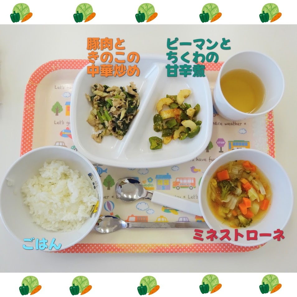 この日の給食のメニューは ・豚肉ときのこの中華炒め ・ピーマンとちくわの甘辛煮 ・ミネストローネ ・ごはん でした(^o^)♫