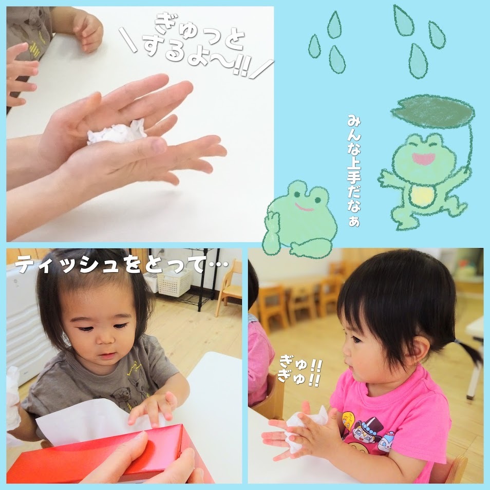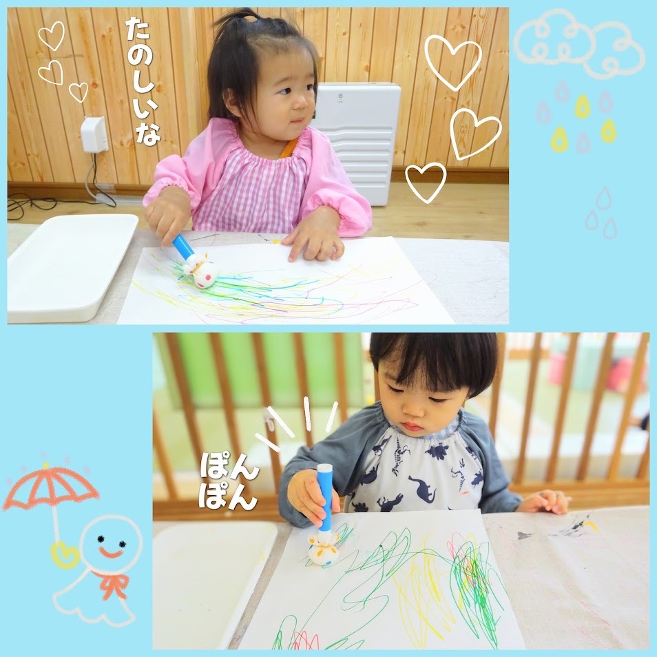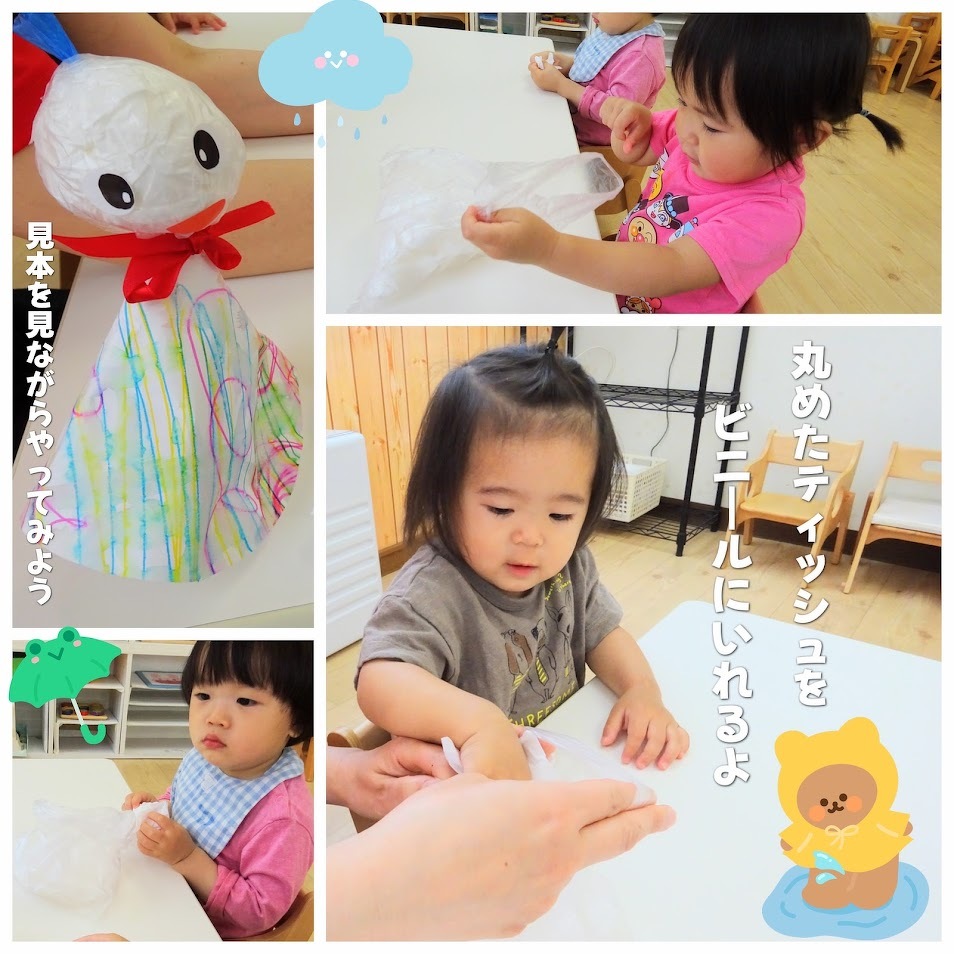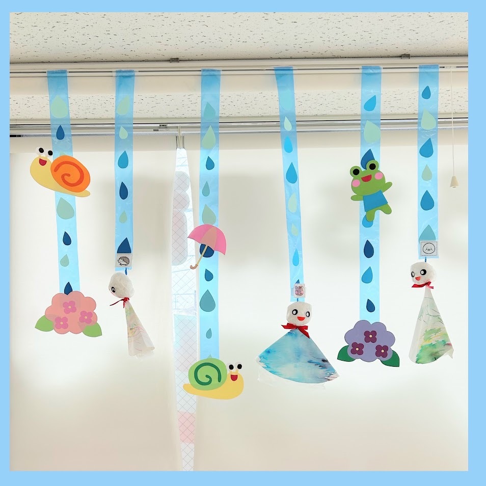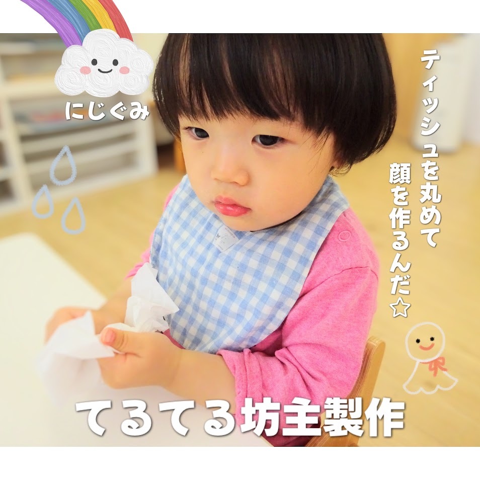 2025年06月03日(火) スタッフブログ にじぐみ/てるてる坊主製作 にじぐみのみんなで『てるてる坊主』を 作りました(^o^) まずはティッシュを丸めてビニールに入れ 顔を作ります♫ つぎに水性ペンでお絵描きをして、その後 水をつけたタンポでぽん!ぽん!ぽん! にじみ絵で体の部分が完成☆彡 雨の憂鬱な気分を吹き飛ばしてくれるほど 可愛らしいてるてる坊主ができました(^^)♪