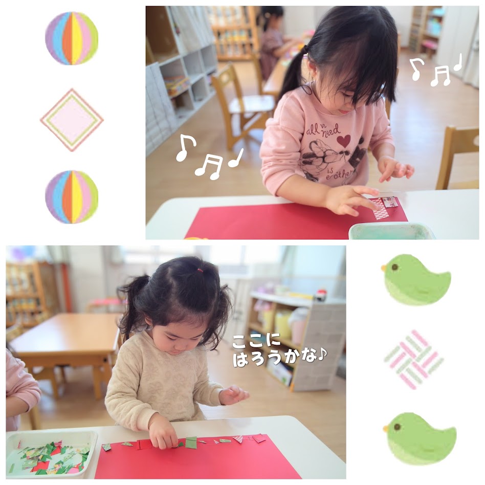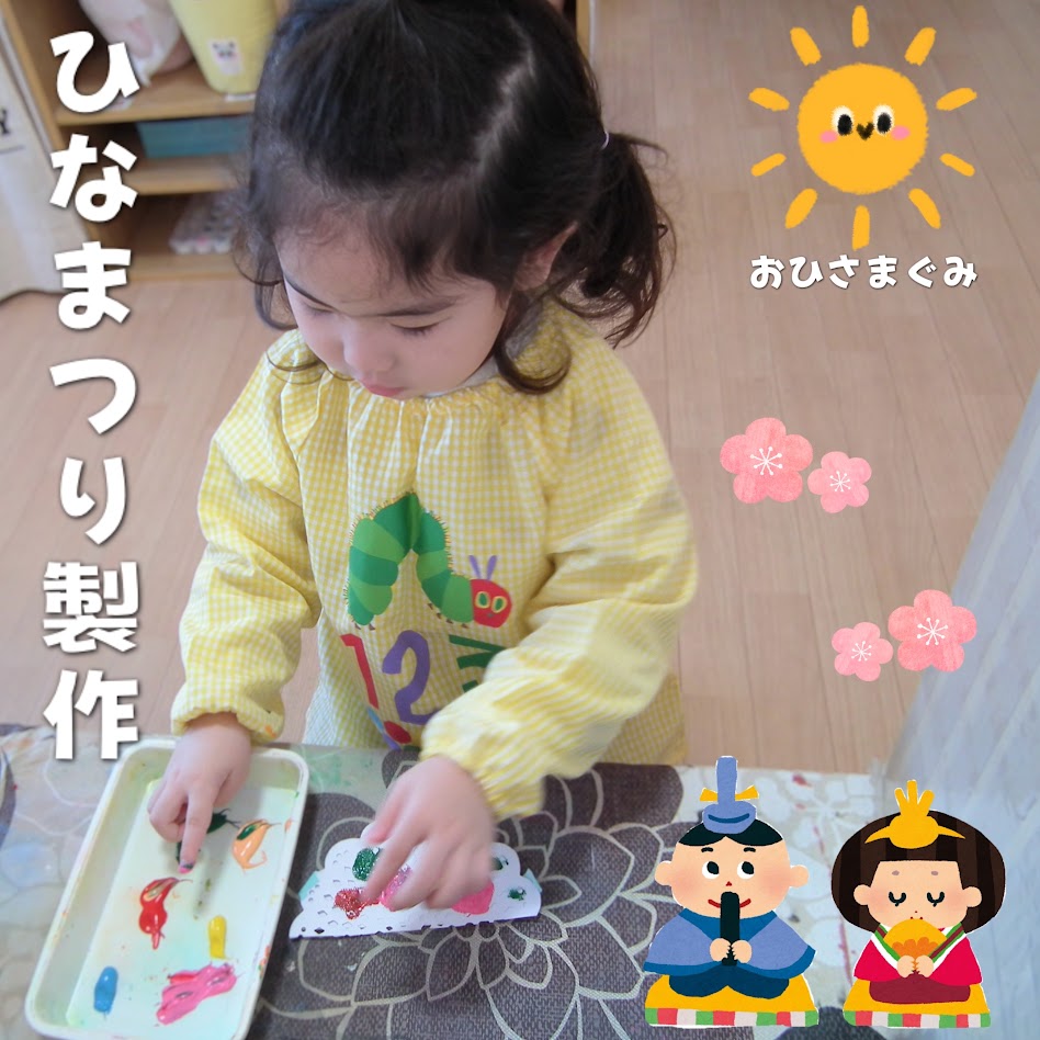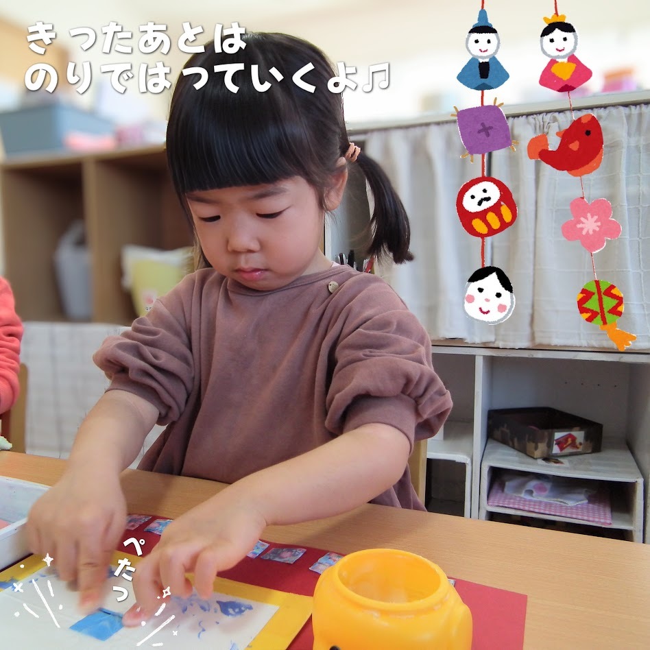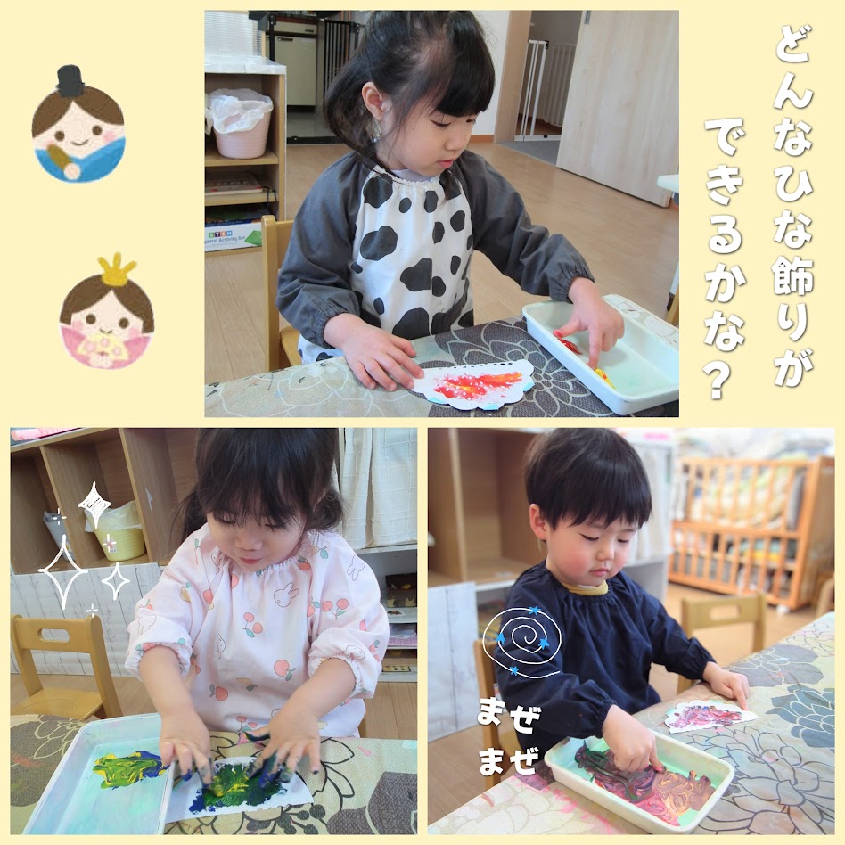 2026年02月25日(水) スタッフブログ おひさまぐみ/ひなまつり製作 おひさまぐみのみんなでひなまつりの 製作をしました(^_^) お内裏様とお雛様の身体部分は 好きな色の絵の具を選んで塗りました! はさみできった折り紙をのりで台紙に 貼り付けて・・・。 どんなお内裏様とお雛様が できあがるのでしょうか(^^♪ ひなまつり会でお披露目します☆