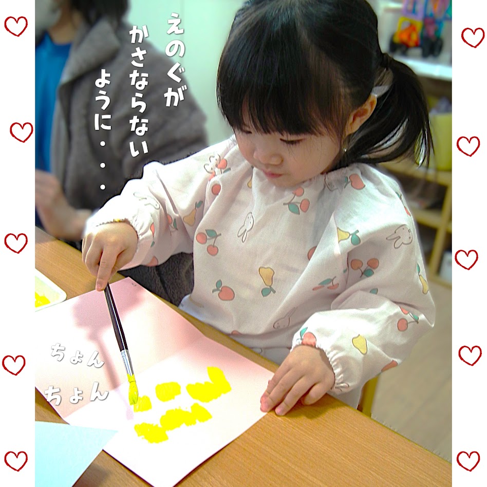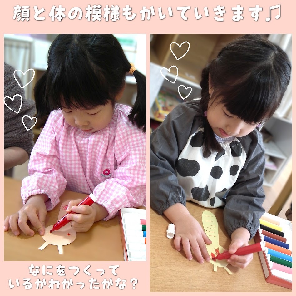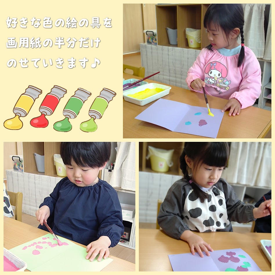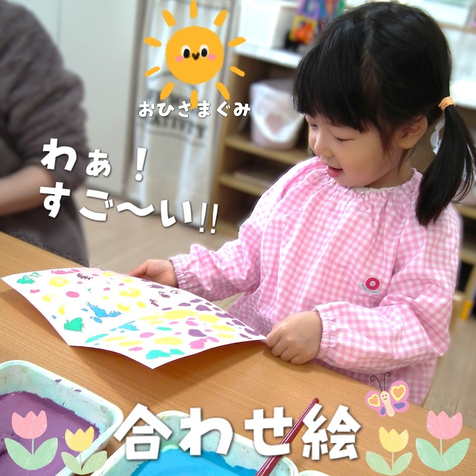 2026年03月27日(金) スタッフブログ おひさまぐみ/ちょうちょ製作 おひさまぐみで『ちょうちょ』を 製作した時の様子です(^_^) 画用紙に半分の折り目をつけ、 片側の面に絵の具をのせていきます! その画用紙を半分におり、ぎゅぎゅーと 上から押すと・・・ 何もなかった反対側の面に絵の具の模様が つきました☆ 「わぁ!すご~い!」とみんなビックリ♪ 春の訪れを感じる、可愛いちょうちょが 出来ました(^_-)-☆
