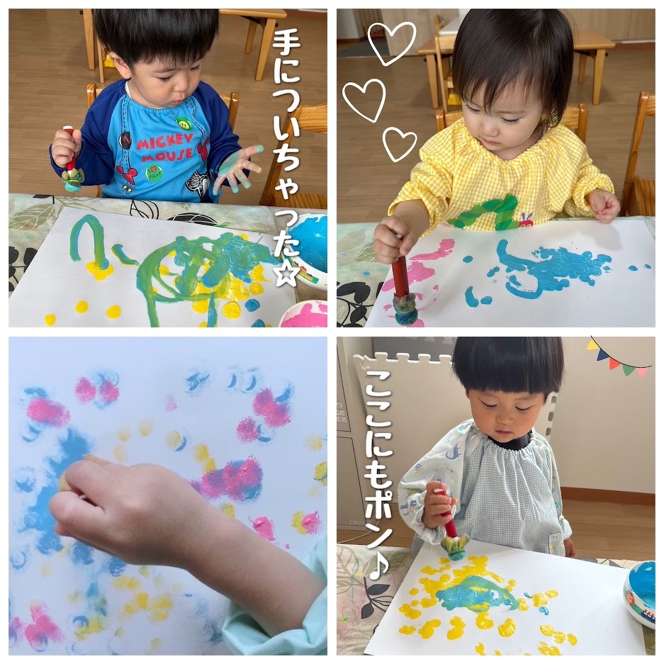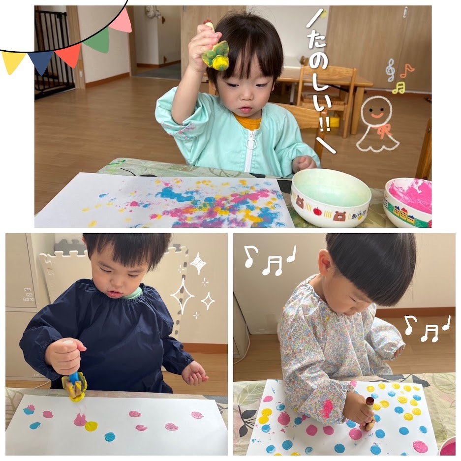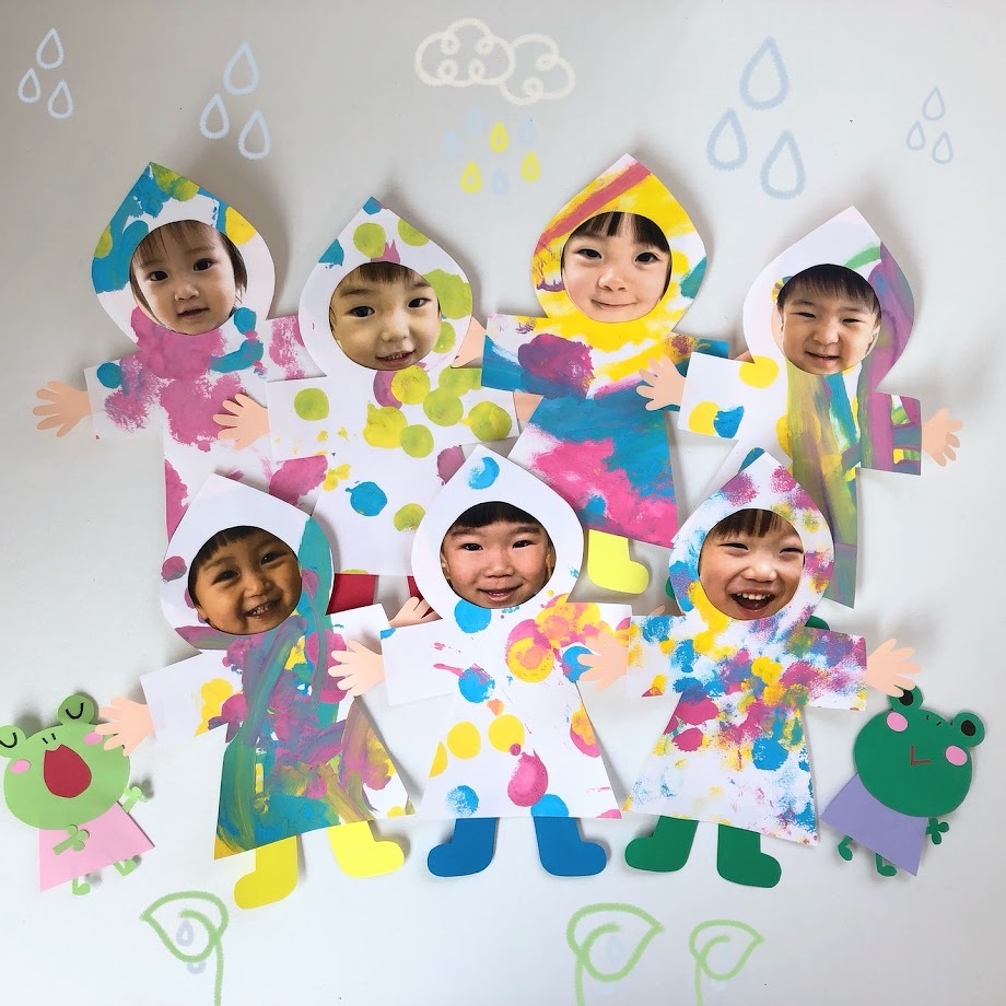 2023年06月20日(火) スタッフブログ おひさまぐみ/レインコート製作 梅雨に入り、雨の日が多くなりましたね((+_+)) 雨の日が楽しくなるような『レインコート』 を作りました♪ “たんぽ”に絵の具をつけて、画用紙にぽんぽん と押していきます(^o^) とても可愛いレインコートが出来ました☆彡
