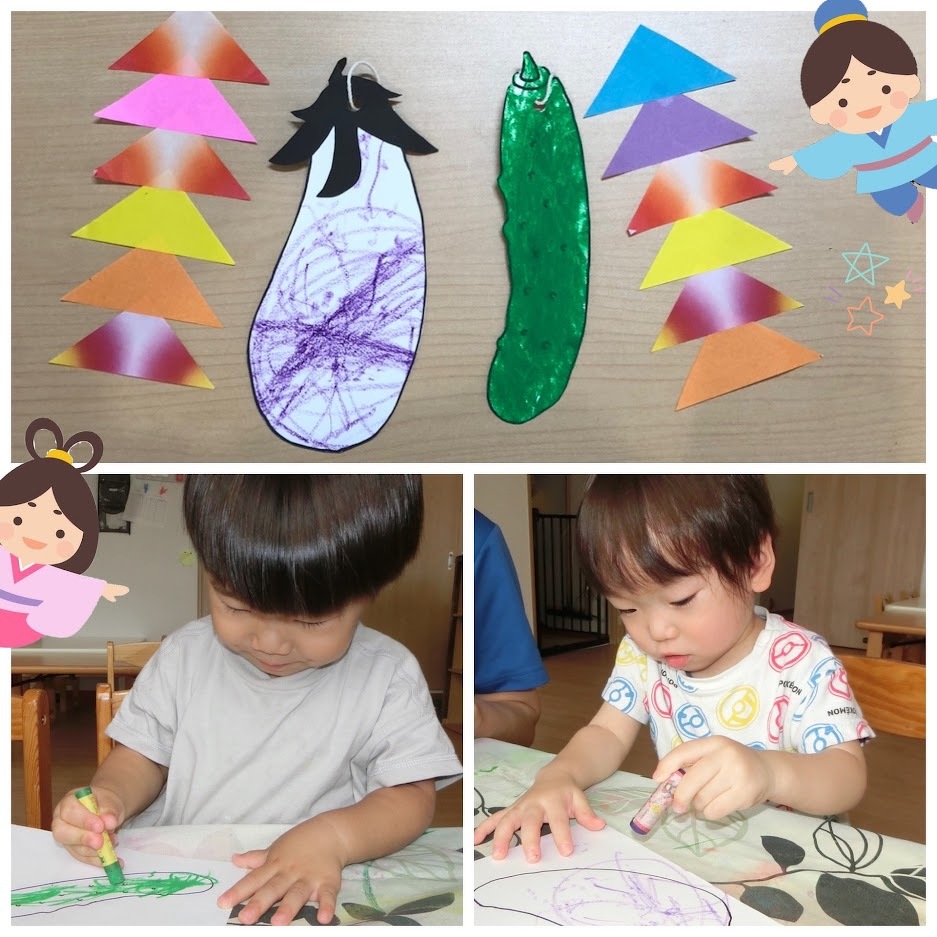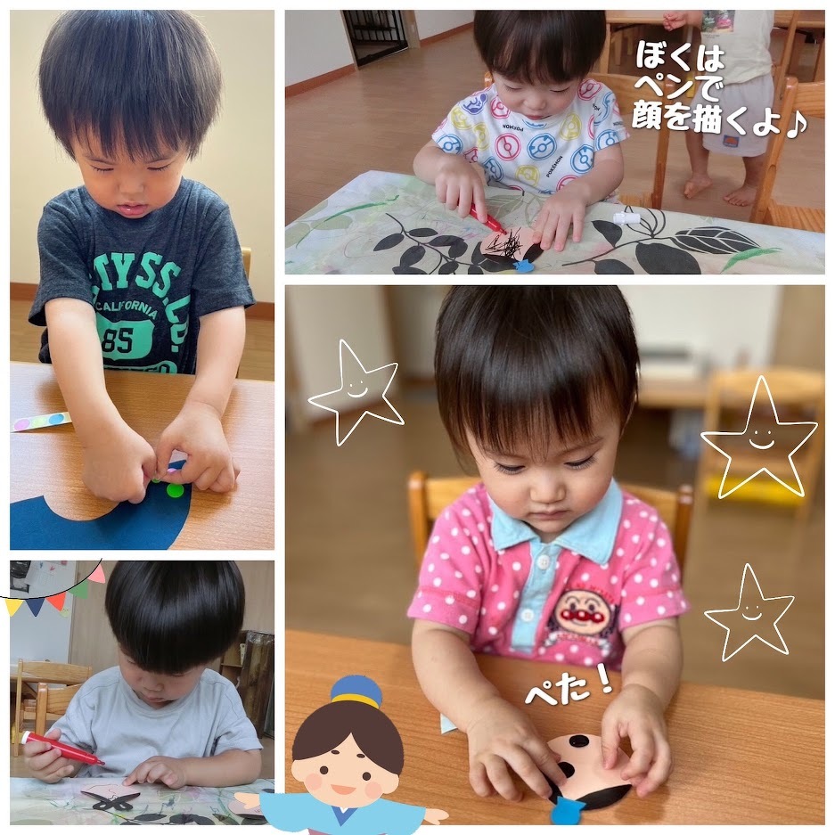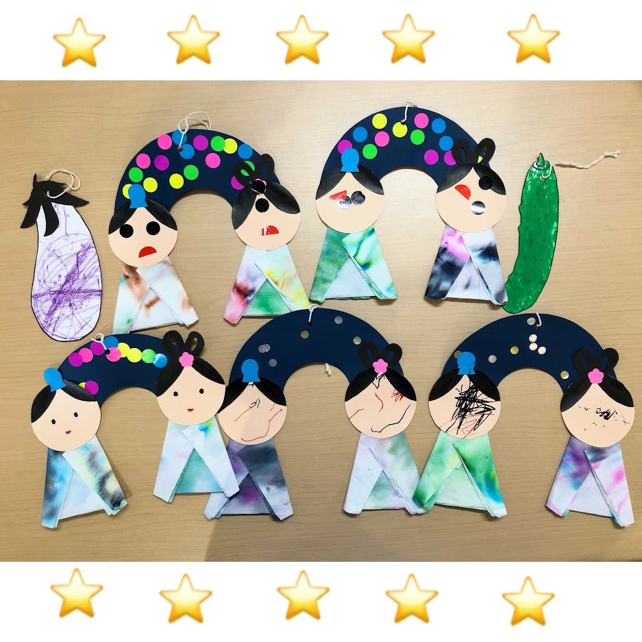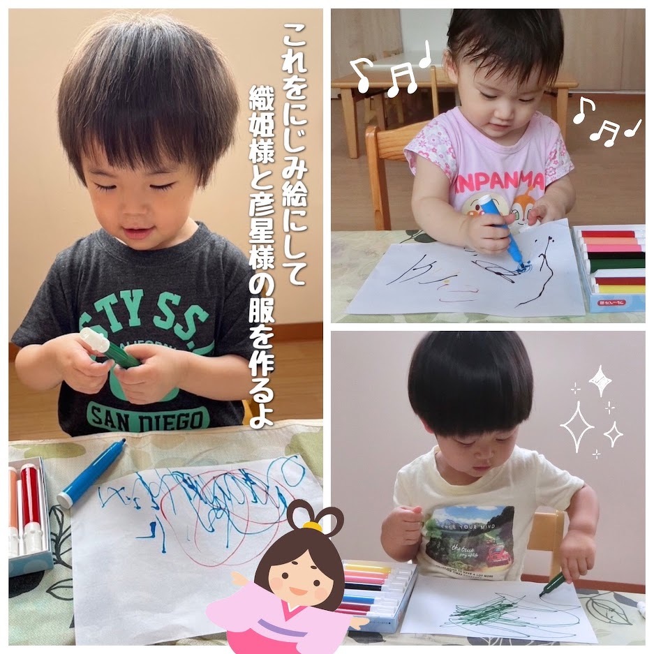 2023年07月05日(水) スタッフブログ おひさまぐみ/七夕飾り製作 7月7日の七夕にむけて、おひさまぐみの みんなで七夕飾りを作りました(^o^) 織姫様と彦星様のかおをシールやペンで 作ったり、半紙に水性ペンで自由に描いた あと“にじみ絵”にして服の模様を作りました。 みんなが作ったパーツを組み合わせると… とっても可愛い七夕飾りが完成☆彡