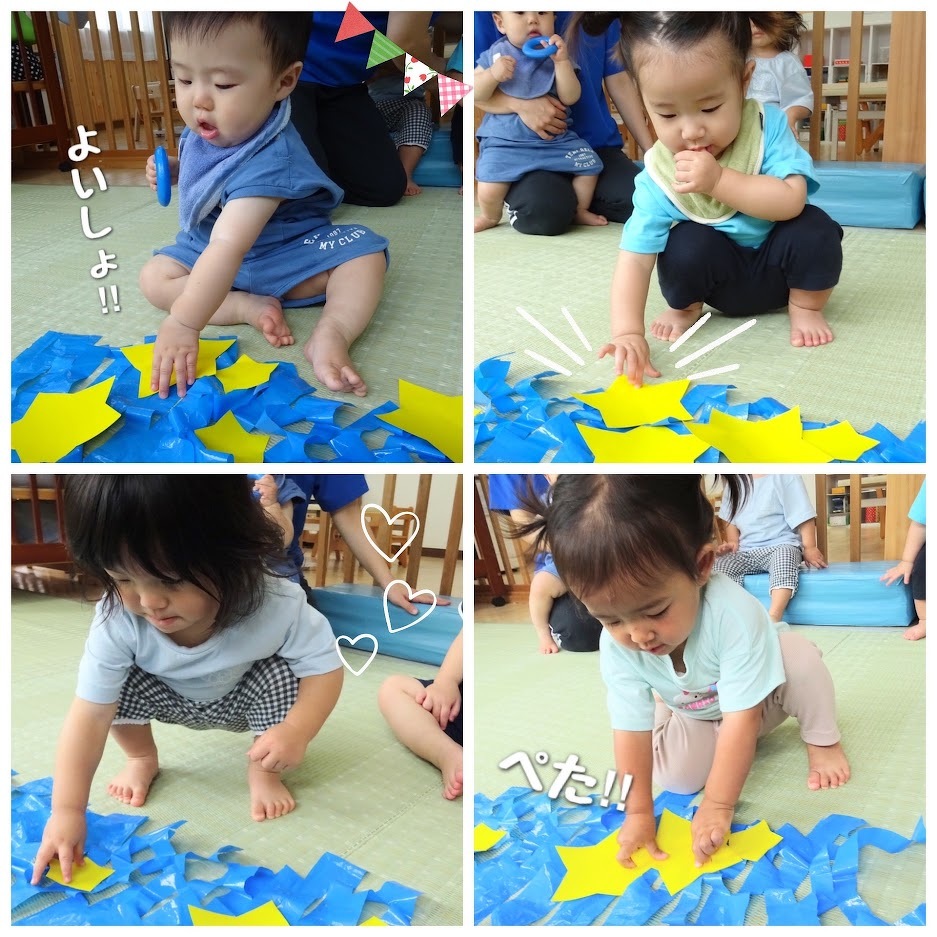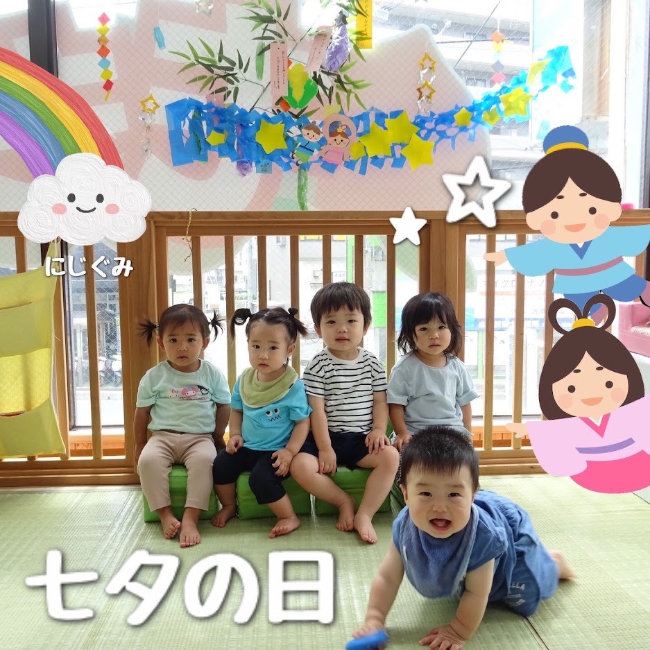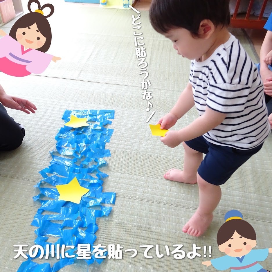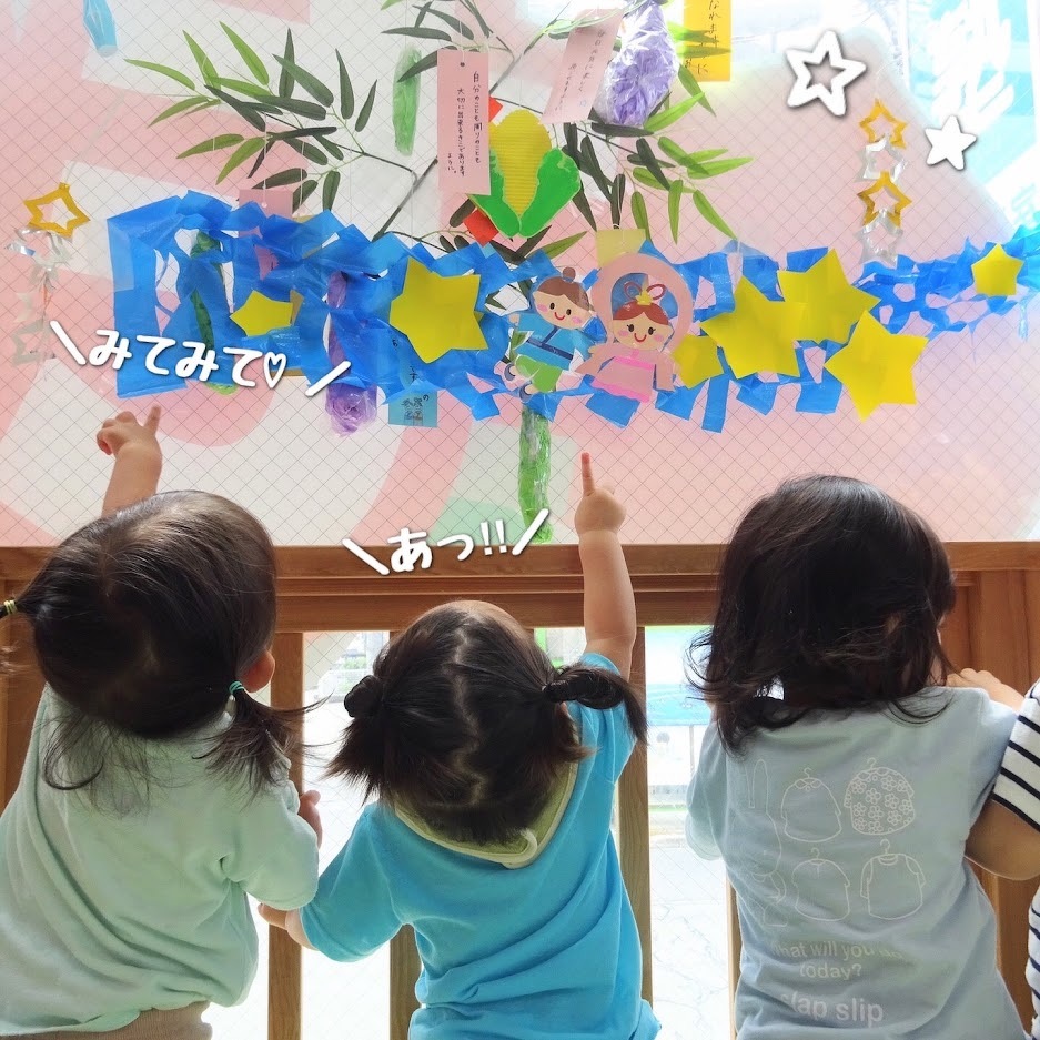 2023年07月11日(火) スタッフブログ にじぐみ/七夕当日☆彡 にじぐみの七夕の日の様子です(^o^) 青いビニールで作った天の川にみんなで星を 貼っていき、素敵な天の川が完成!! 先日飾りつけした笹と一緒に飾ると 「あ!!」と興味津々に見ていました♪ みんなの願いごとは届いたかなぁ(^^)?