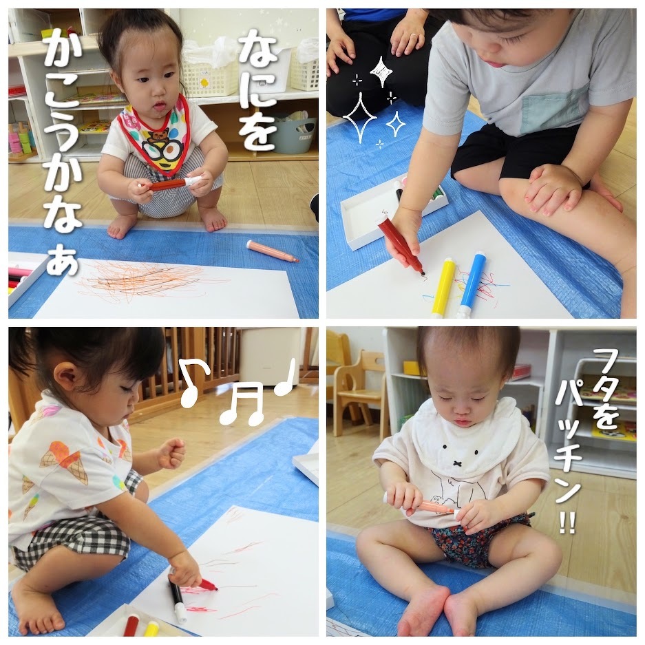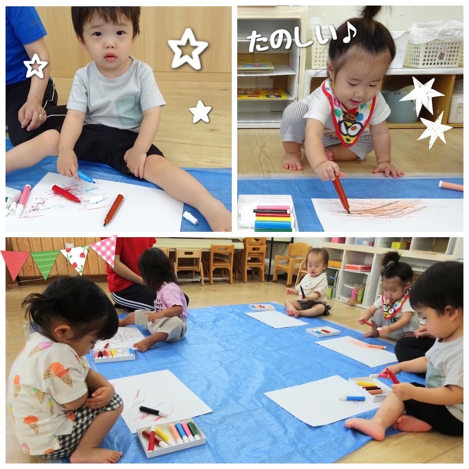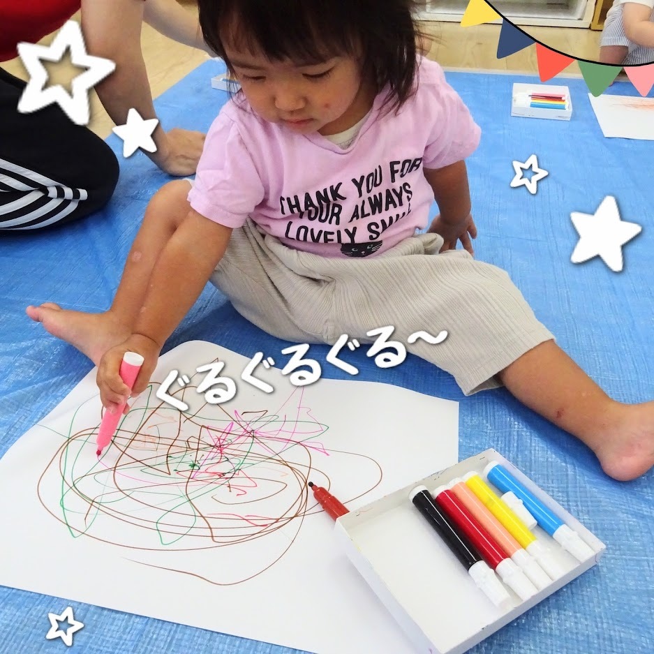 2023年08月08日(火) スタッフブログ にじぐみ/お絵描き にじぐみのみんなでお絵描きをしました♪ この日のお絵描きは机ではなく、床で挑戦! リラックスした状態で画用紙に描いていき ます(^o^) 次々にペンの色を変えて画用紙はカラフルな 作品となりました☆彡